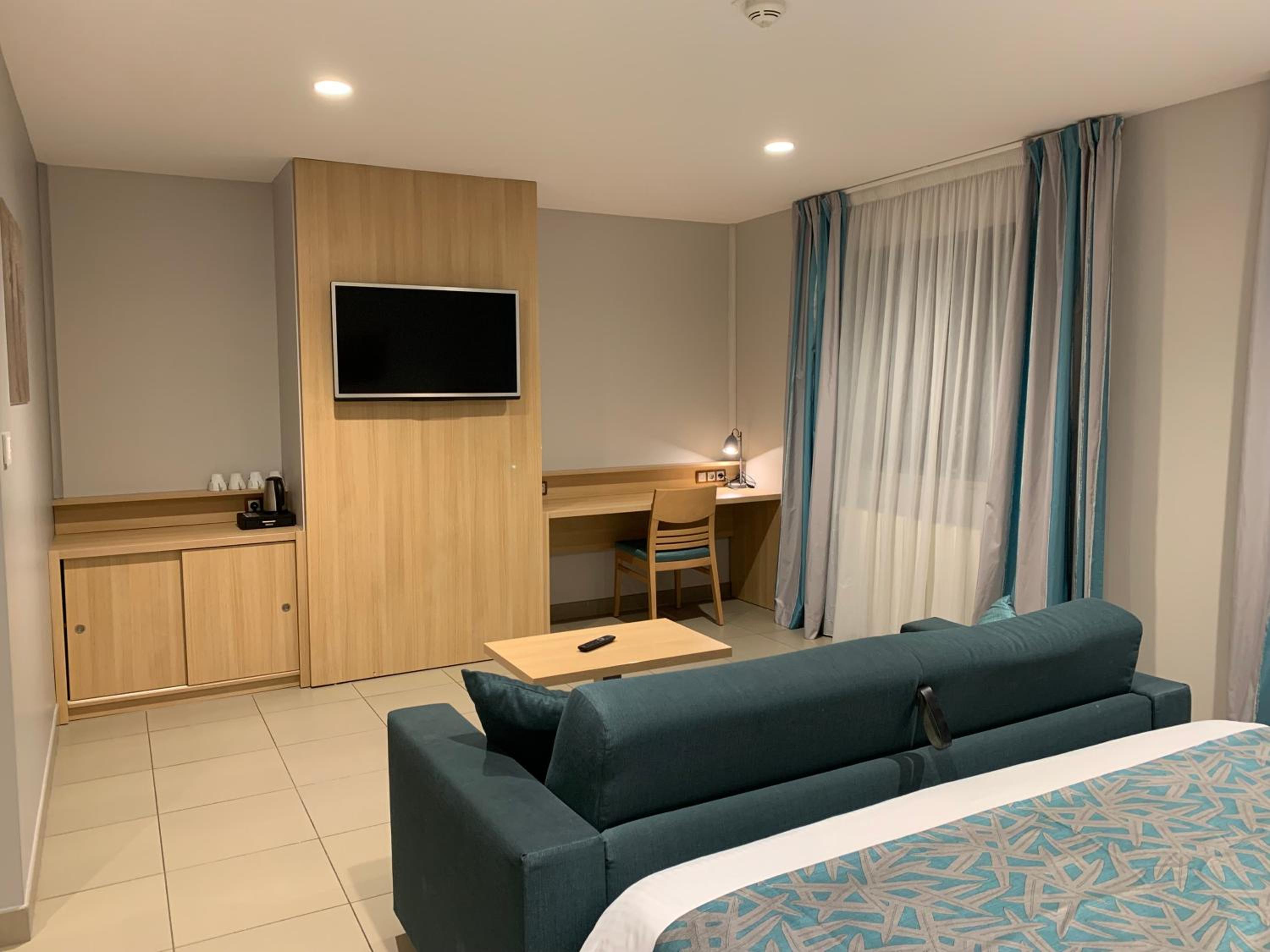 Each room is elegantly designed with contemporary flair, featuring an LCD TV, hot beverage facilities, and a hairdryer in the bathroom. Relax in style during your stay.