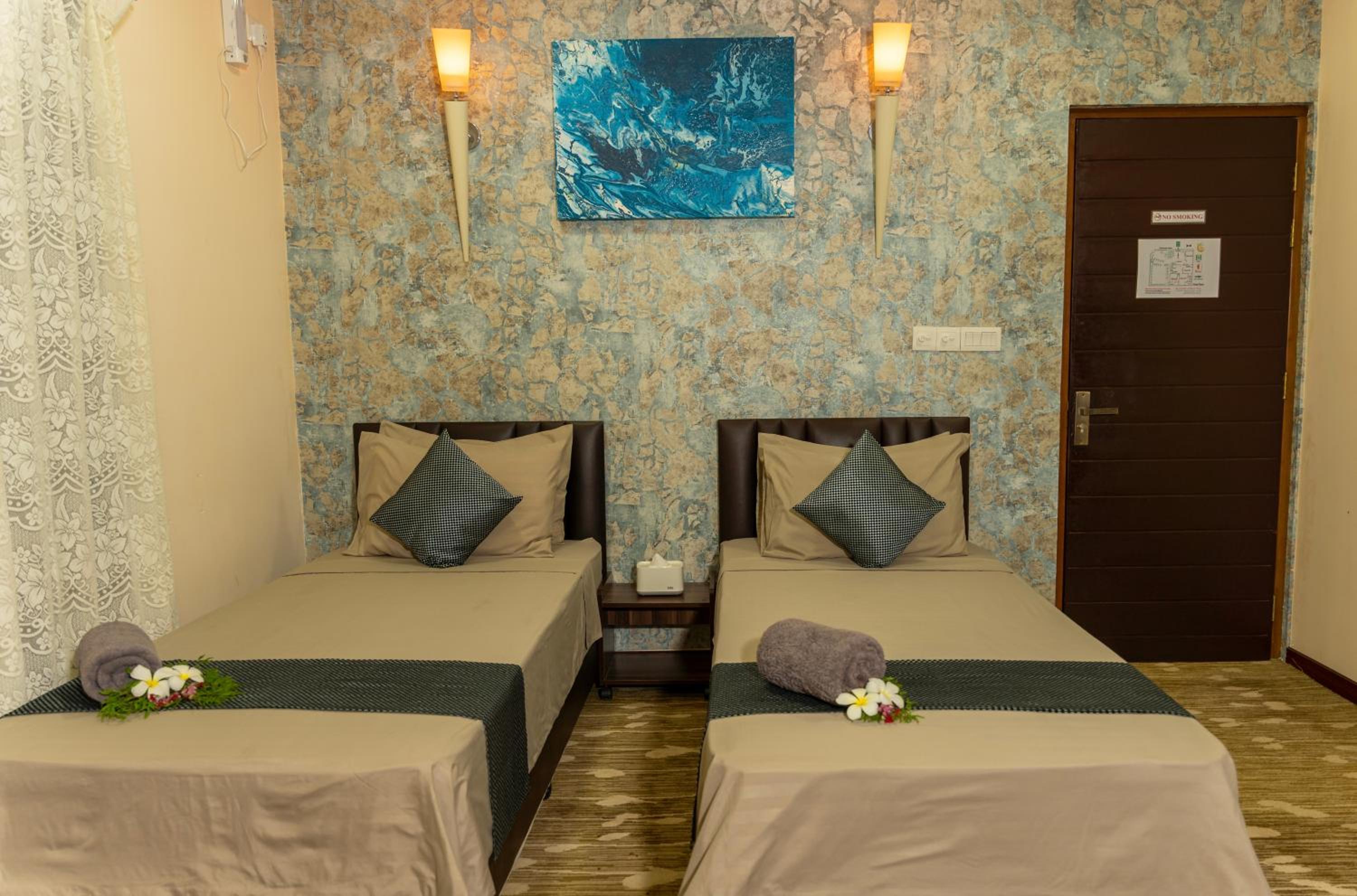 Pláž byla kousek od ubytování. Ubytování má krásnou zahradu poskytující stín a příjemné místo k odpočinku. Snídaně byly jednoduché, ale čerstvé a výborné, včetně vynikající místní speciality (kokos s tuňákem). Koupelna pokoje má částečně otevřený strop nad sprchou, což je příjemné.