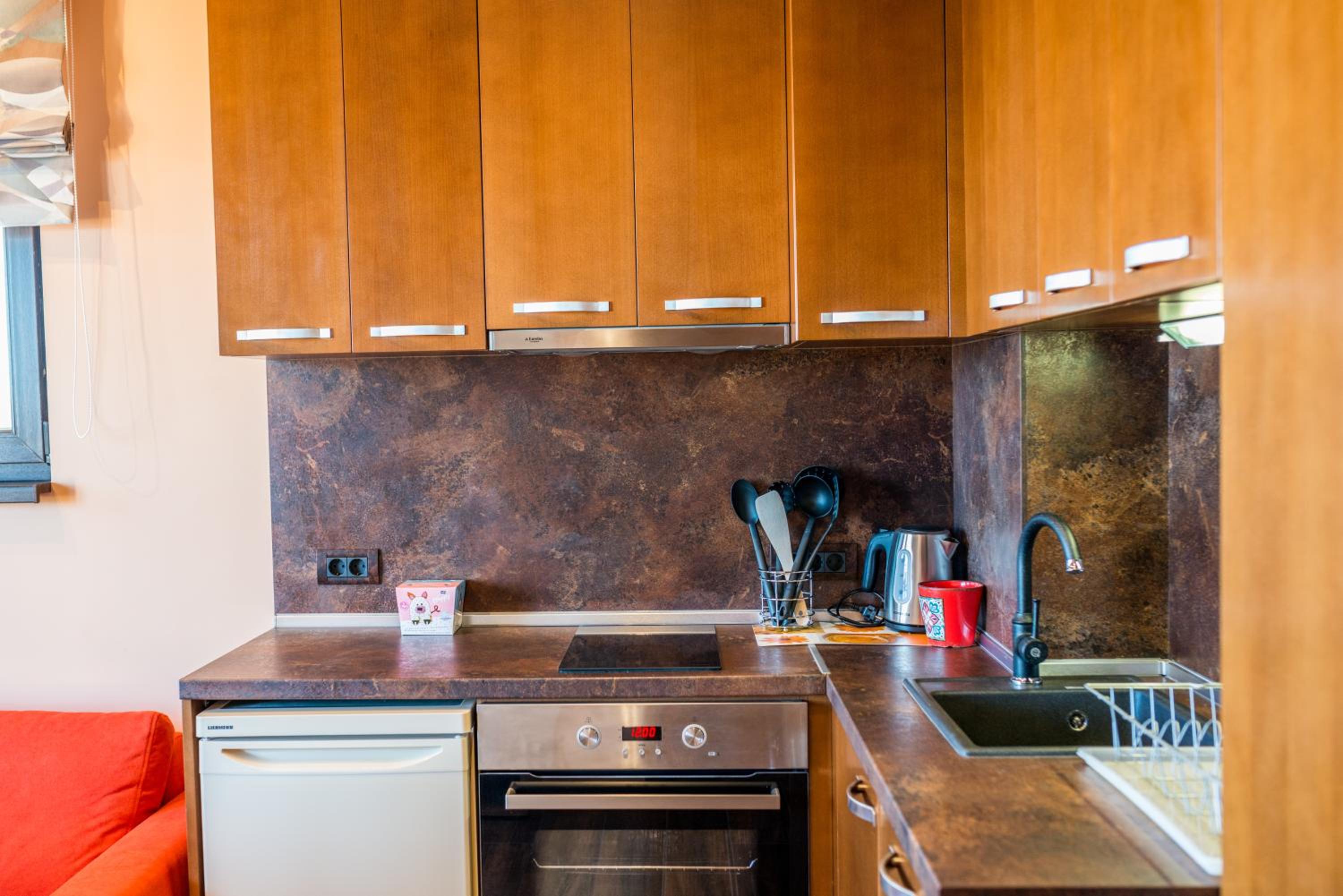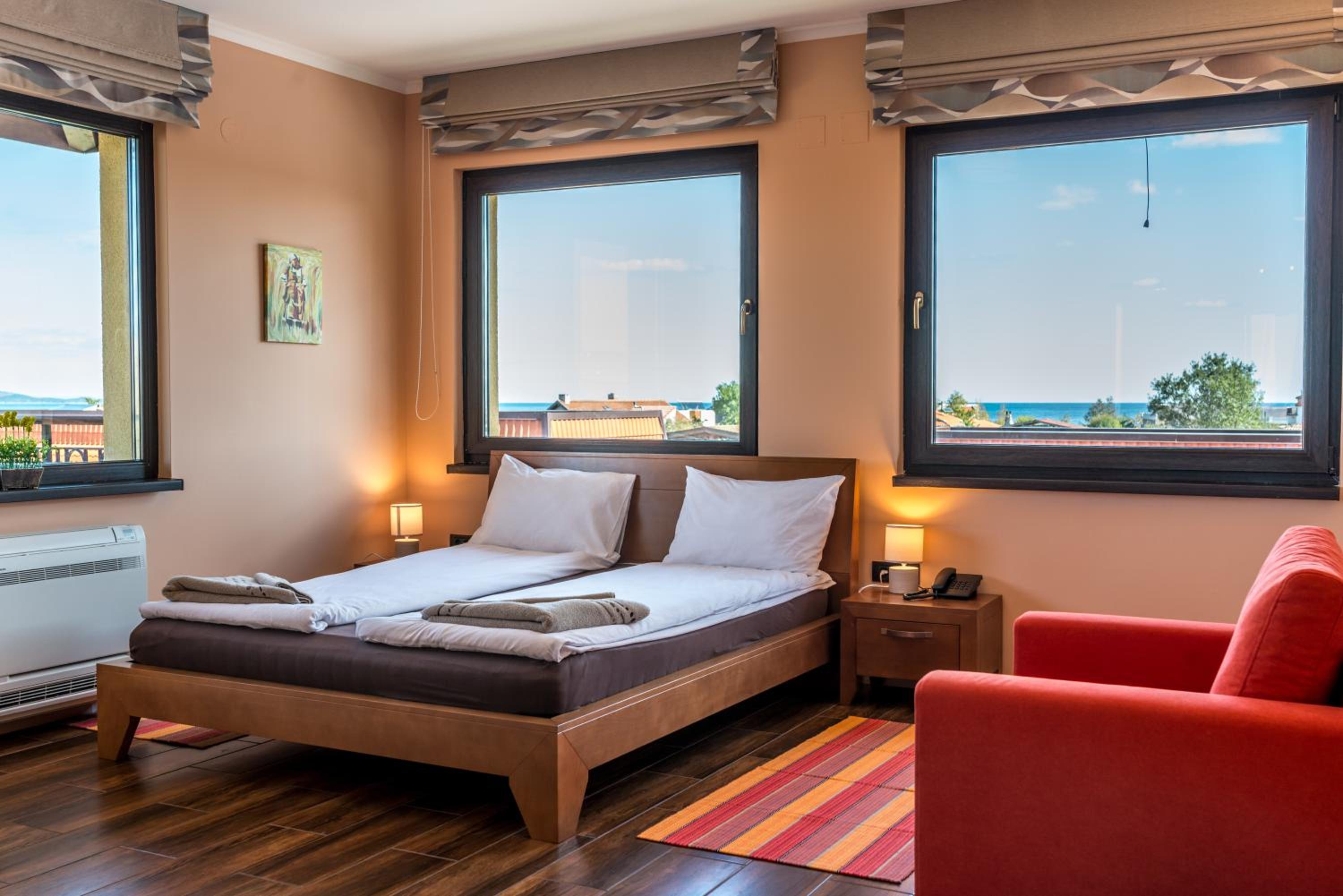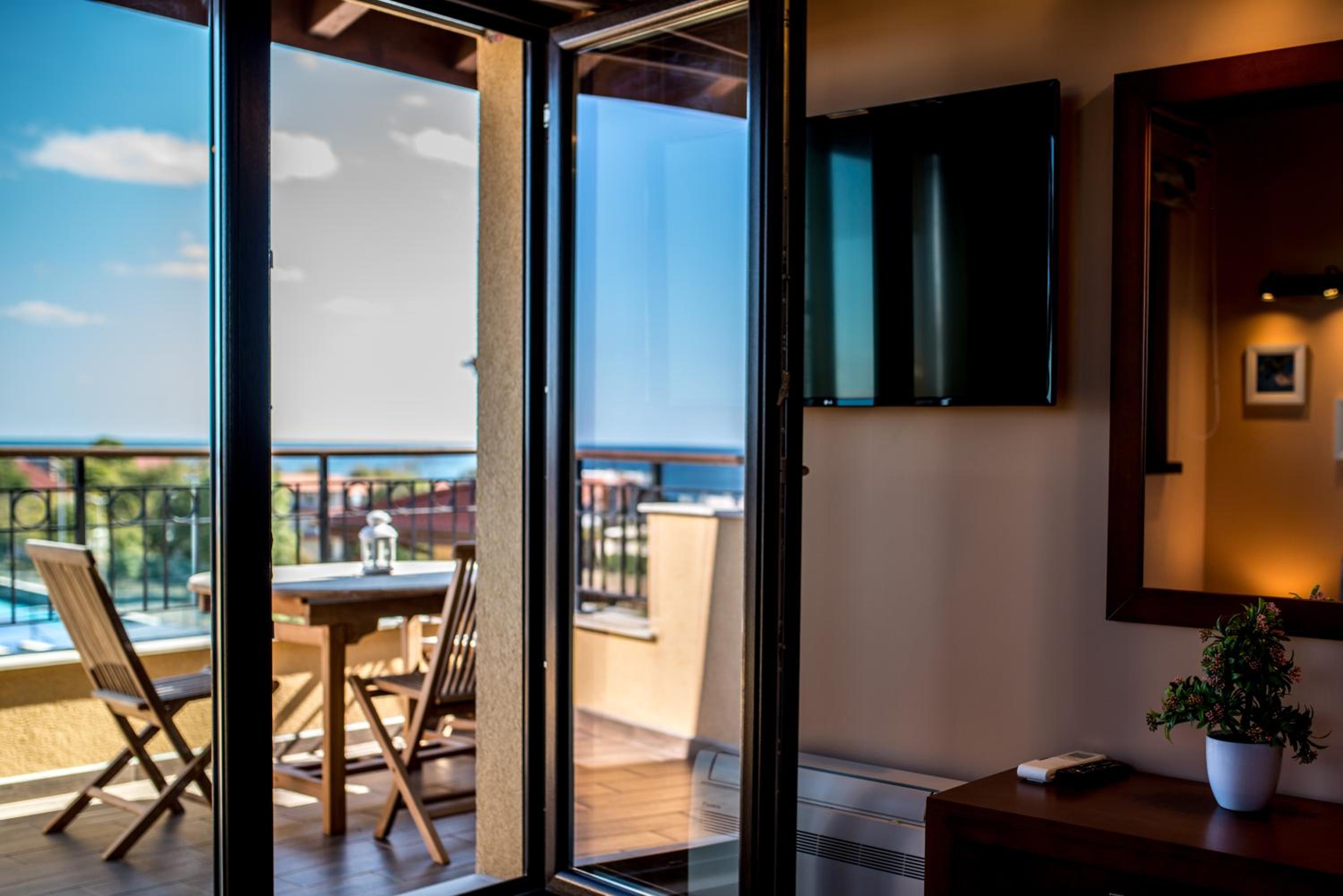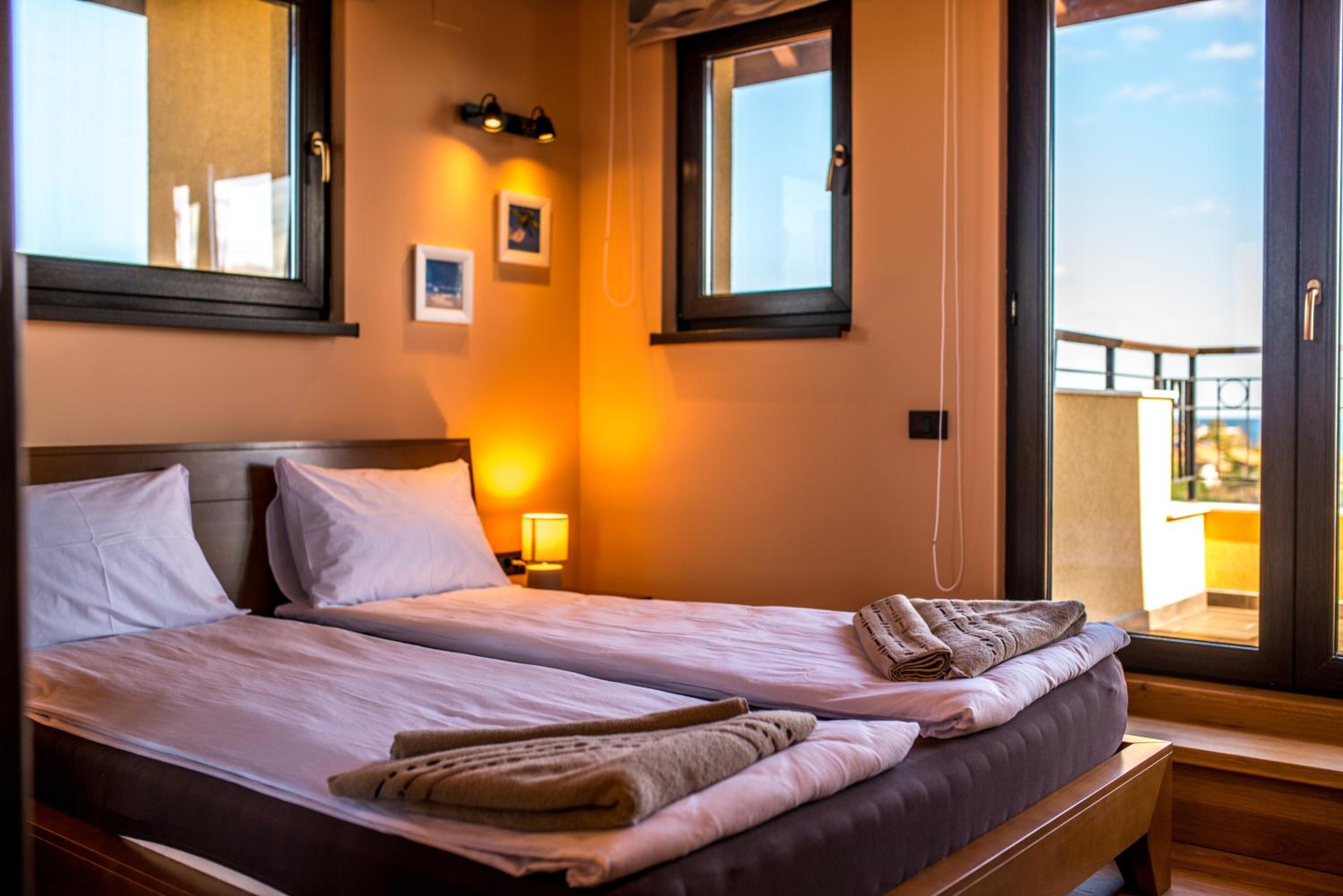 Villa EM offers air-conditioned rooms with modern amenities including a flat-screen TV, minibar, and private bathroom. Some rooms even feature a fully equipped kitchen and a terrace with sea views.