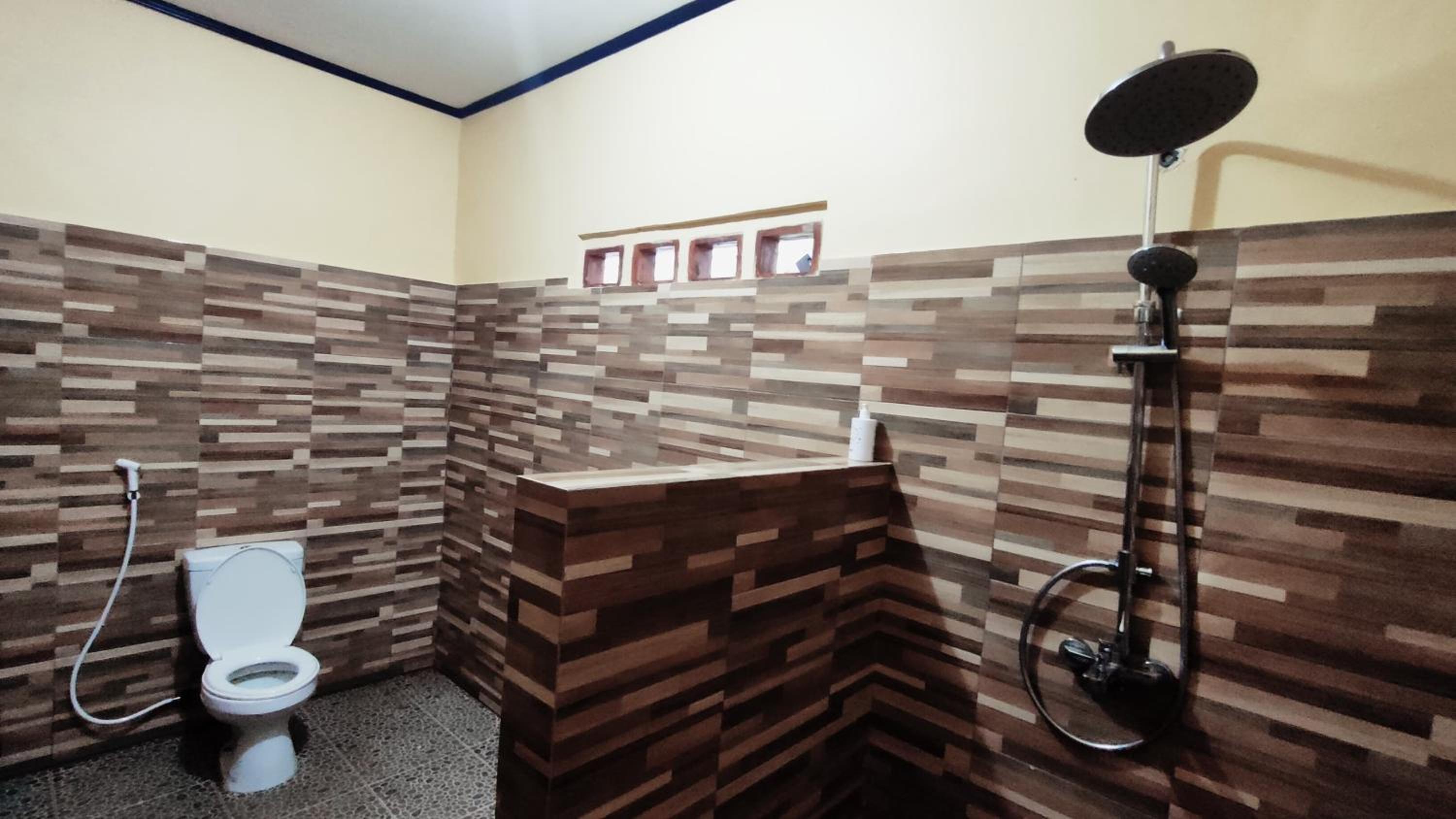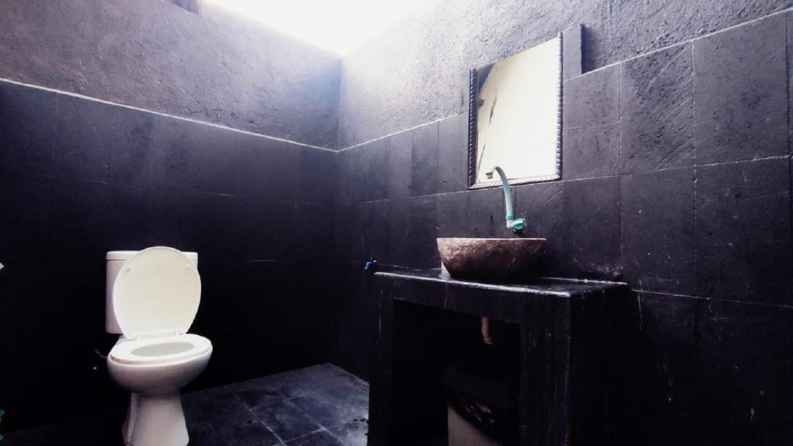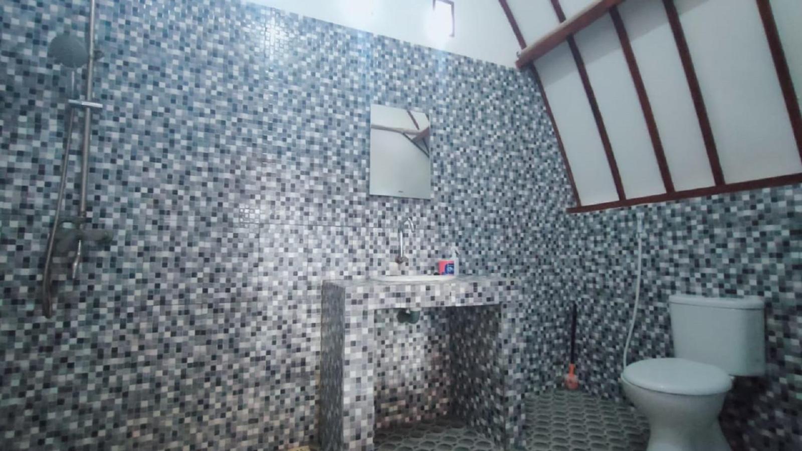 La salle de bain pas propre et la cuvette des WC vieillotte. L'emplacement de la chambre face à de la tôle. Pas de meuble de rangement.