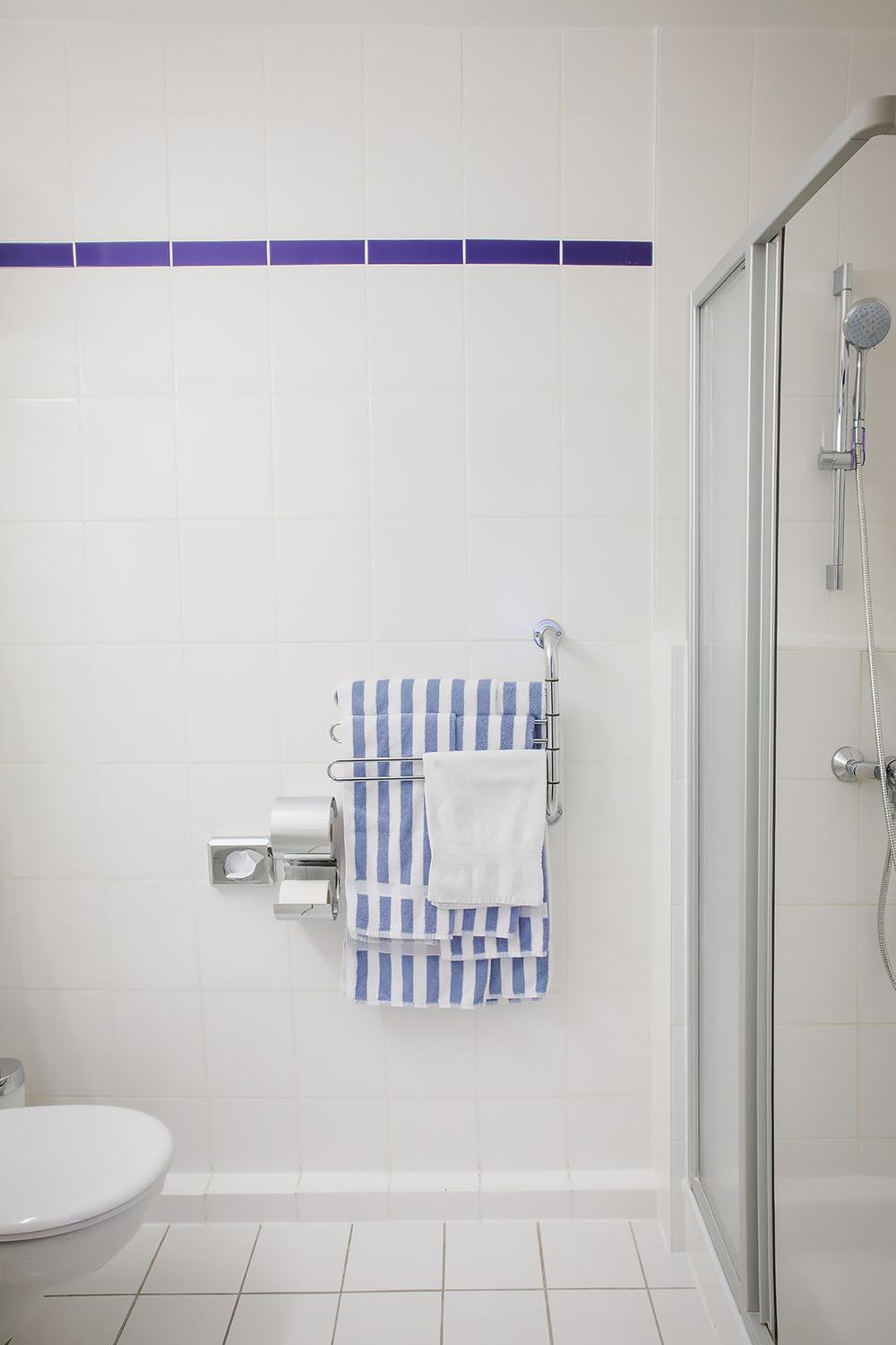 Das Bad ist klein und eng. Es ist etwas kalt im Bad. Es gibt dort keinen Heizkörper sondern einen Heizlüfter, der oben fixiert ist, bei der Lüftung. Der Heizlüfter ist eingeschaltet, wenn man den Stecker in die Steckdose einsteckt. Und er wird ausgeschaltet, wenn man den Stecker aus der Steckdose auszieht.