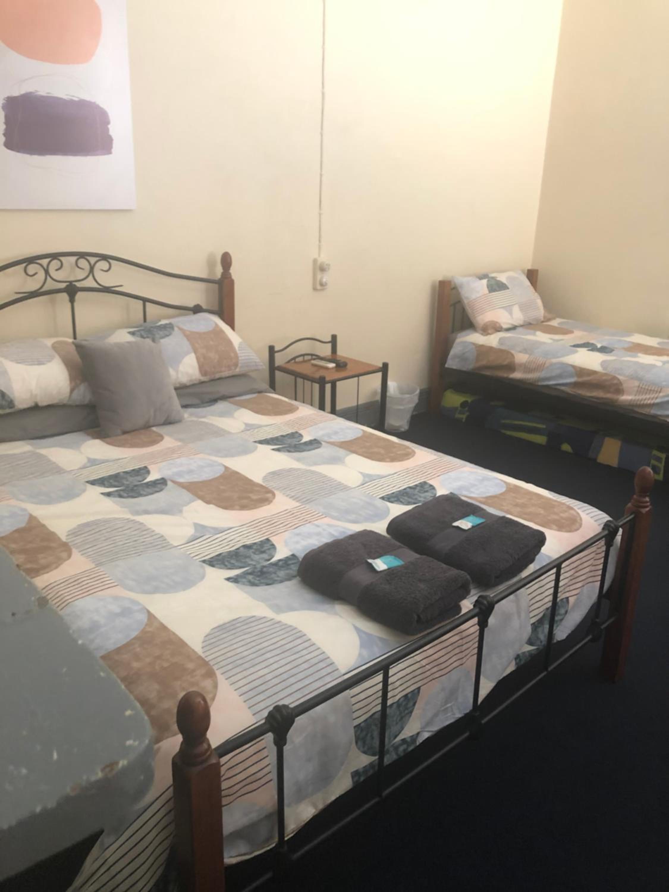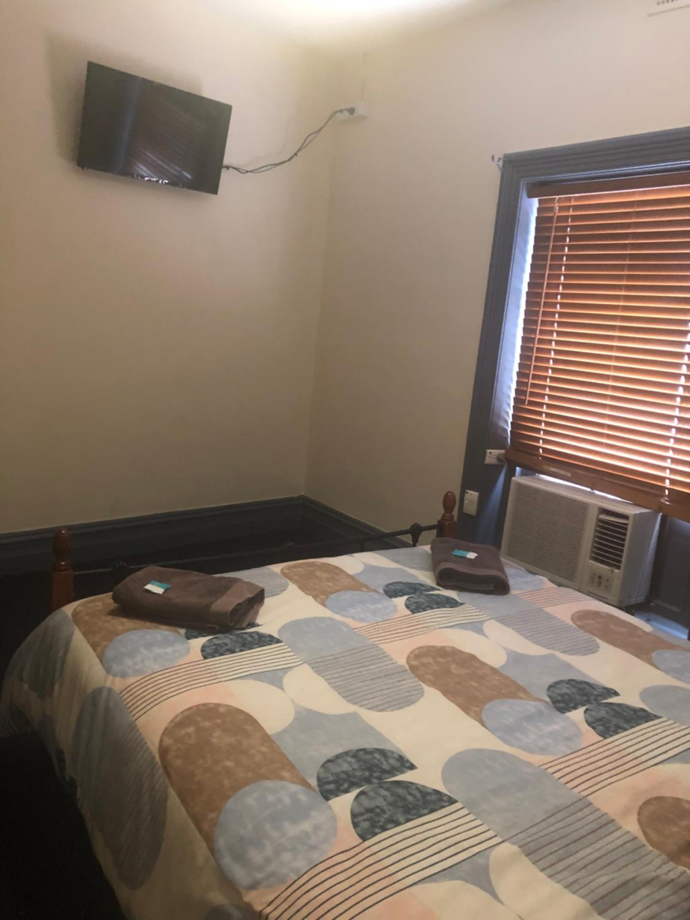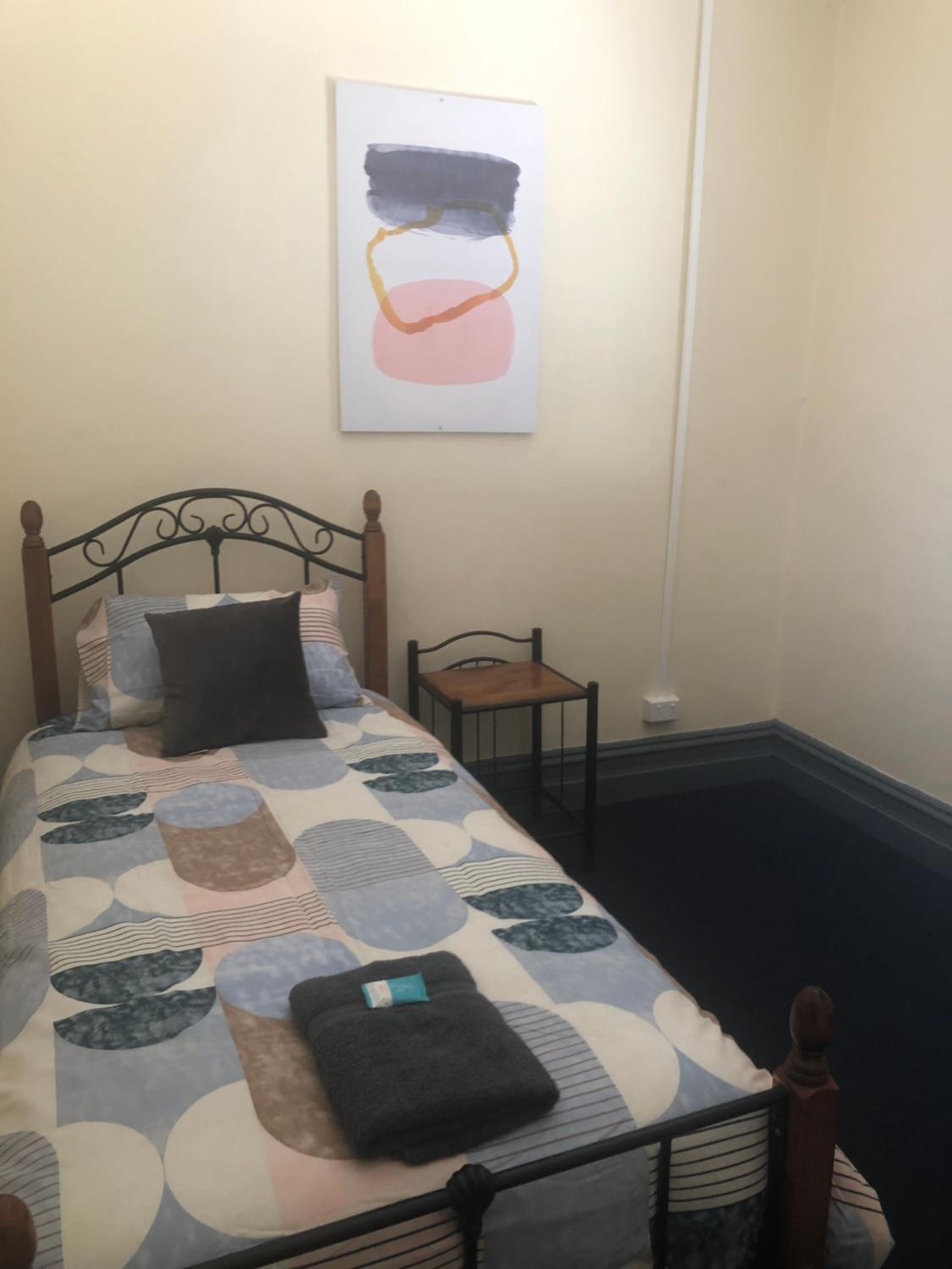 Basic but clean comfortable room, male shared big shower room, shared kitchen with microwave and toaster and kettle tea and coffee, big car park and cheap.