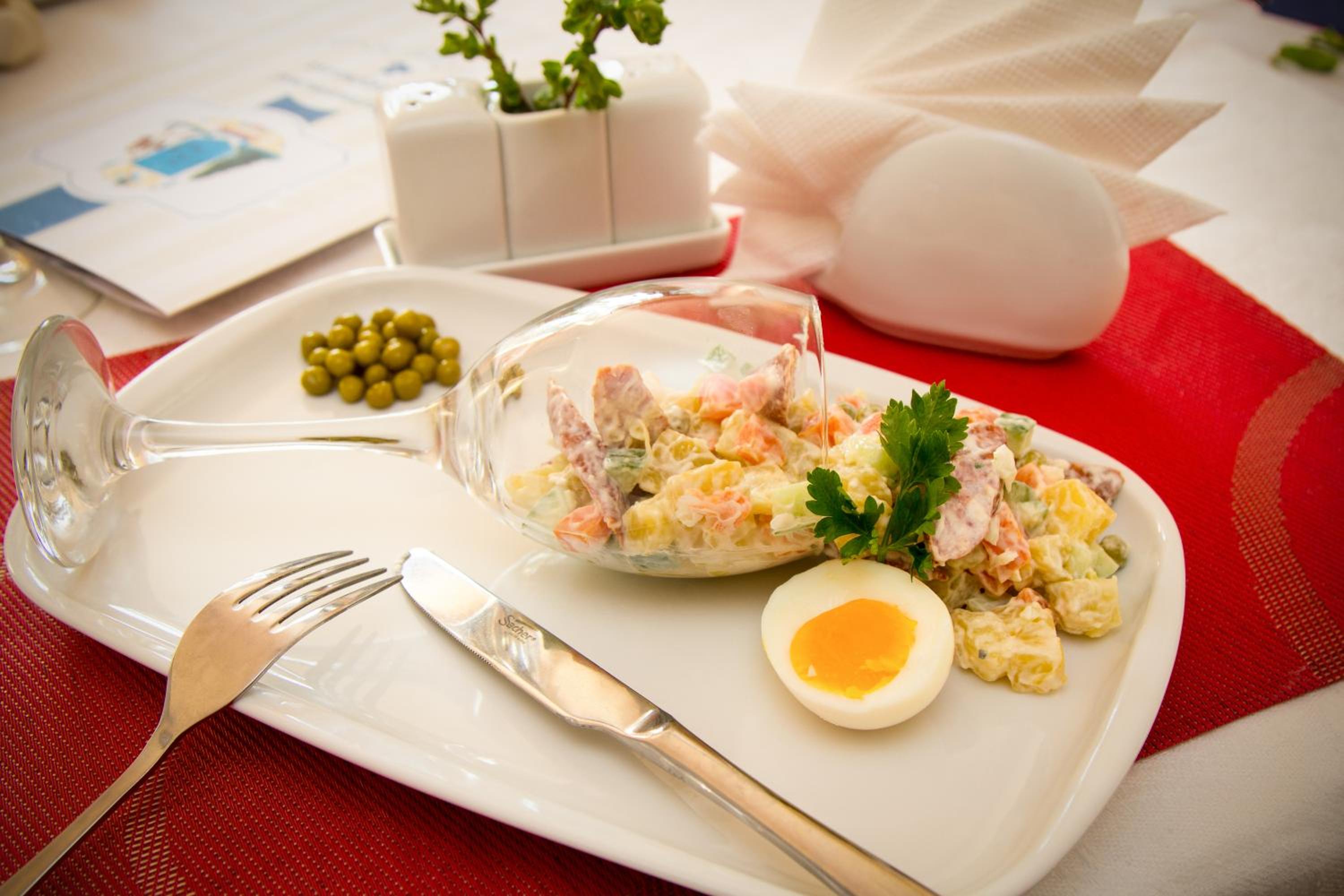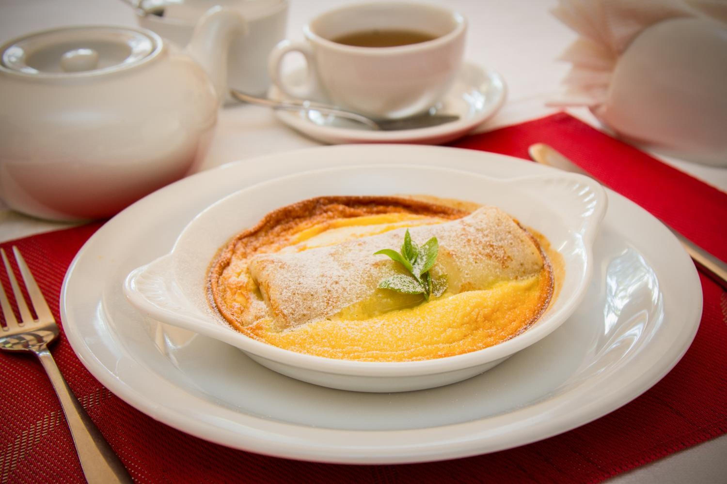 смачний сніданок, не тільки яйця, але і вареники з вишнями.