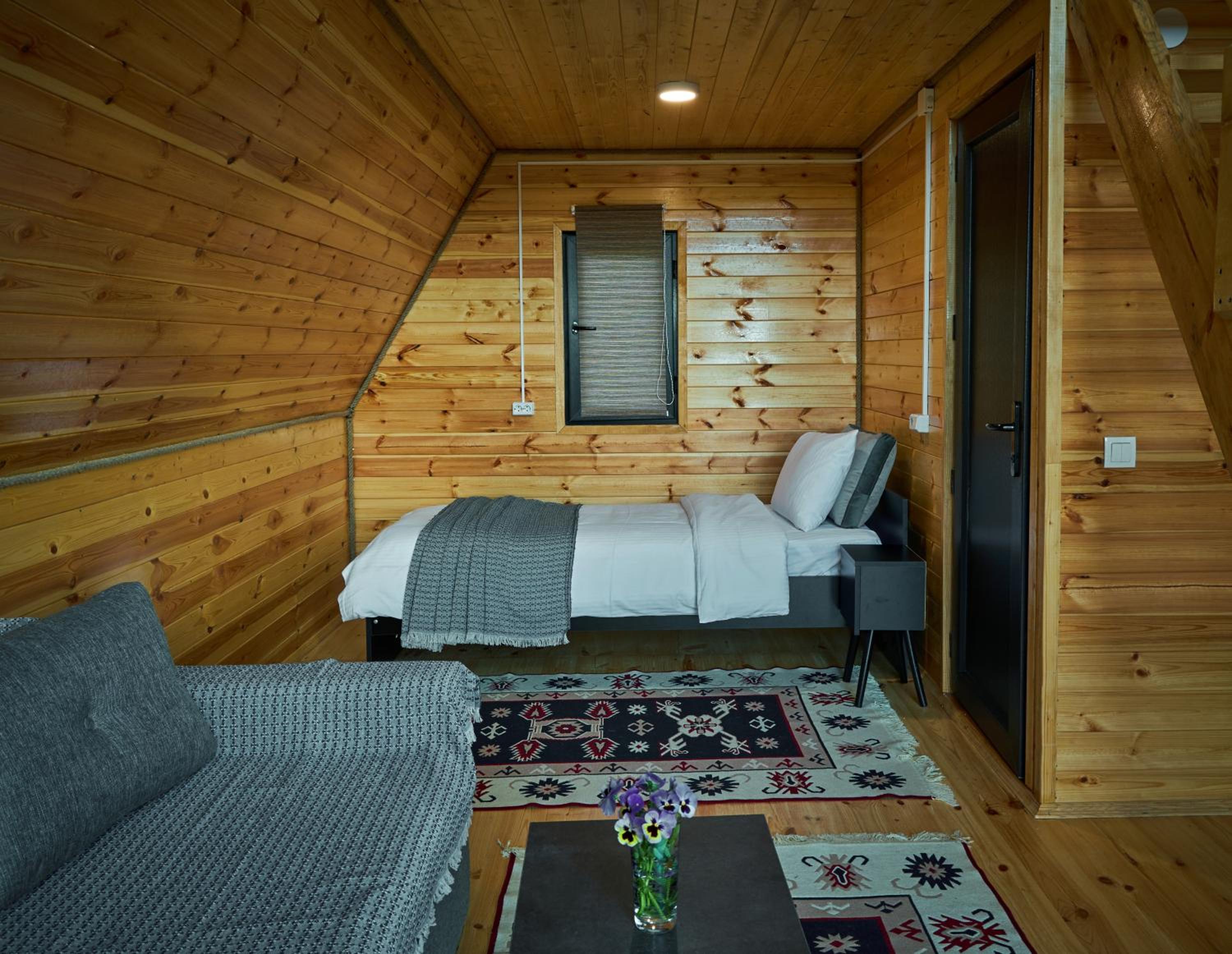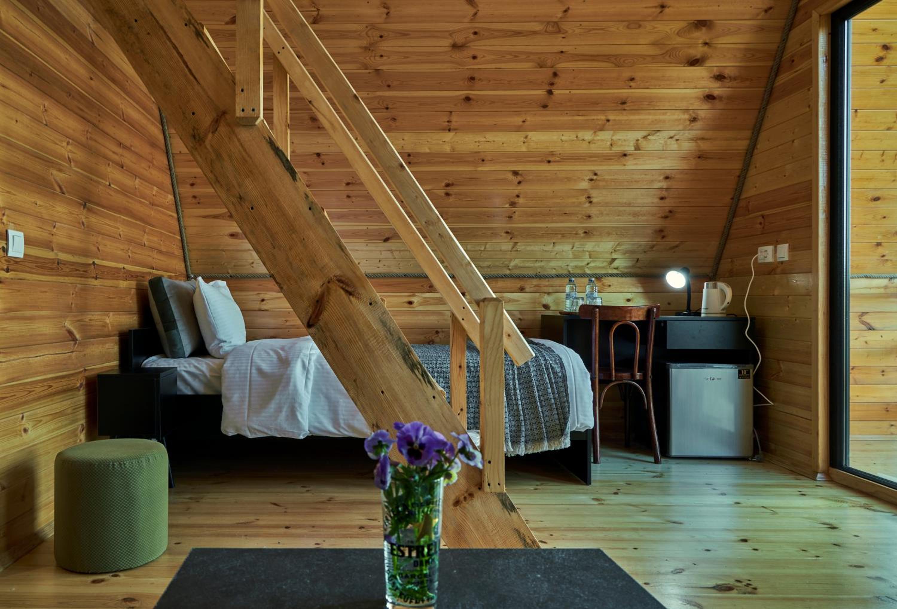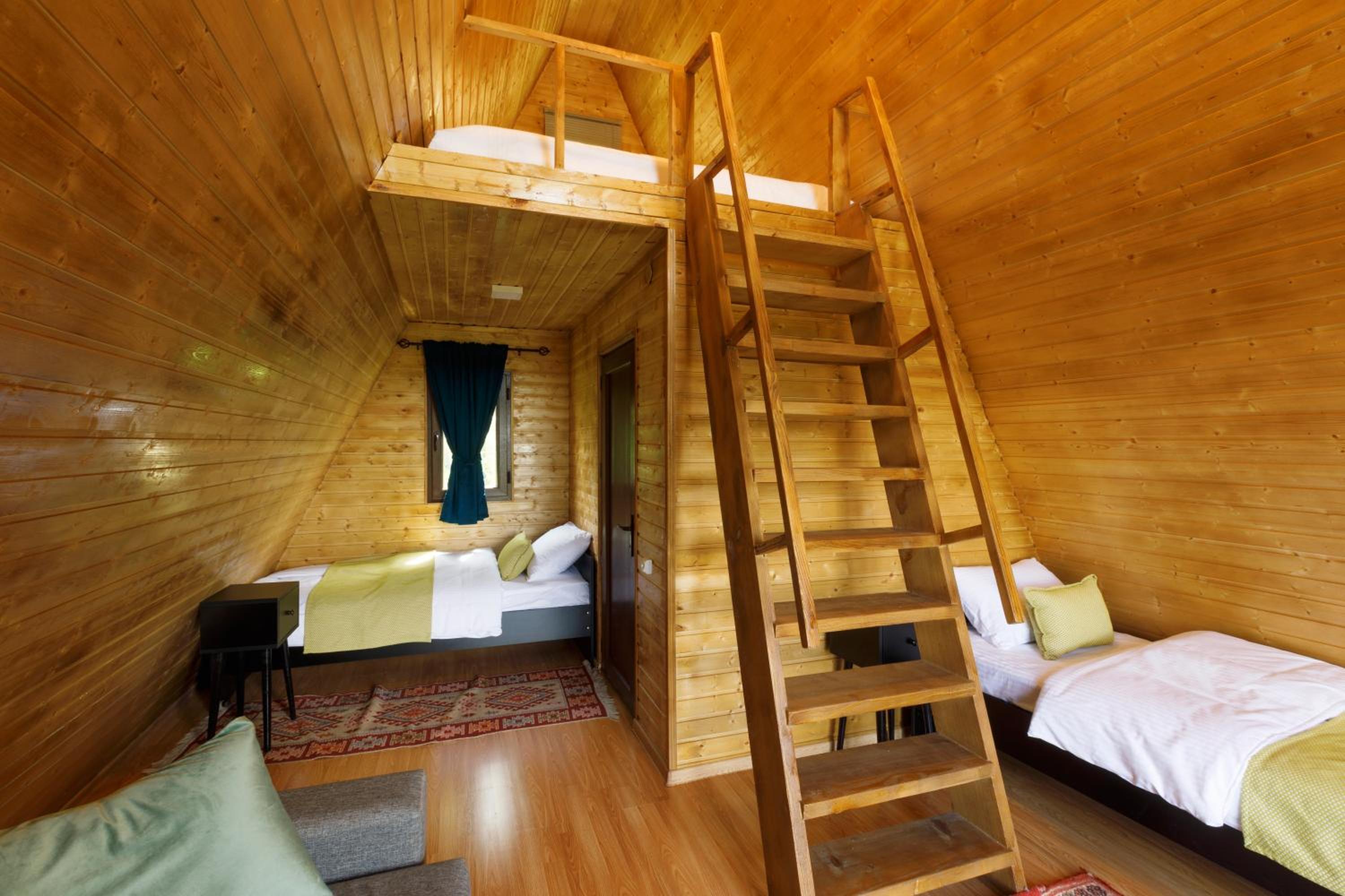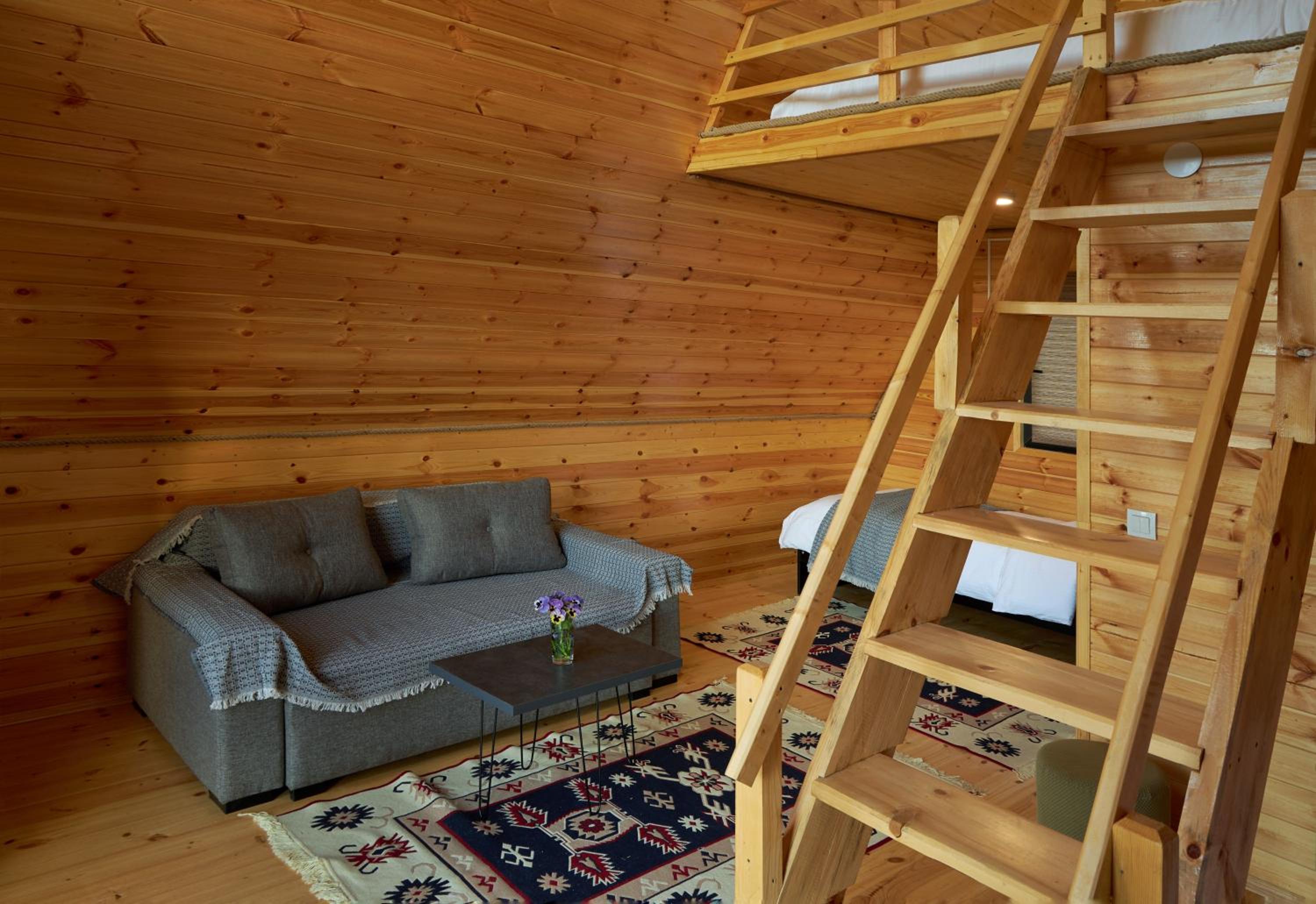 Домик уютный, не маленький. Есть холодильник, на 1м этаже диван и две односпальные кровати. Вверх по лестнице (достаточно крутой конечно) матрас двухспальный, но оч удобный. Открываешь глаза и вид в около сногсшибательный!