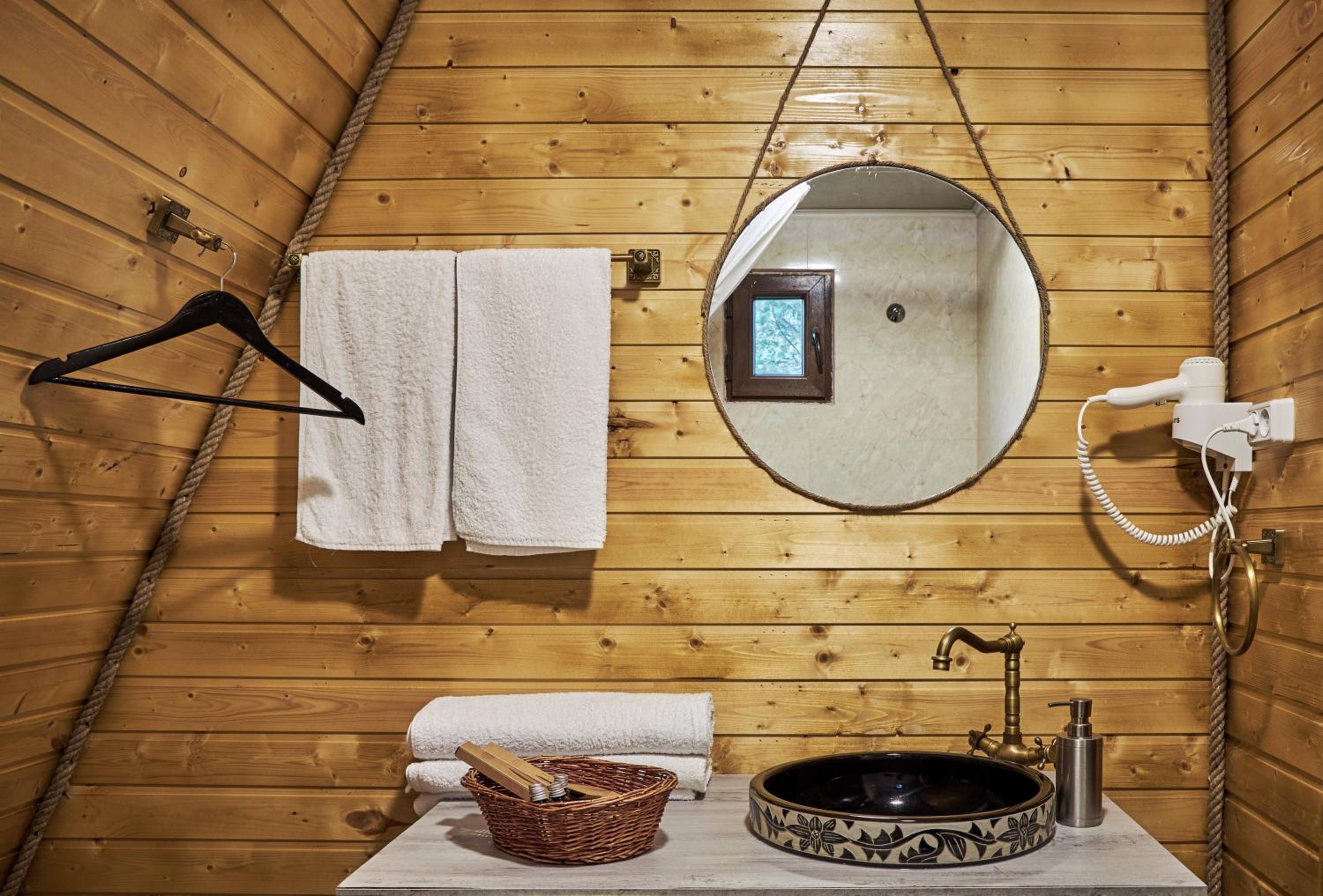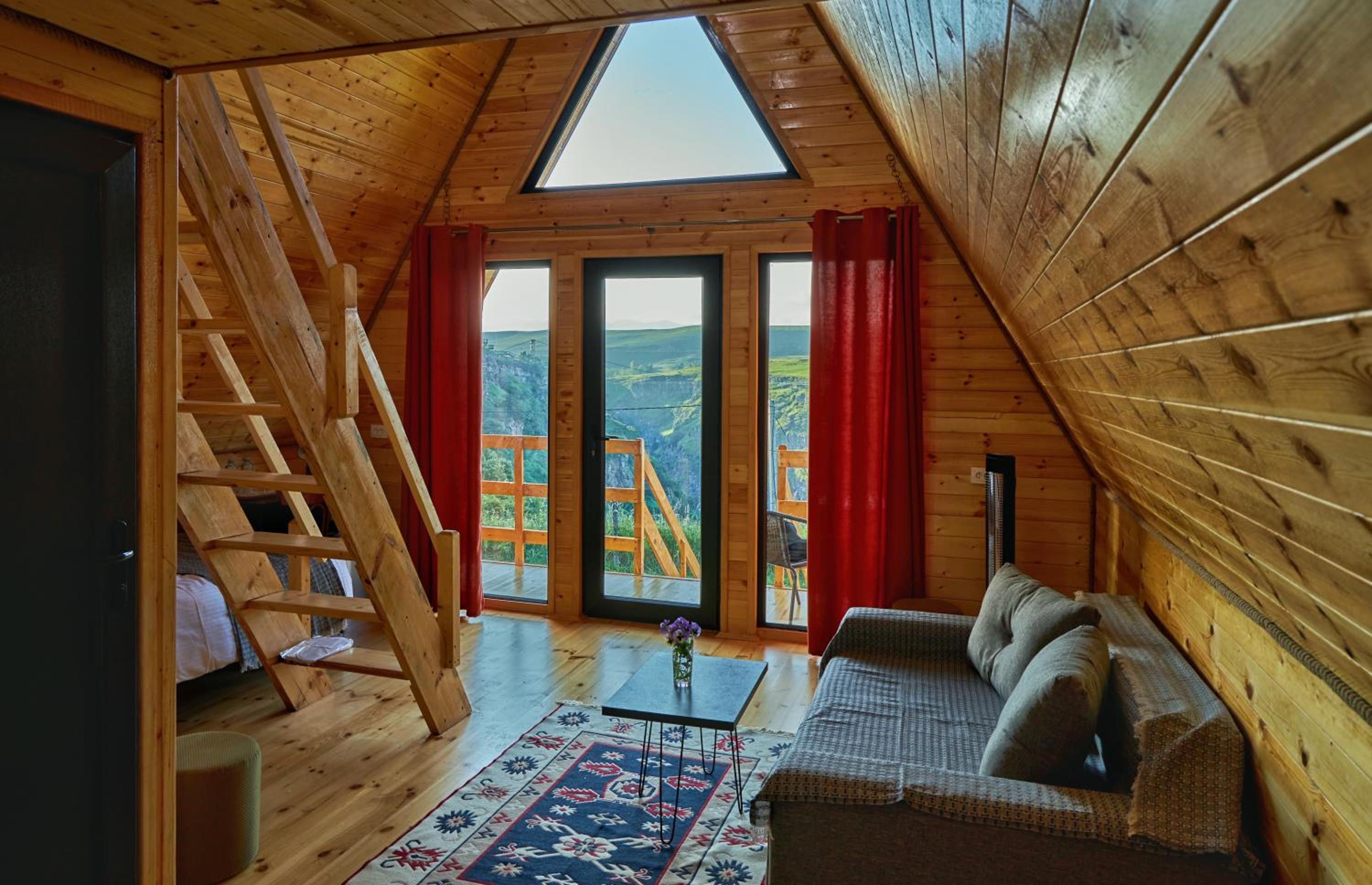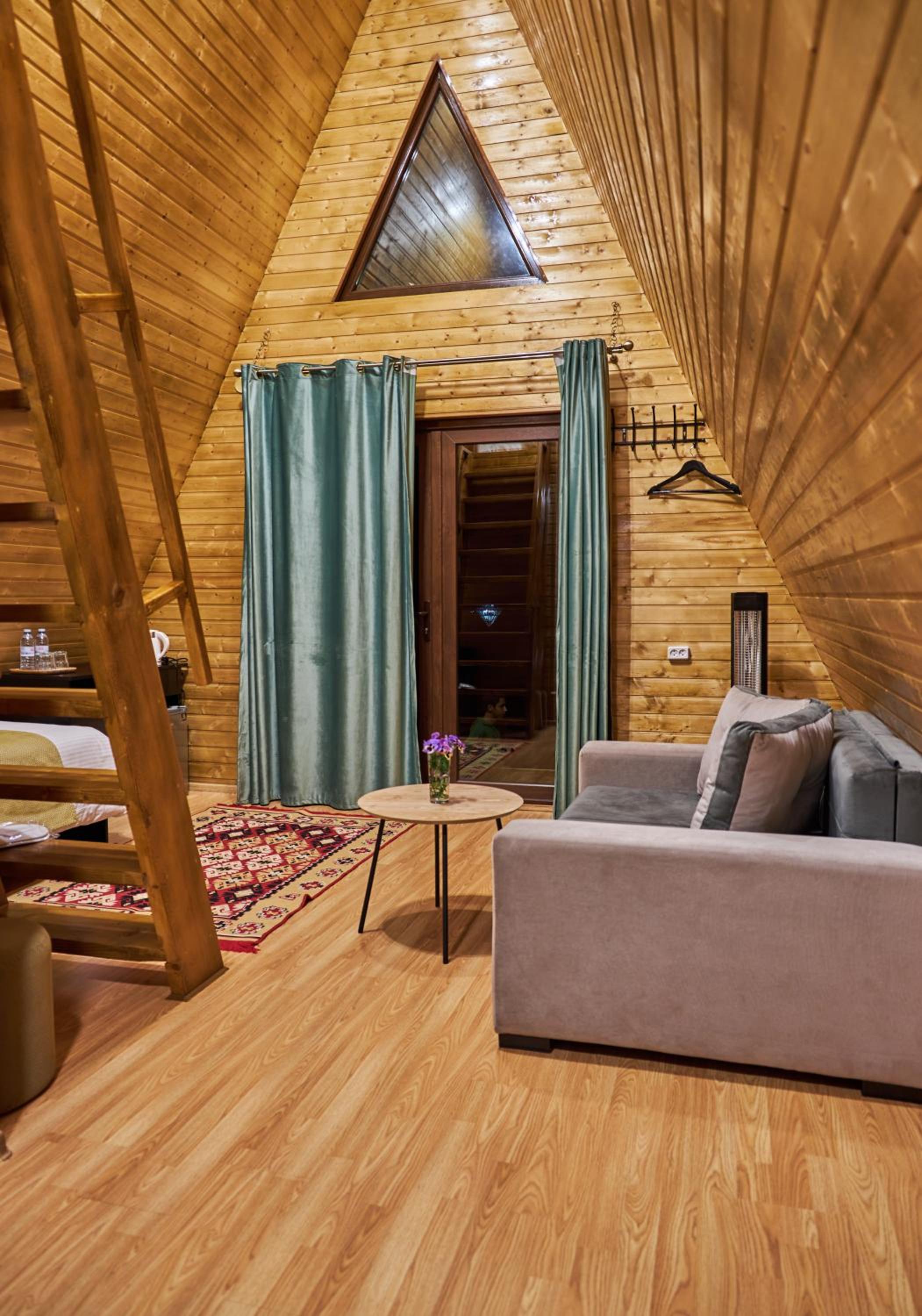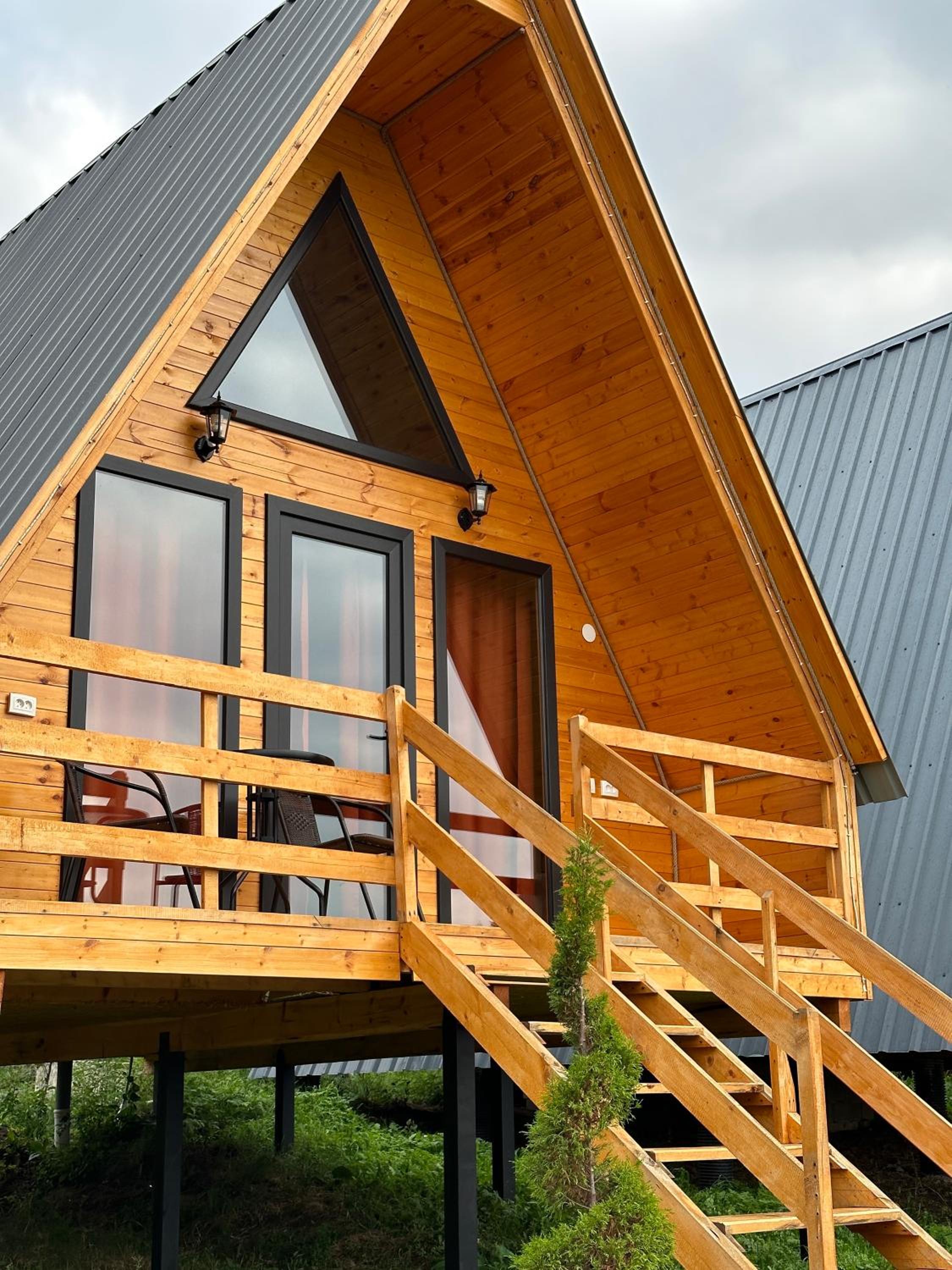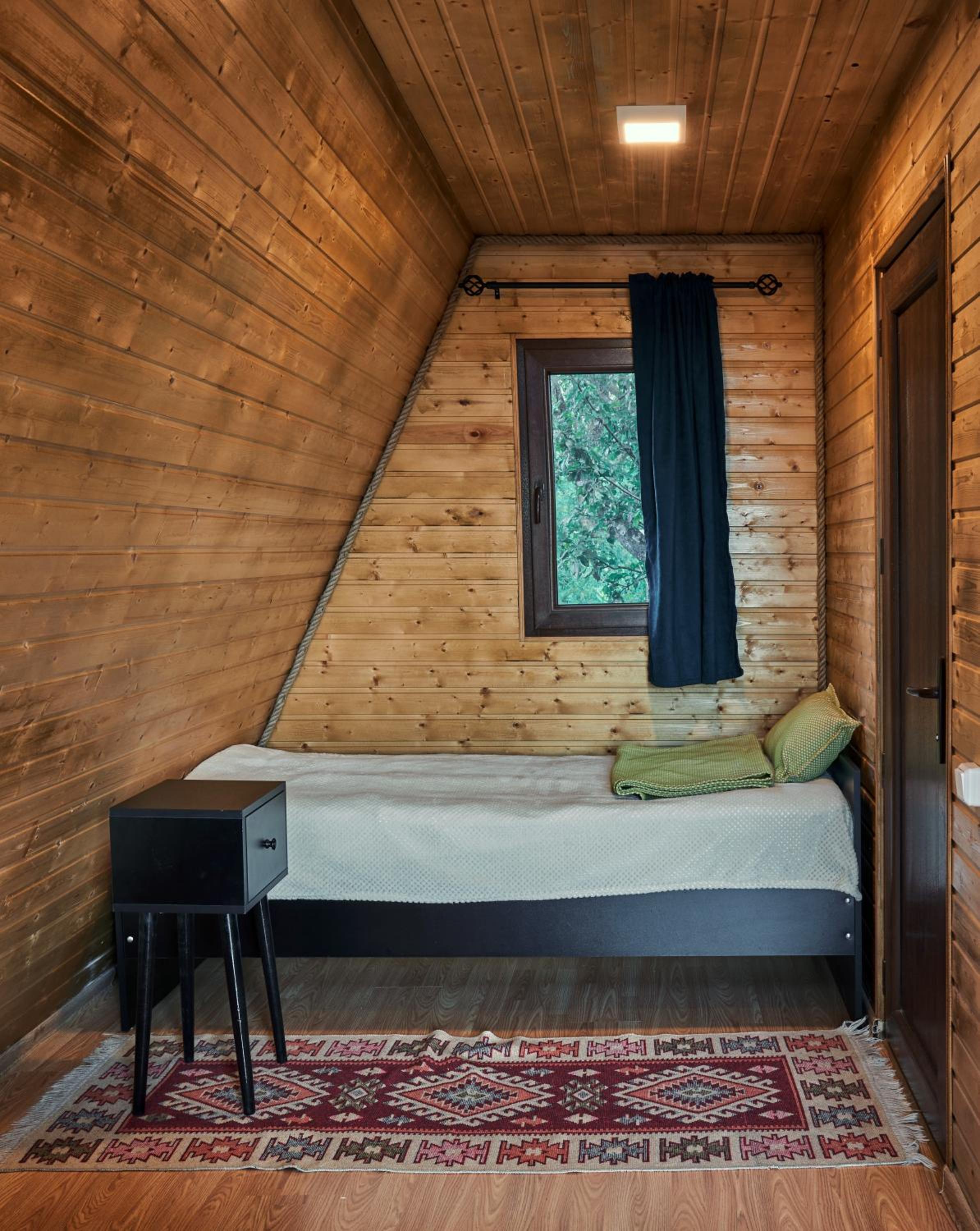 Домик уютный, не маленький. Есть холодильник, на 1м этаже диван и две односпальные кровати. Вверх по лестнице (достаточно крутой конечно) матрас двухспальный, но оч удобный. Открываешь глаза и вид в около сногсшибательный!