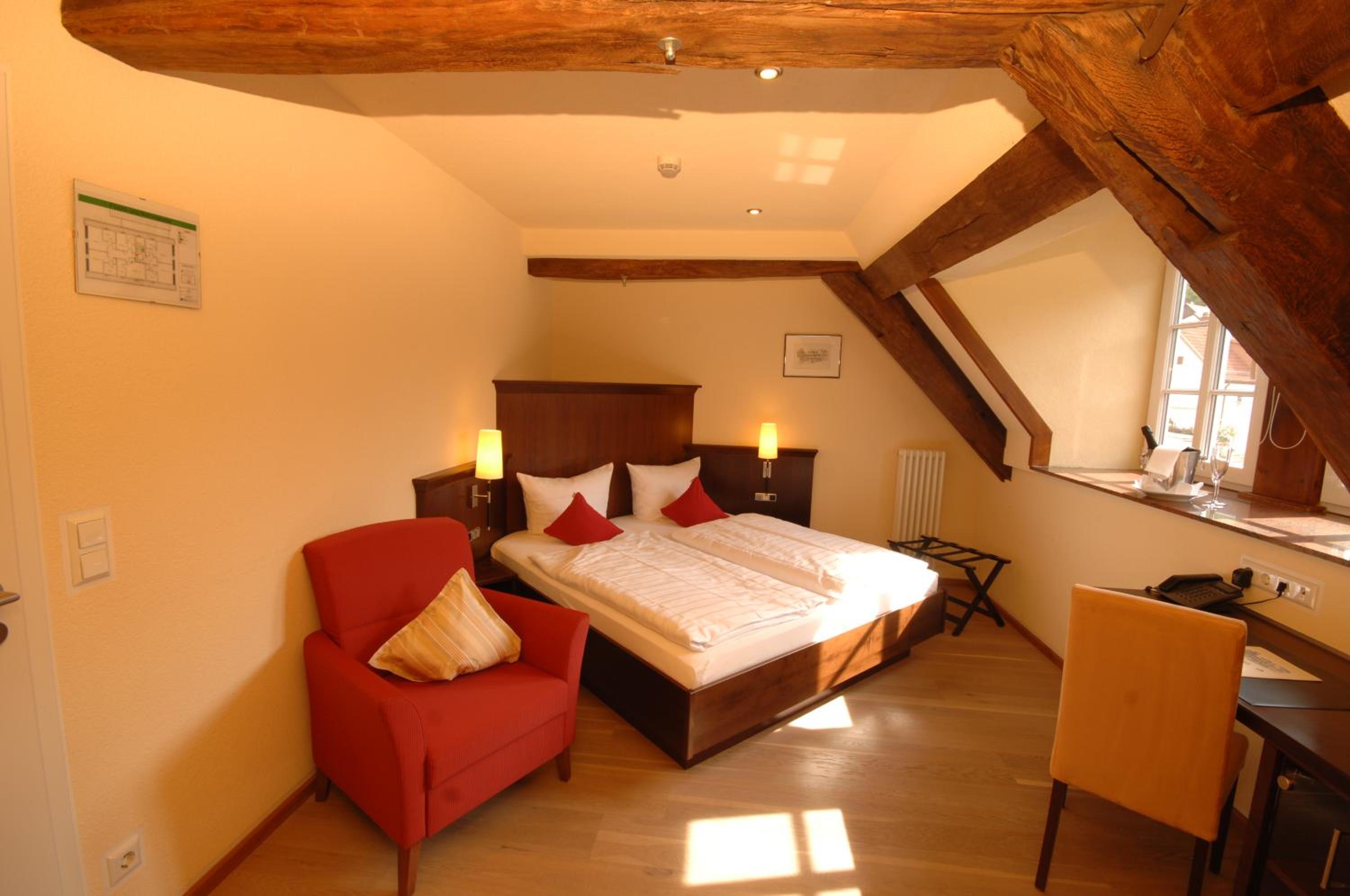 The staff was extremely friendly and helpful. The rooms were in perfect condition and very clean. I really appreciated that the rooms (as requested) were next to each other and were at the end of the hall. Both were quiet and we had an excellent night sleep. We had both dinner and breakfast at the hotel restaurant, and both meals were excellent and were exactly what we expected for a traditional German meal. Thank you for a wonderful experience for our first night back in Germany.