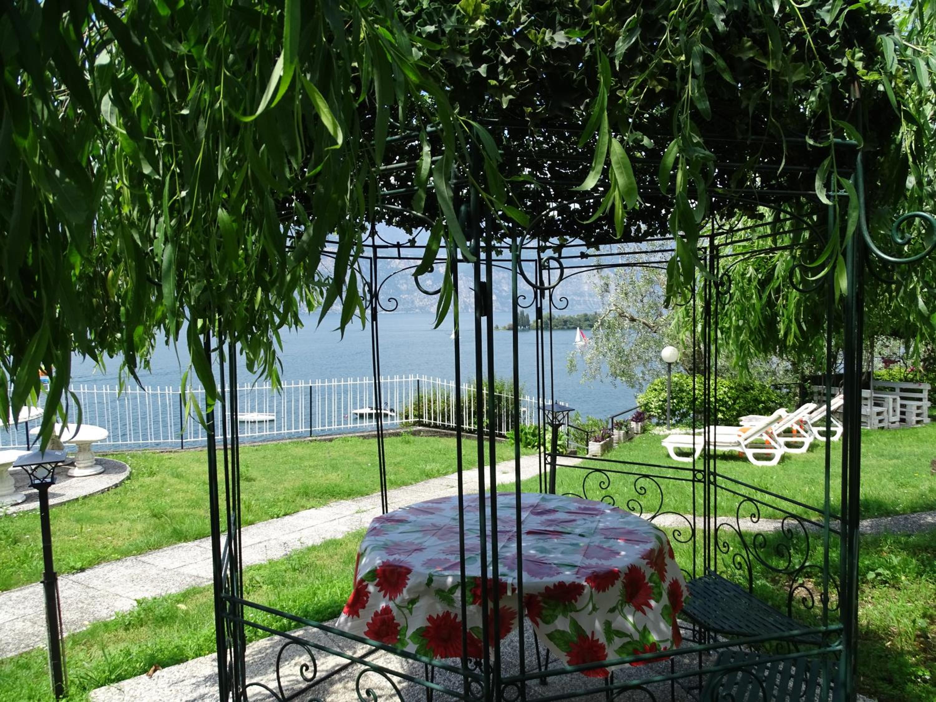 Experience the beauty of Lake Garda from Casa Alessandra, just steps away from the shore. Enjoy stunning panoramic views and relax by the outdoor pool surrounded by parasols and sun loungers.