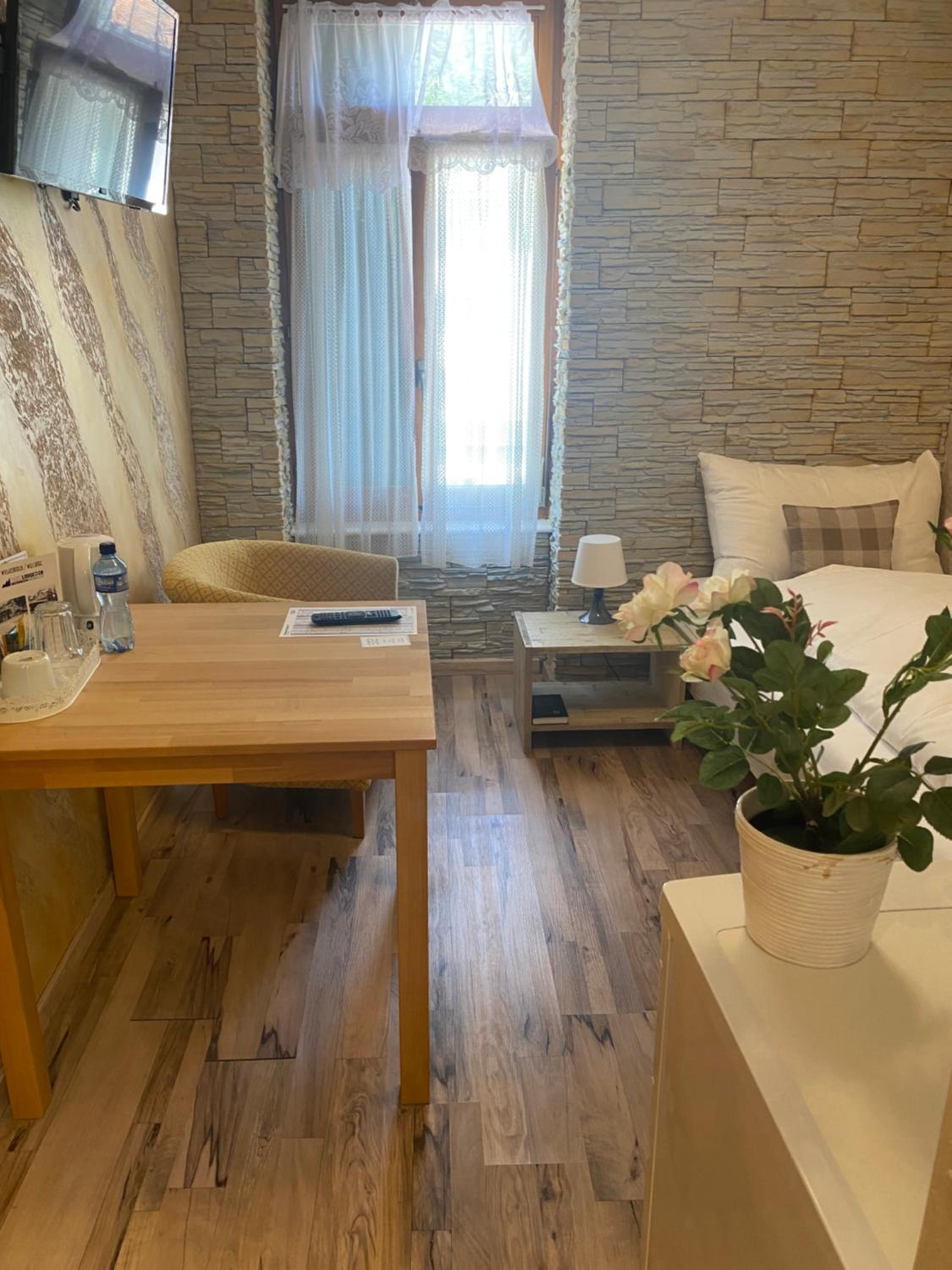 Zimmer war nicht bereit. Gefährlicher Teppich beim Hauseingang, grosse Stolpergefahr! Dann direkt Linoleumboden mit nicht sichtbarer grosser ca 1x1 m. Luftblase, welche ebenfalls sehr gefährlich ist. Es wurde uns weder den Weg zum Zimmer, Frühstücksraum, Parking beschrieben. Wir haben angegeben Hochzeitstag und Geburtstag als Anlässe vor Ort feiern zu wollen, dies wurde ignoriert. Boden im Zimmer war sehr schmutzig, nach erneuter Reinigung immer noch schmutzig. Der Duschvorhang war an den untersten ca. 30 cm sehr schmutzig und stark verschimmelt. Das Zahnglas war nicht gewaschen von den vorherigen Besuchern. Beim Bett gab es eine Holzlatte über dem Kopf, welche lose war (Gefährlich!). Mir hat es gereicht! Ich habe die Zimmerverantwortliche gesucht und sie gebeten mit mir das Zimmer zu besichtigen: Ihre Antwort war, dass das Bett heute Morgen noch nicht kaputt war, dass der Boden nochmals gereinigt wurde und der Duschvorhang, ja der sei schmutzig... An der Decke oberhalb vom Bett gab es einen dunklen, braunen Fleck von ca 1x1meter.. Ich will nicht wissen, woher... Die Gastgeberin wurde sichtlich nervös und teilte mit, dass wir ein anderes Zimmer bekämen. Ich solle warten. Meine Frau hat gesehen, dass sie das andere Zimmer zuerst angeschaut haben, bevor sie es mir vorstellten. Auch hier Haare auf dem Boden und in der Dusche, es funktionierte nur der Regenduschenkopf- die Brause nicht. Der Nächste Tag, das Frühstück...Geschirr wurde sehr laut in die dafür vorgesehenen Kisten geworfen, wir wurden weder begrüsst noch beachtet. Der Überzug vom Körbchen, in welchem die Butter lag, waren geschimmelt. Die Tomaten, Gurken, Käse und Lioner lagen in einer durchsichtigen Flüssigkeit... Der Milchkrug wahrscheinlich immer wieder aufgefüllt ohne zu reinigen, so wie er aussieht. Brötchen waren im Inneren noch gefroren. Tischset ist Werbung von Bier (beim frühstück). Die Wände im Speisesaal reissen und sind braun belegt. Der Inhaber hat nur informiert, dass es kein 4 Sterne Hotel sei