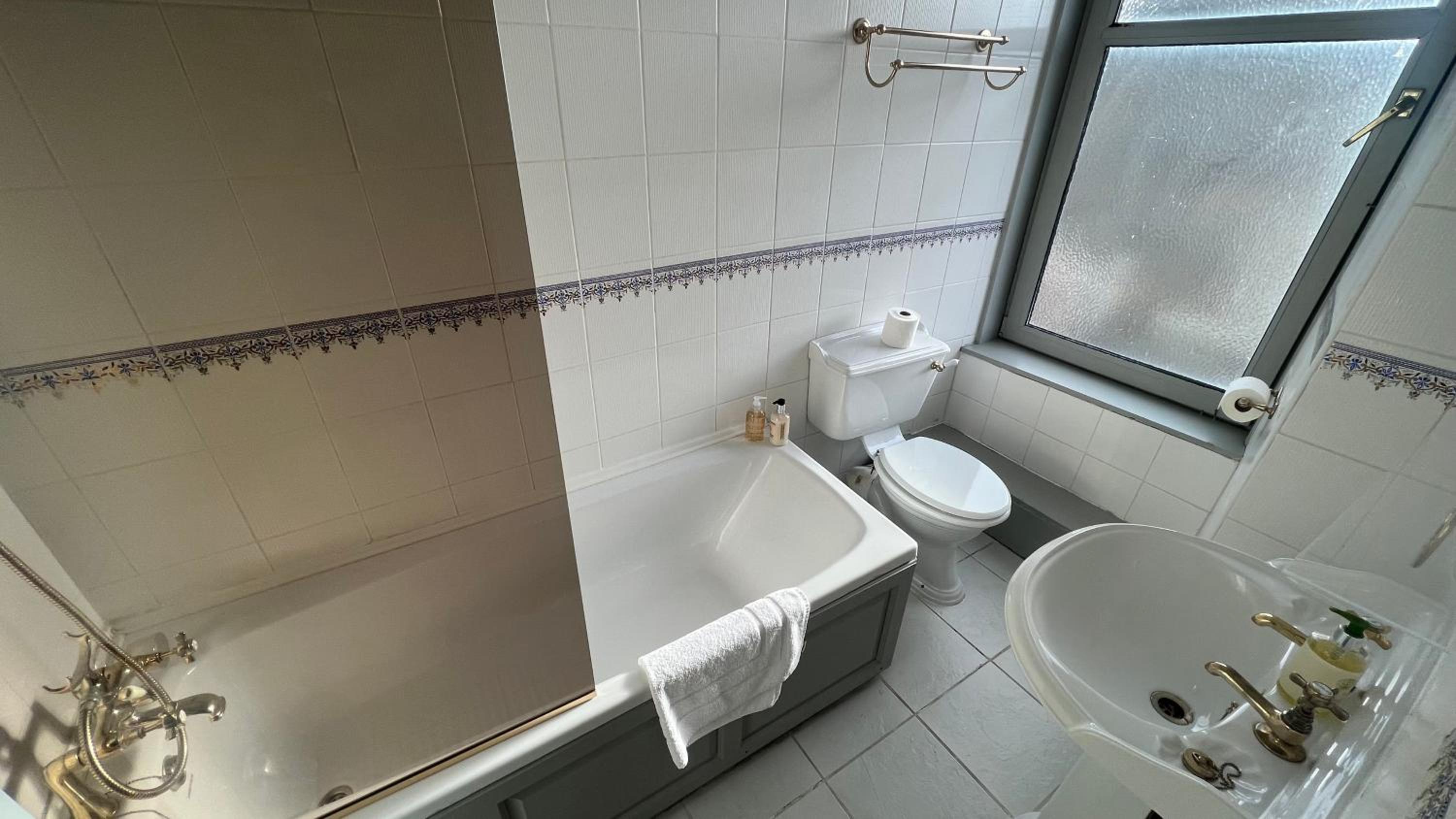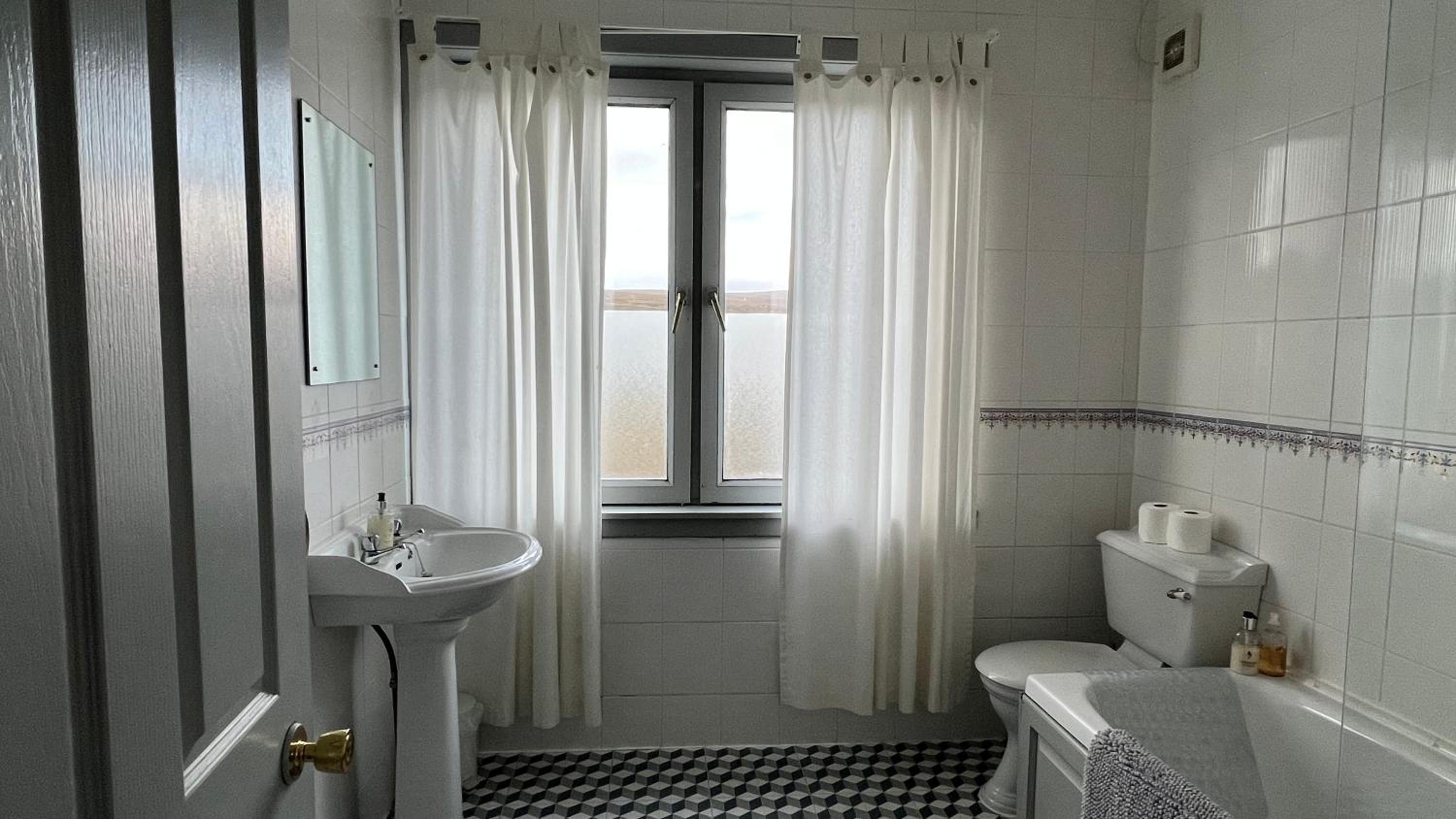 No curtains or blinds over a large bathroom window, and the bedroom curtain rail fell off the wall.
