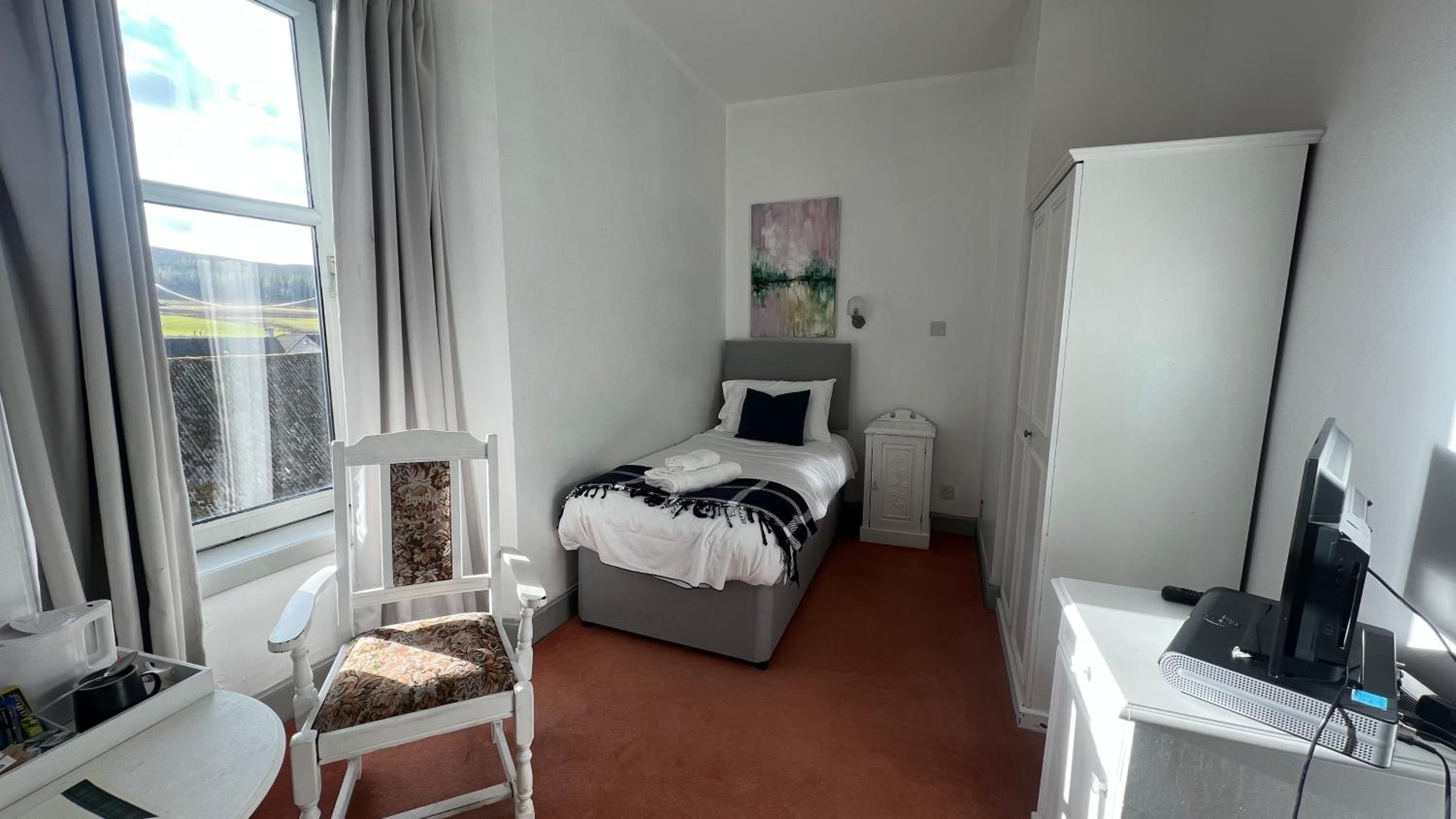 The location was spot on and enjoyable. The full Scottish breakfast was nice. Staff was pleasant. Parking was available and next to the building which was nice considering luggage. The bed was nice and slept well. Everything in the room was clean and had no concerns regarding cleanliness or safety. Check-in was quick and informal. This is an old building in a small town so one’s standards must adjust.