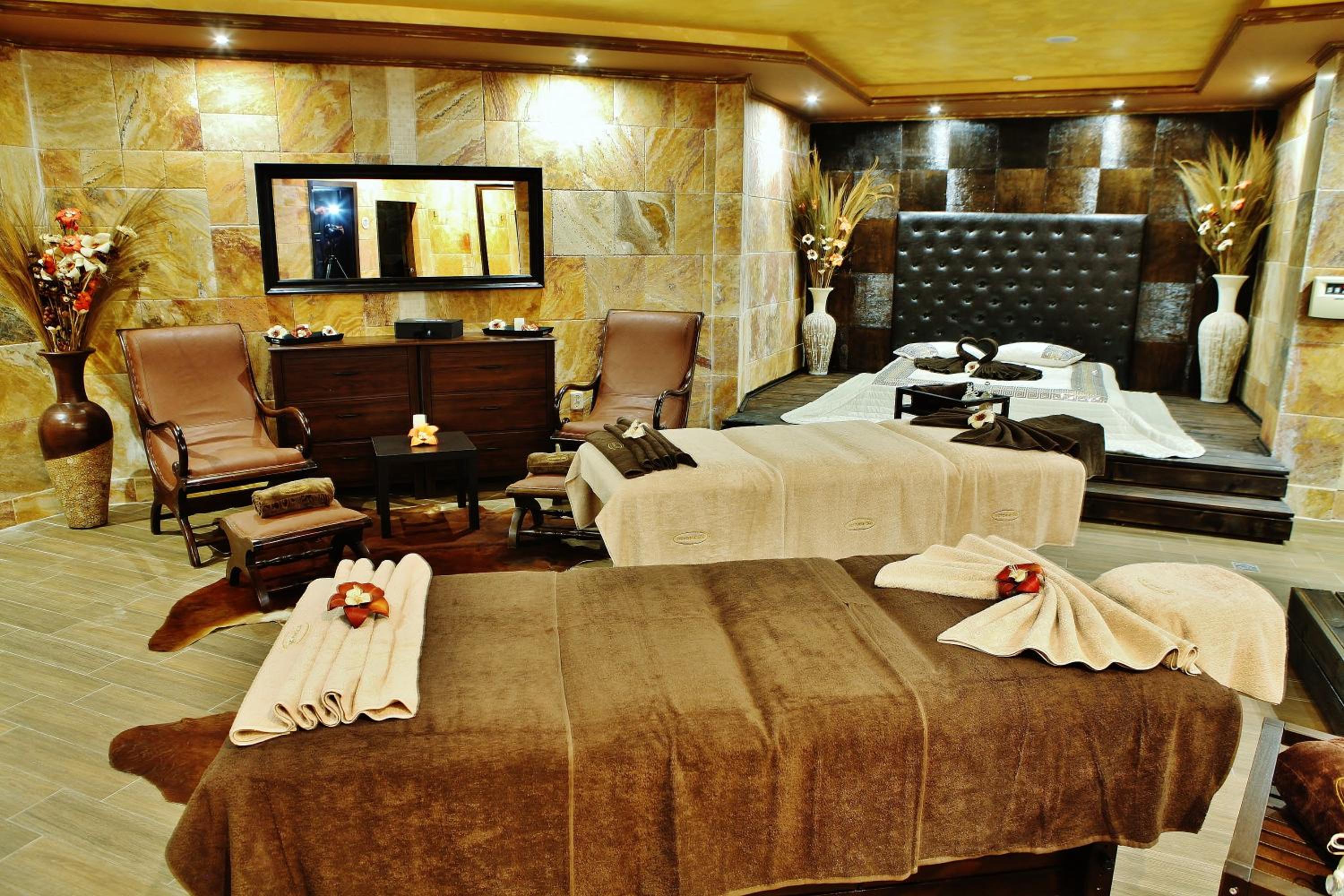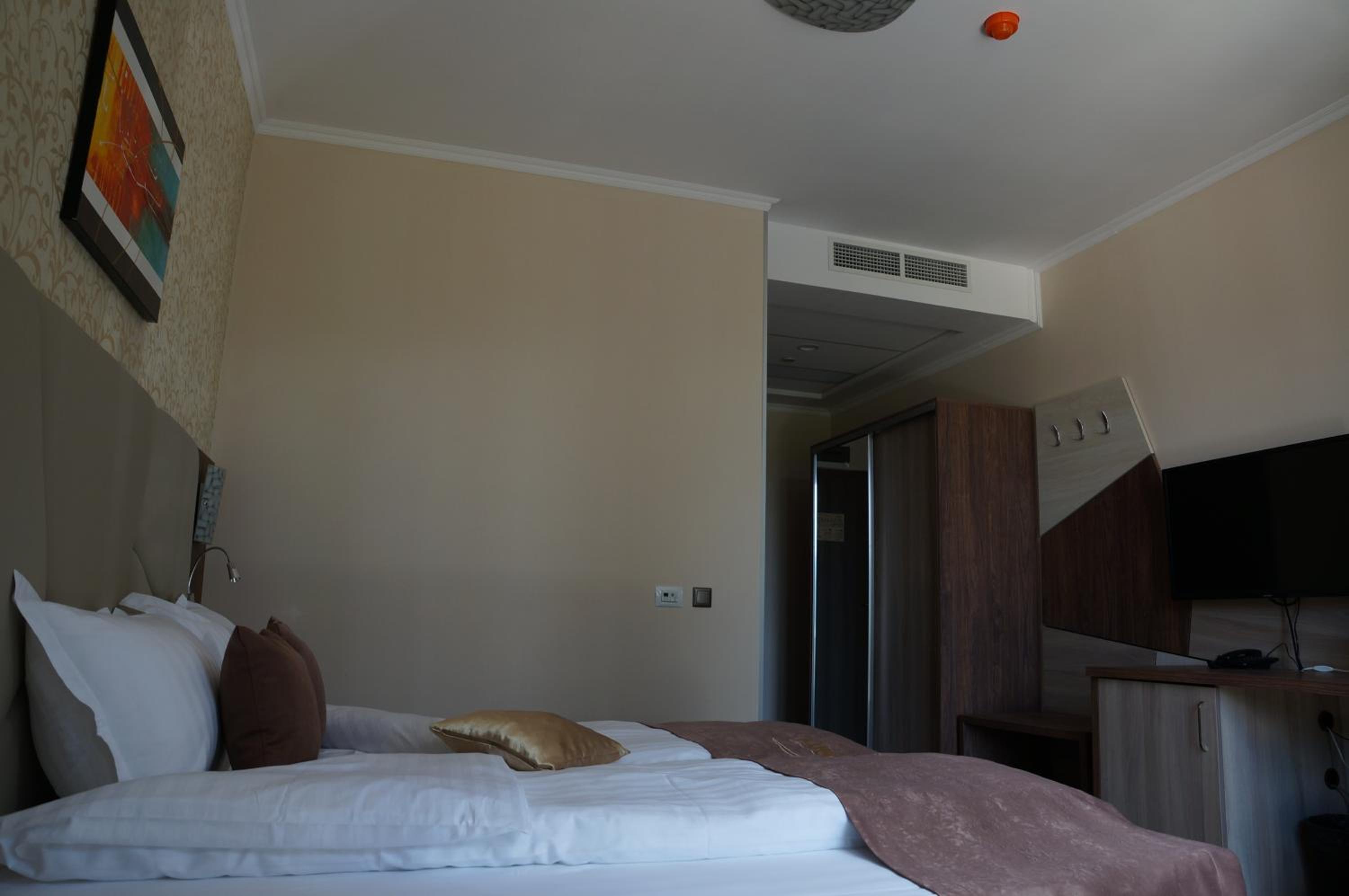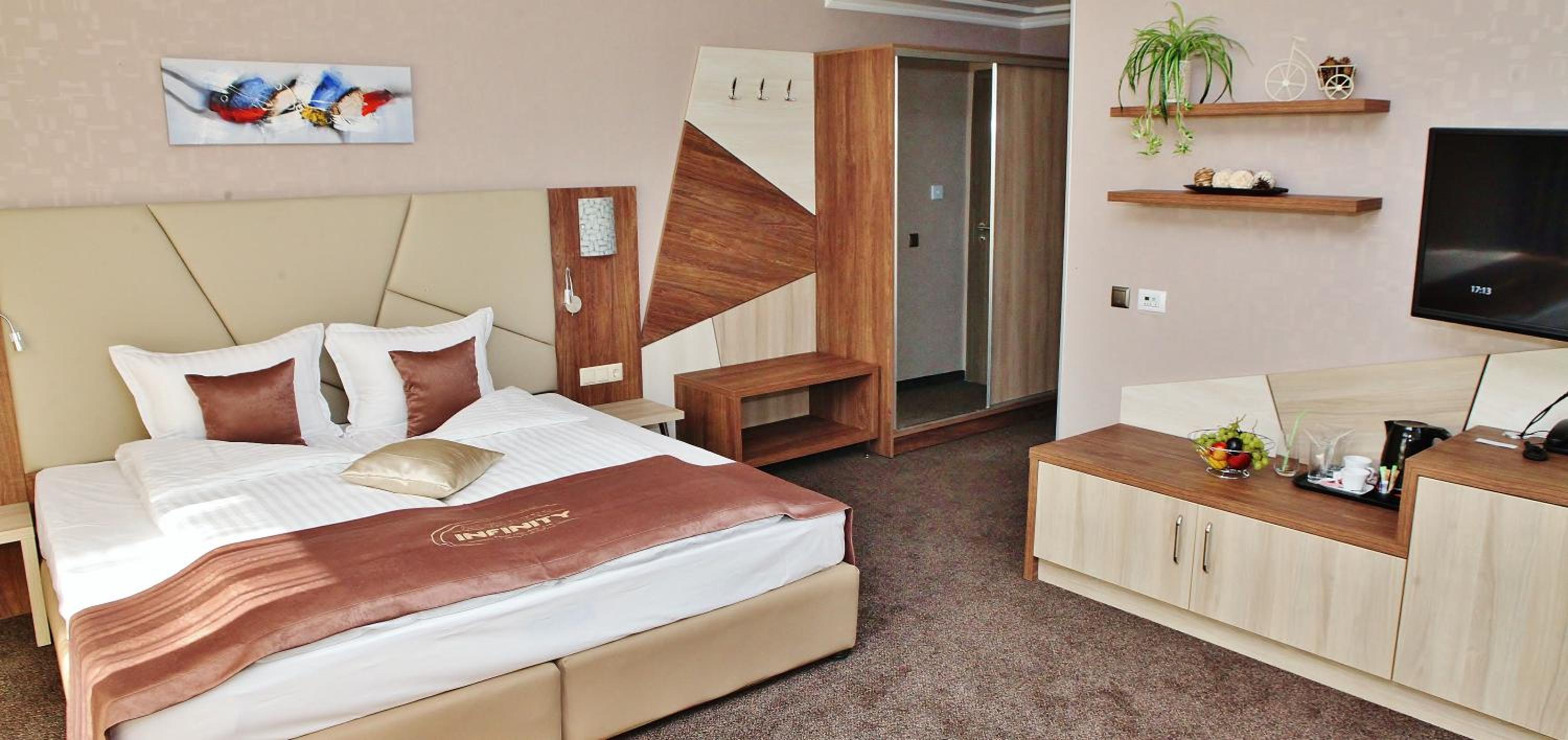 Hotel Infinity & Spa Park Velingrad offers elegantly designed rooms with modern amenities such as flat-screen TVs and luxurious bathrooms with complimentary toiletries, ensuring a comfortable stay for all guests.