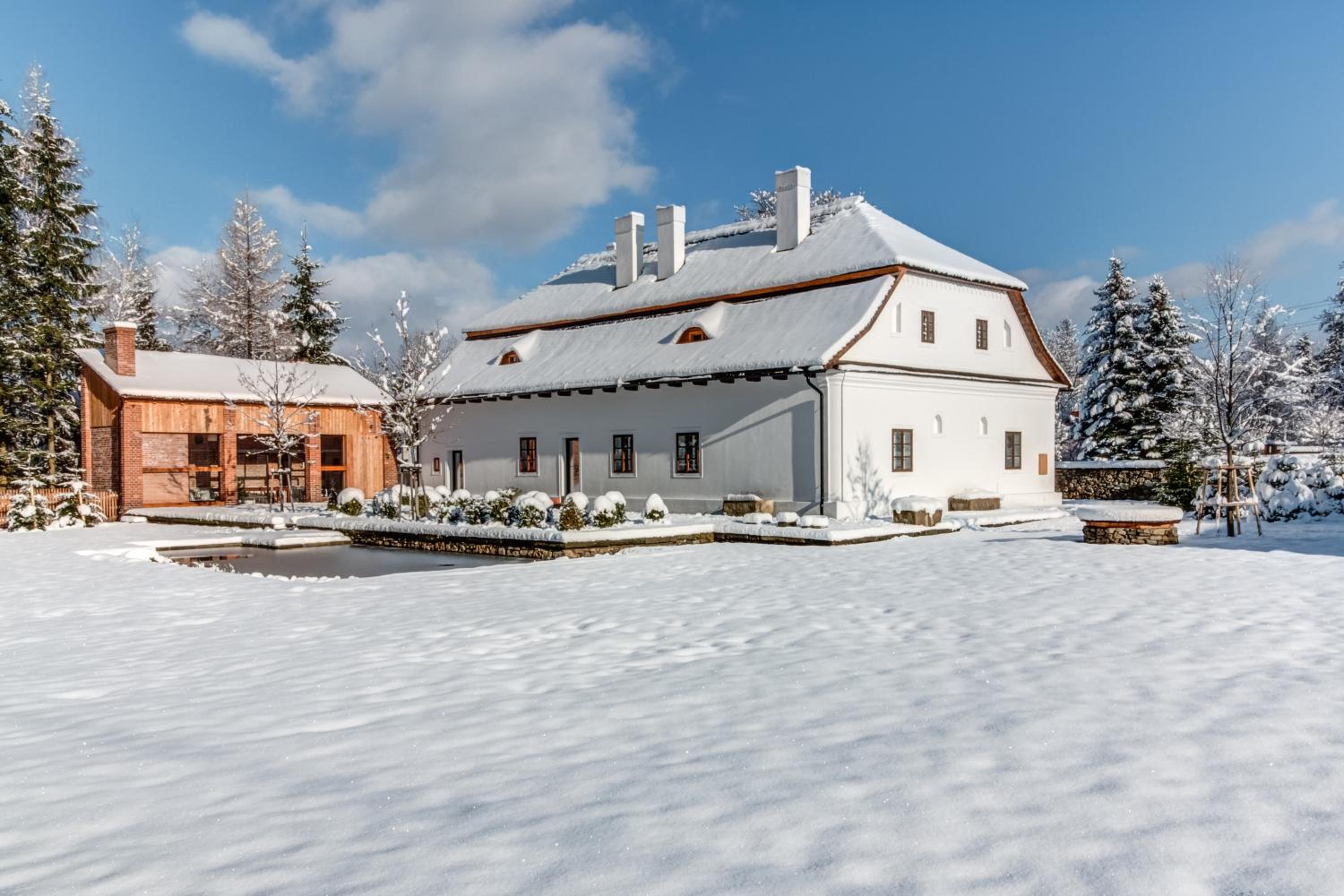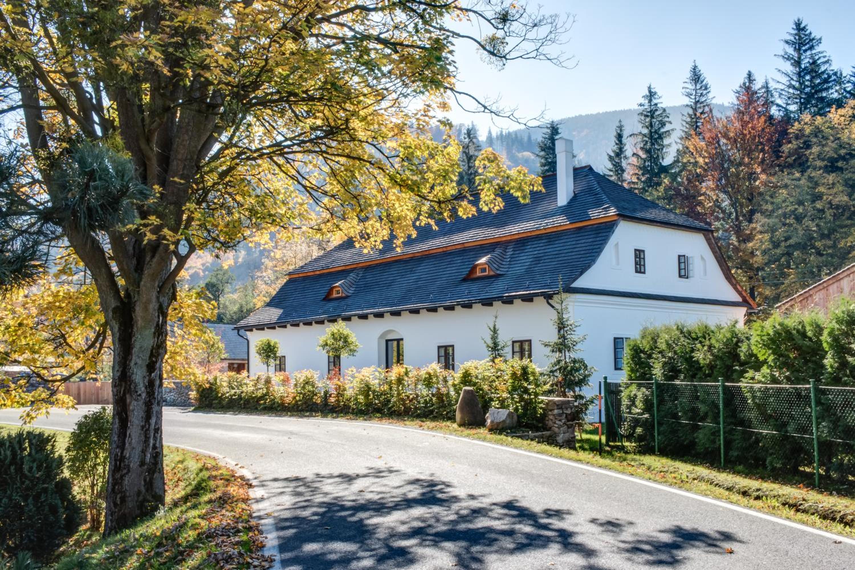 Boutique hotel Mezi plutky, nestled in Čeladná, offers elegant rooms with mountain and pool views. Each room features a desk, premium bed linen, and a private patio, ensuring a comfortable stay.