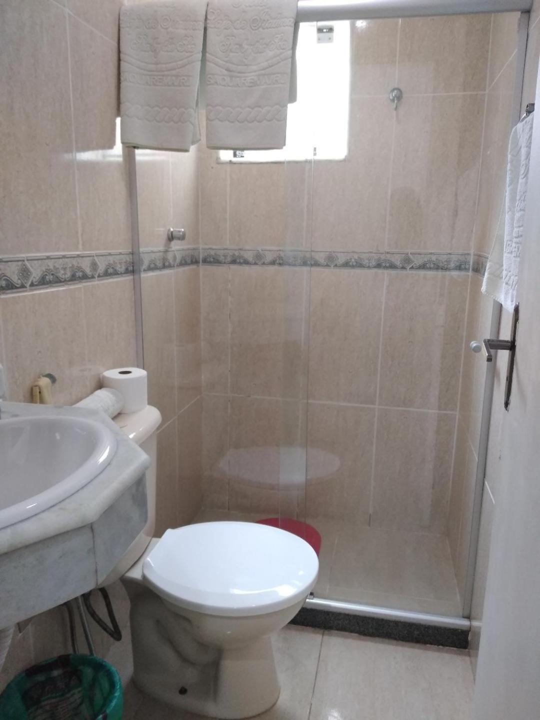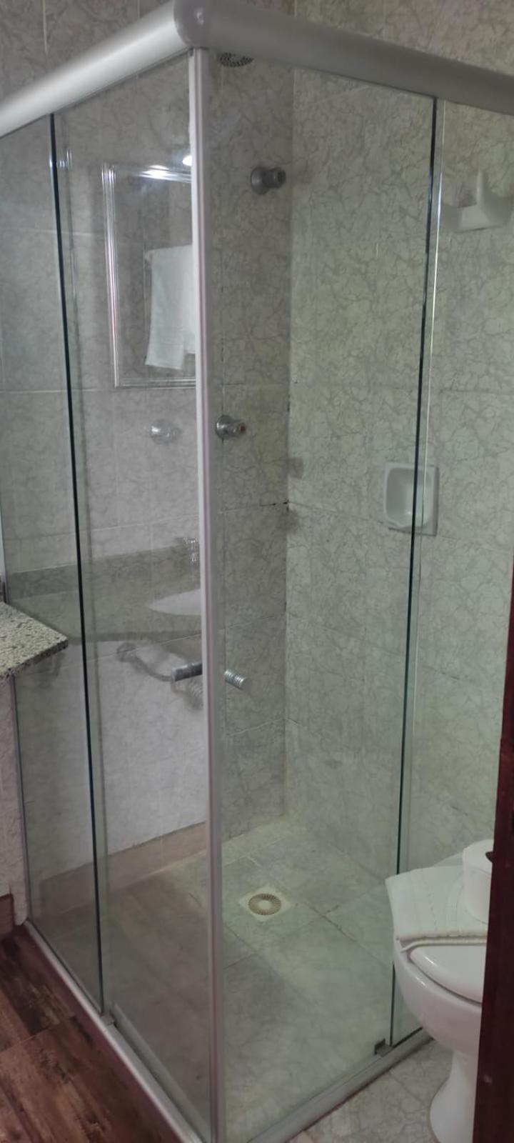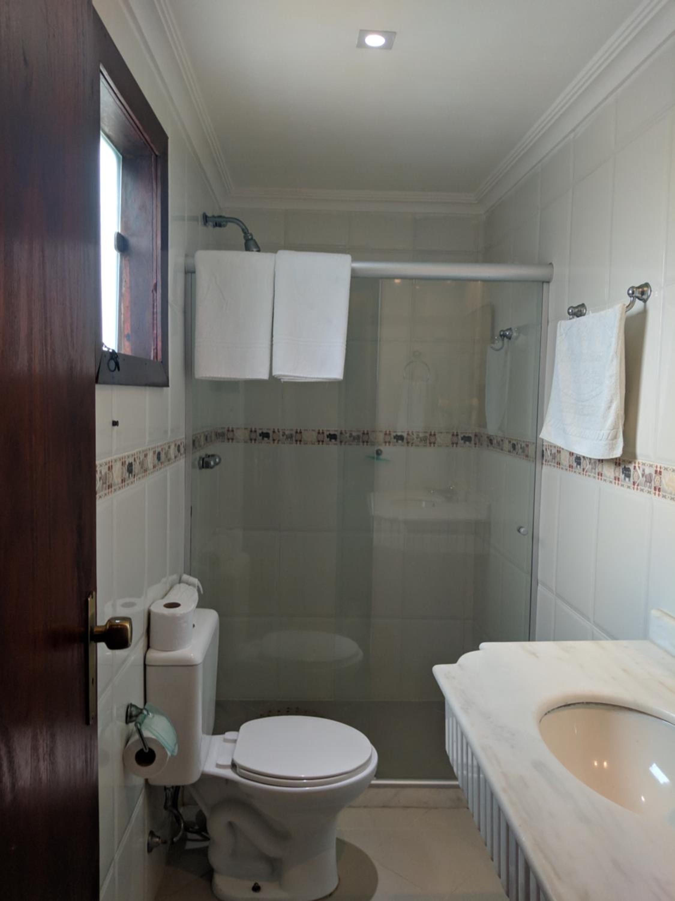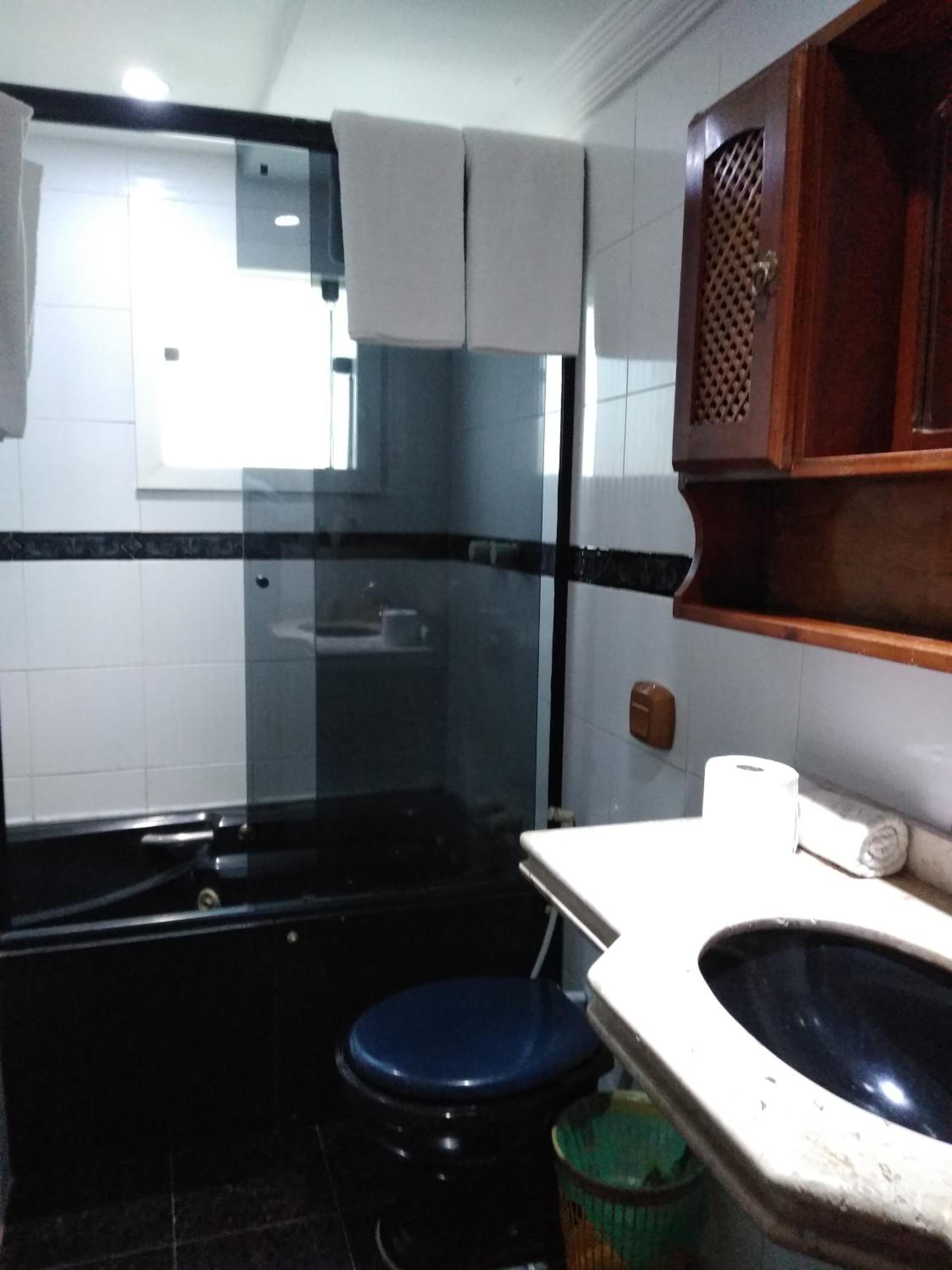 O banheiro com o vaso sanitário espremido entre o Blidex do box do chuveiro e a parede divisa com o quarto. Muito apertado e que atende somente as pessoas magras.