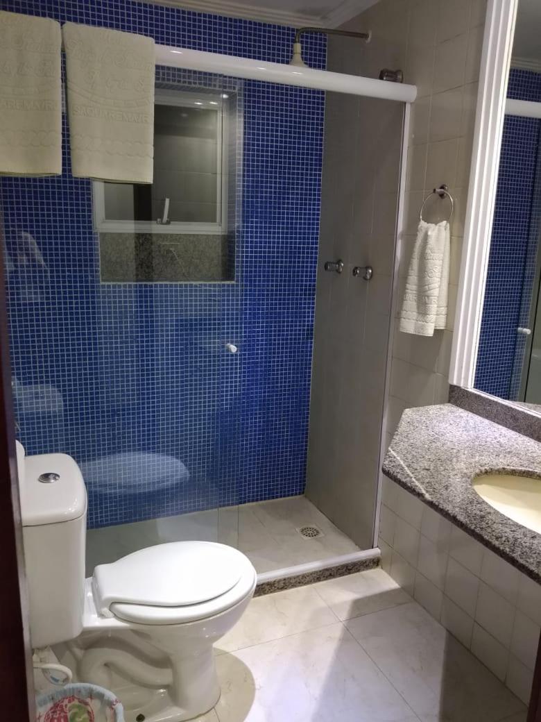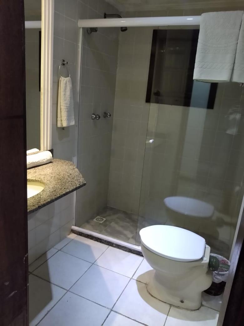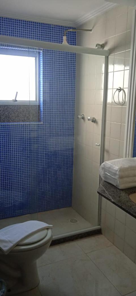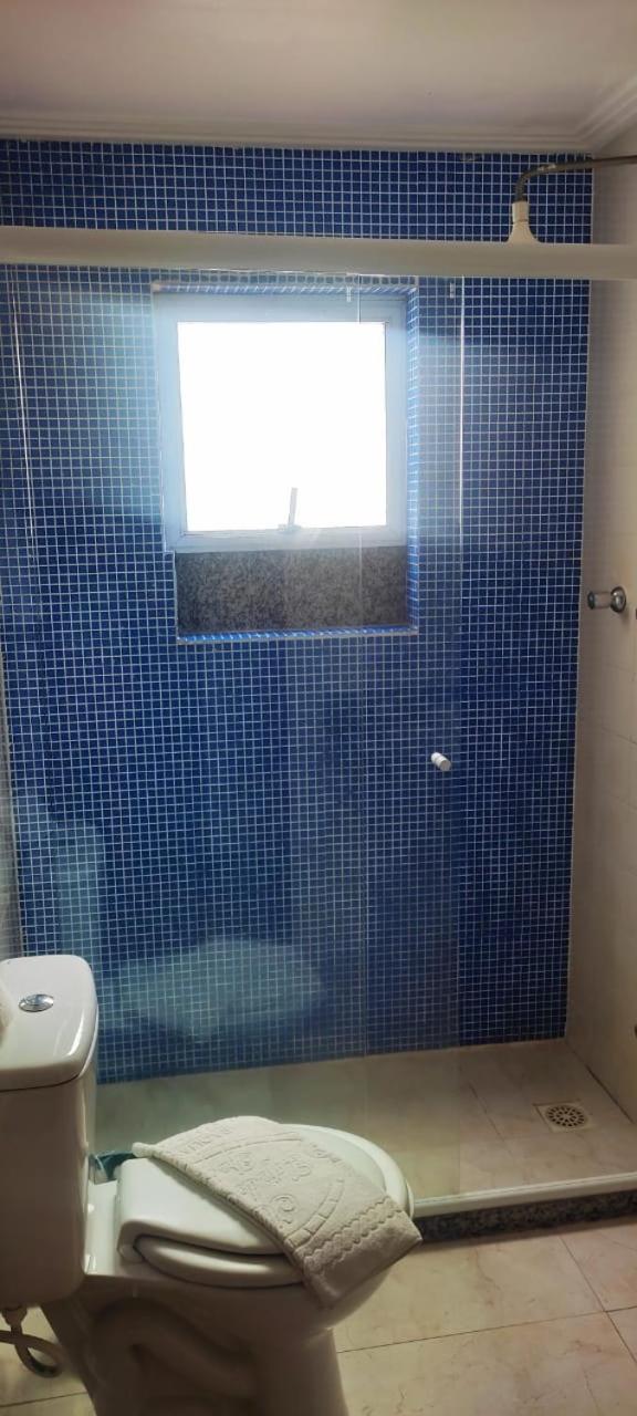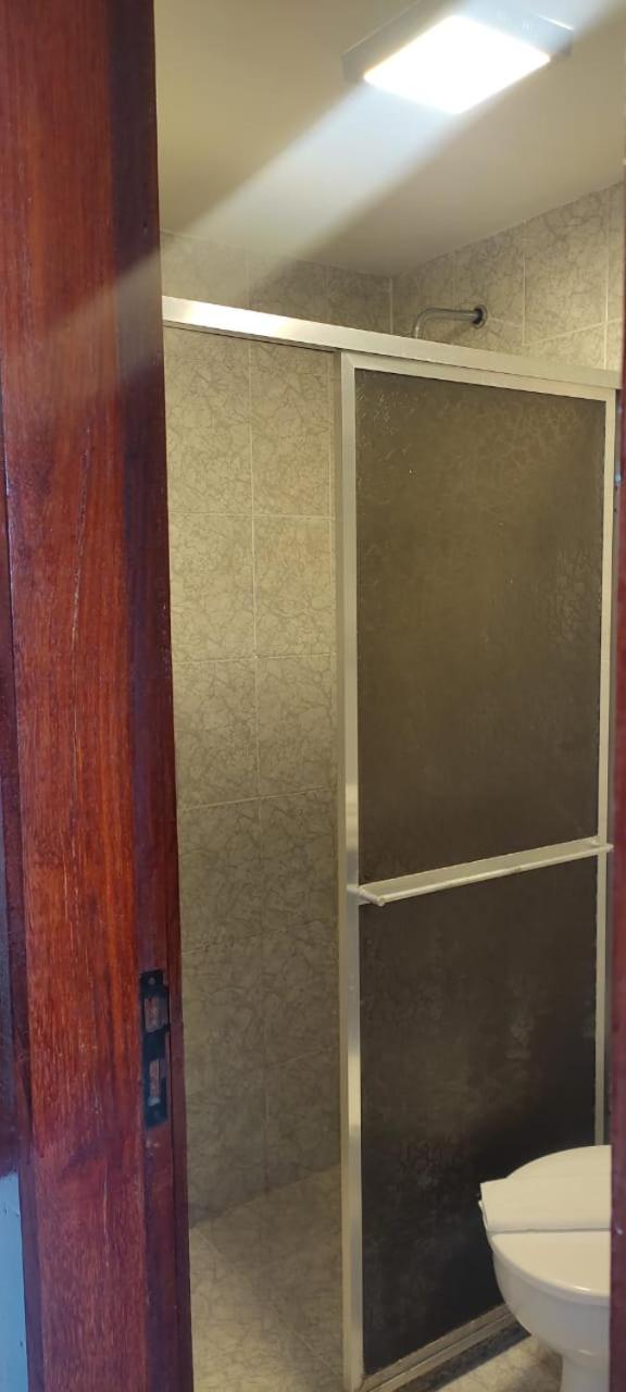 O banheiro com o vaso sanitário espremido entre o Blidex do box do chuveiro e a parede divisa com o quarto. Muito apertado e que atende somente as pessoas magras.