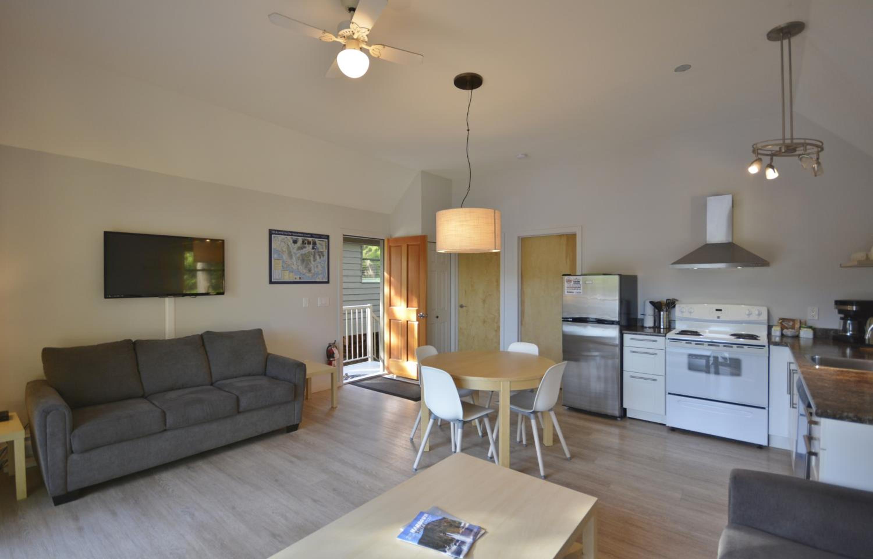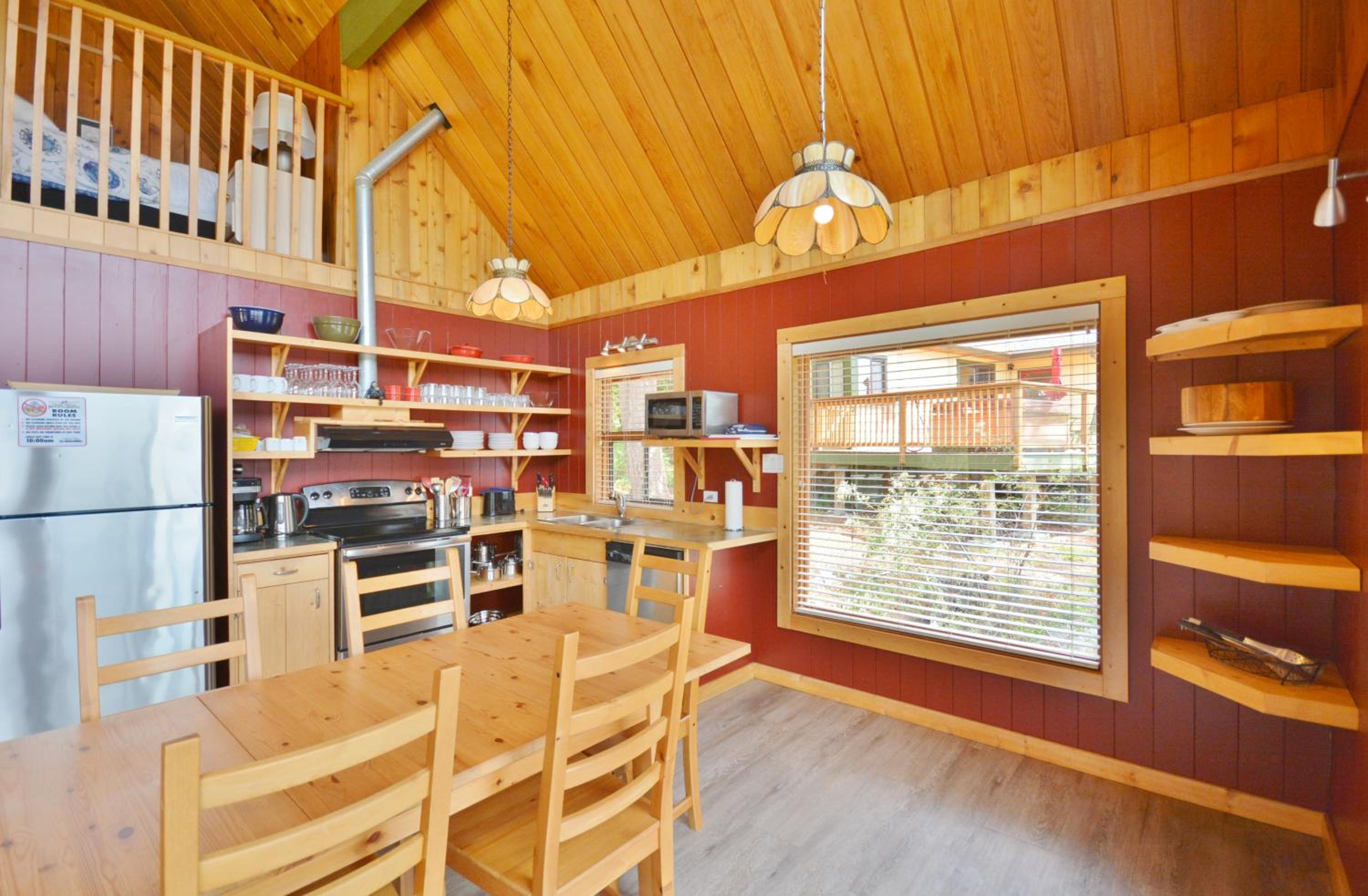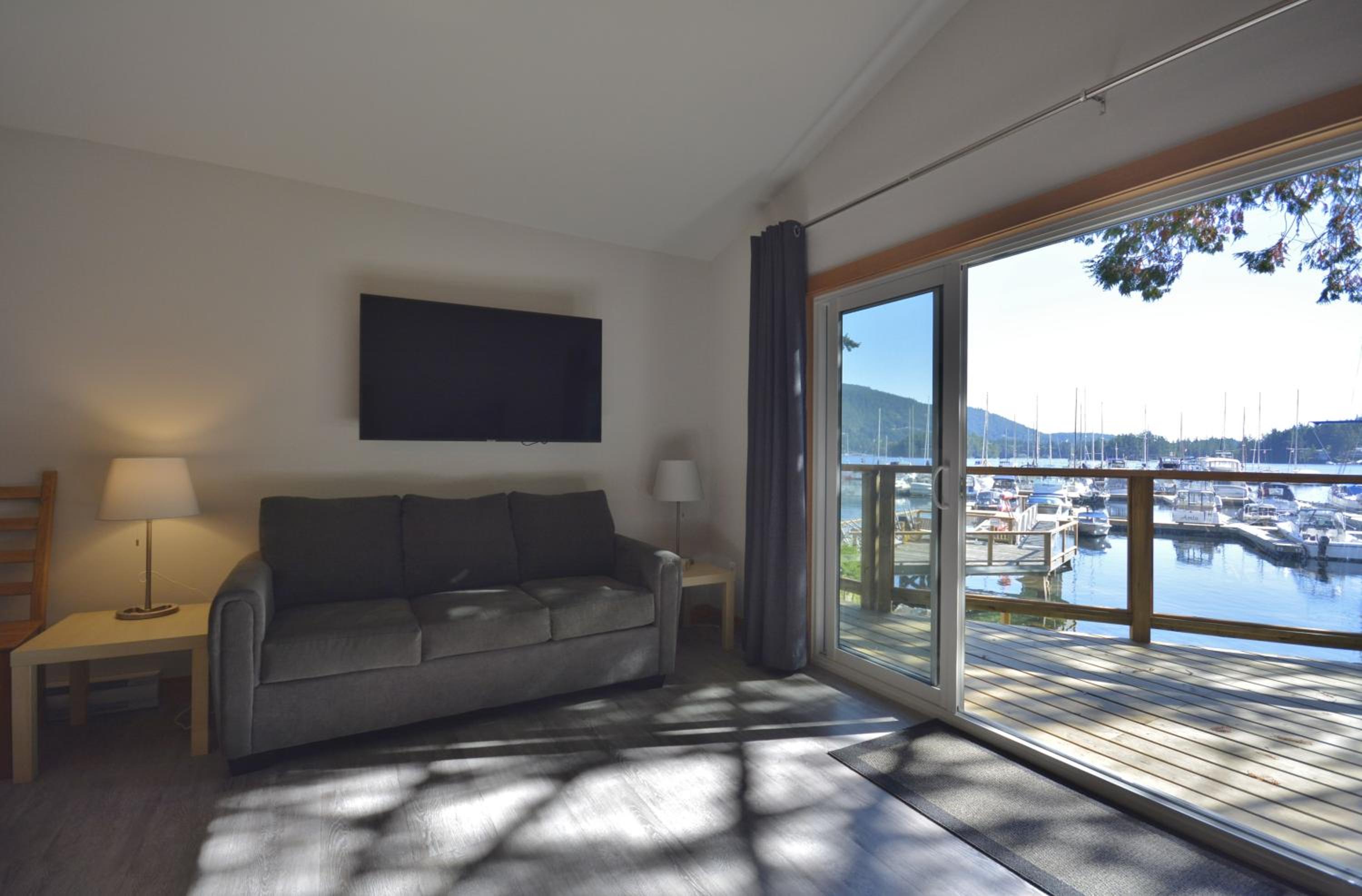 We loved the view from our oceanfront cabin overlooking the marina. The kitchen was extremely well equipped and the BBQ and table and chairs on the sundeck was a nice bonus. The grounds were well kept and the staff very friendly. Definitely bring your own food as its a long way around the harbor for restaurants or groceries.