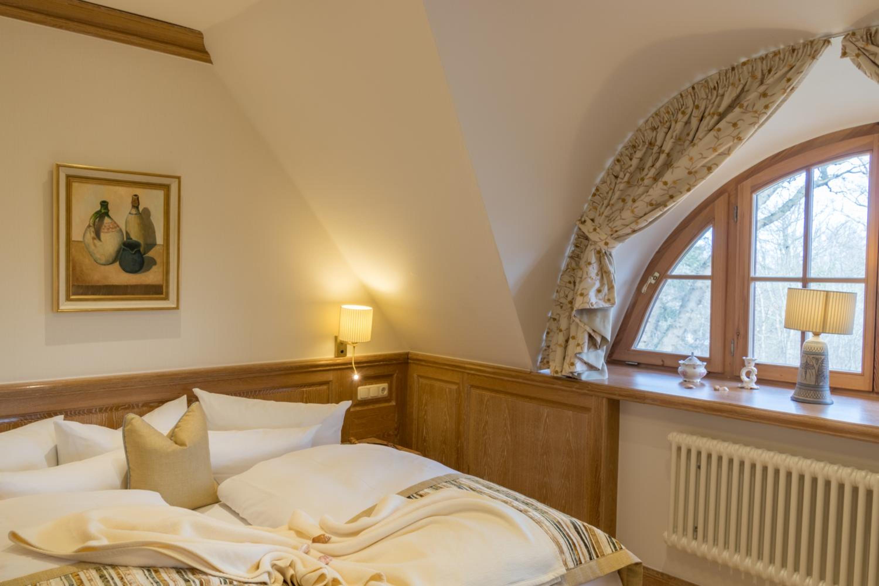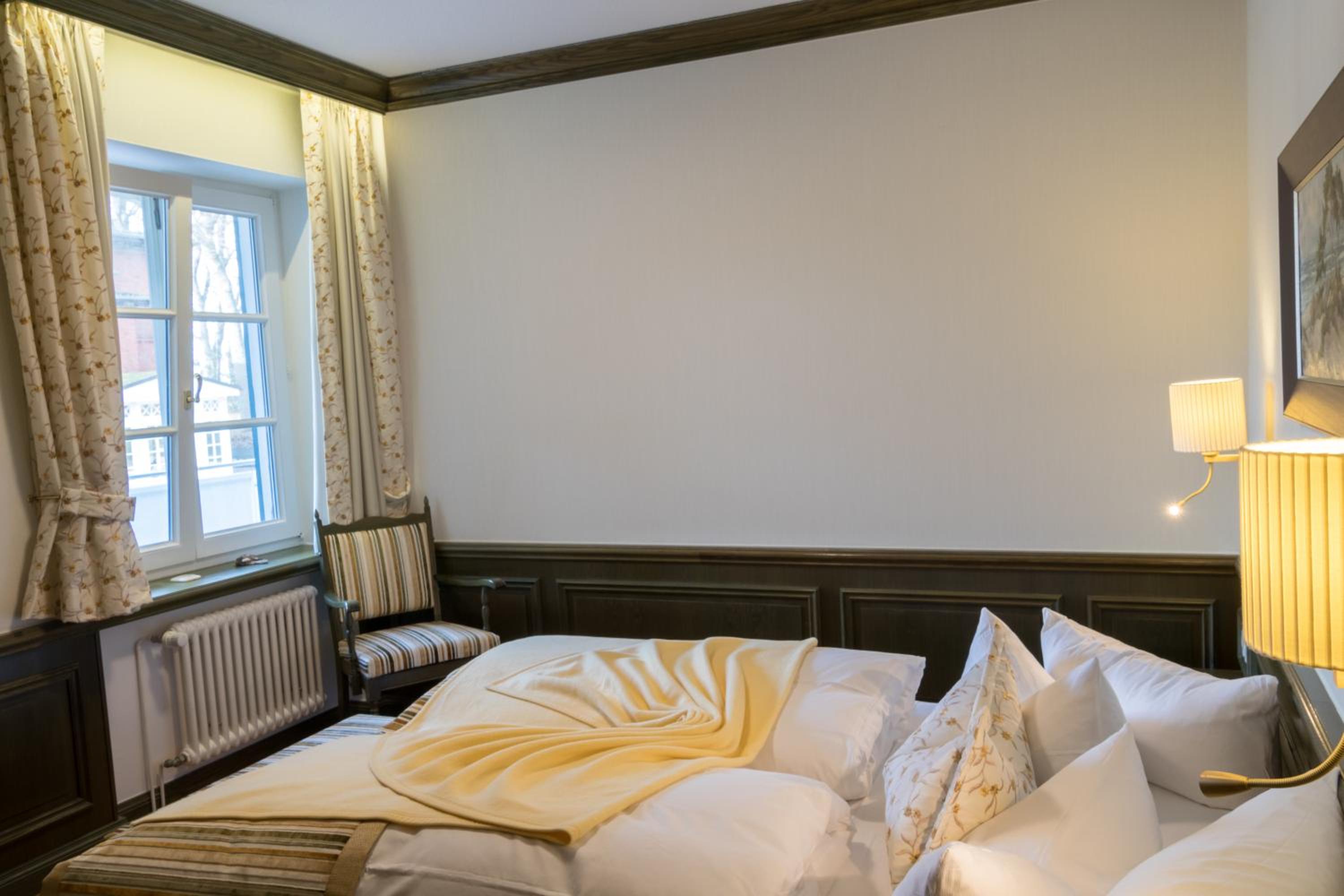 The Romantikhotel Fischerwiege stands out with its ceramic fireplace, iron spiral staircase, and seaside motifs, reflecting its location in an artists' colony.