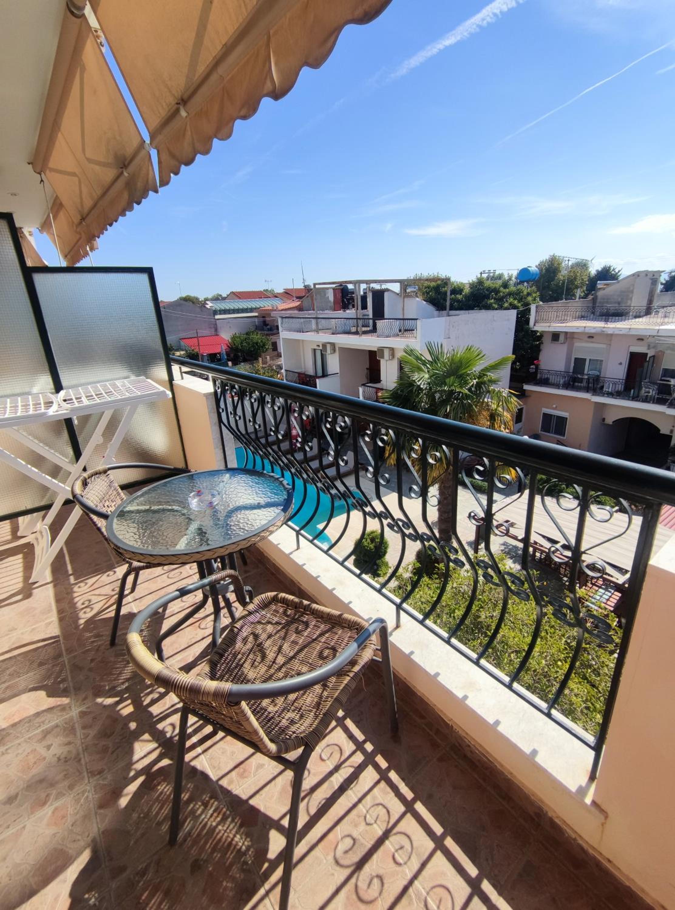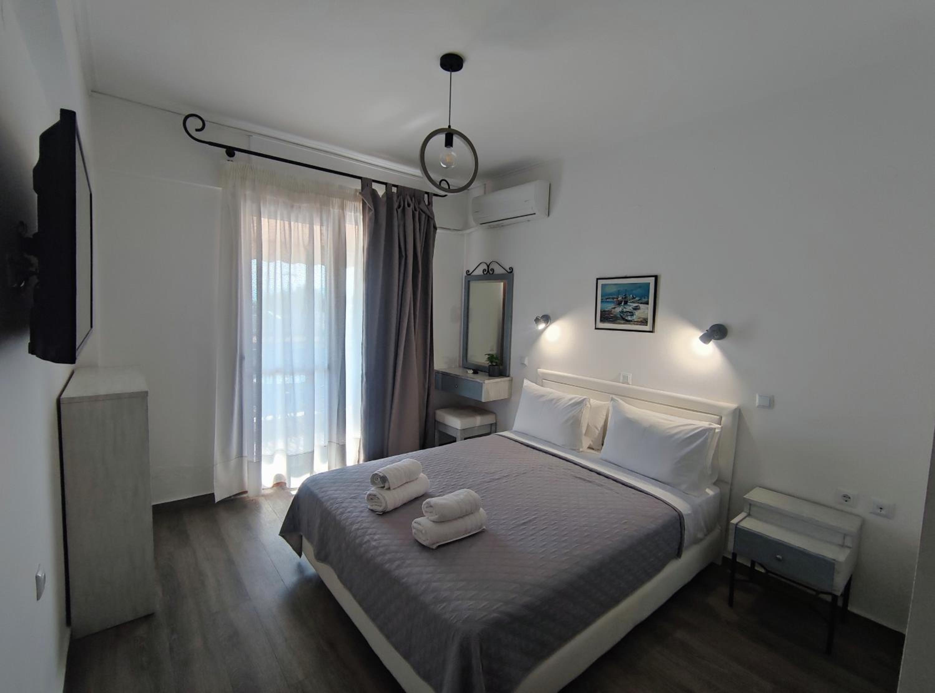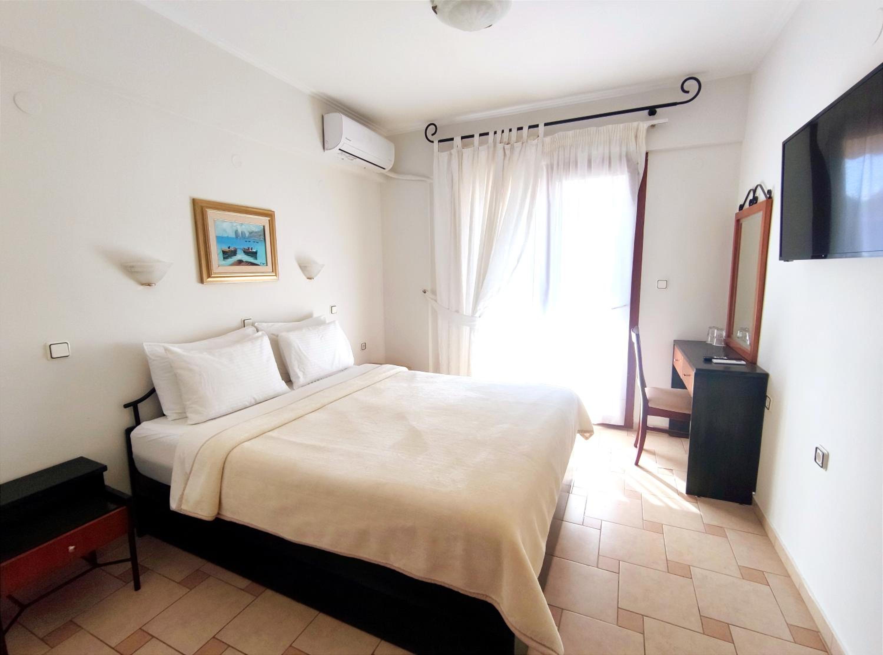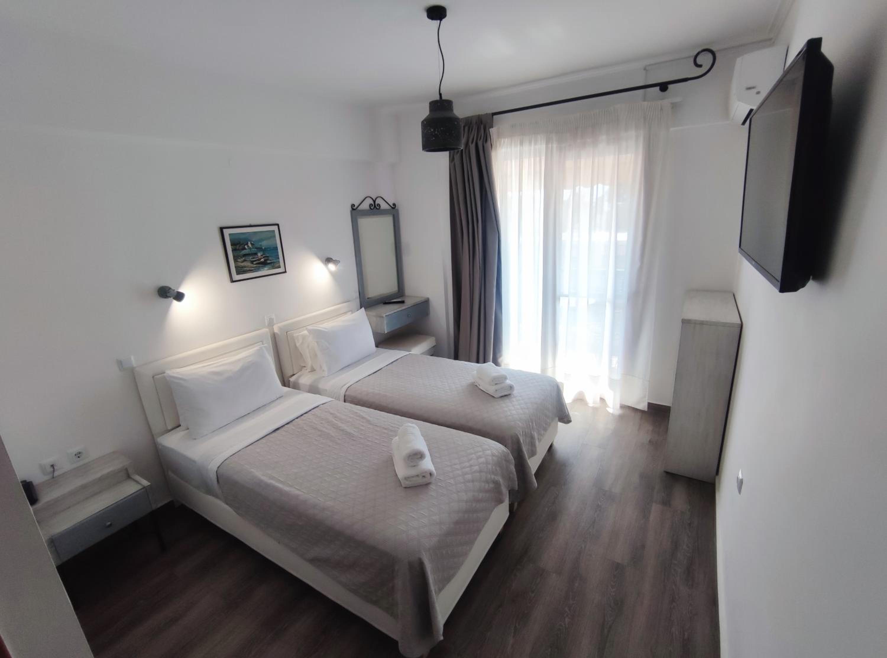 Luxurious Accommodations: Each room at Syrtaki Hotel offers a balcony with stunning views, a flat-screen TV, air conditioning, and a mini fridge.