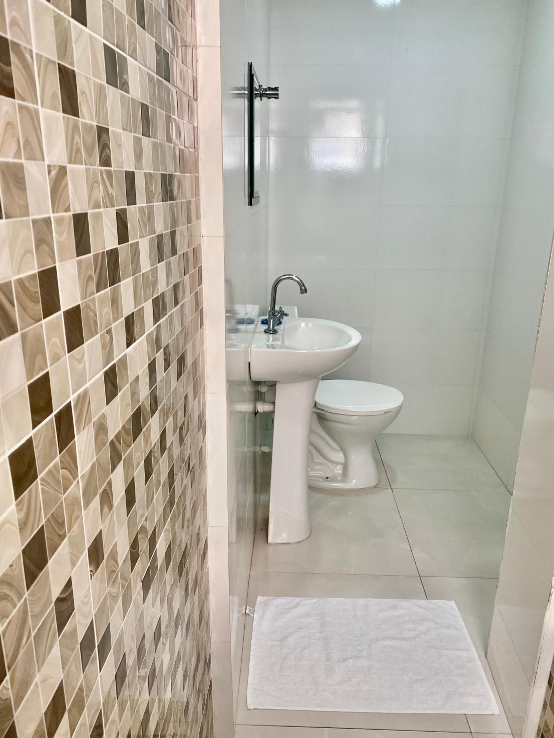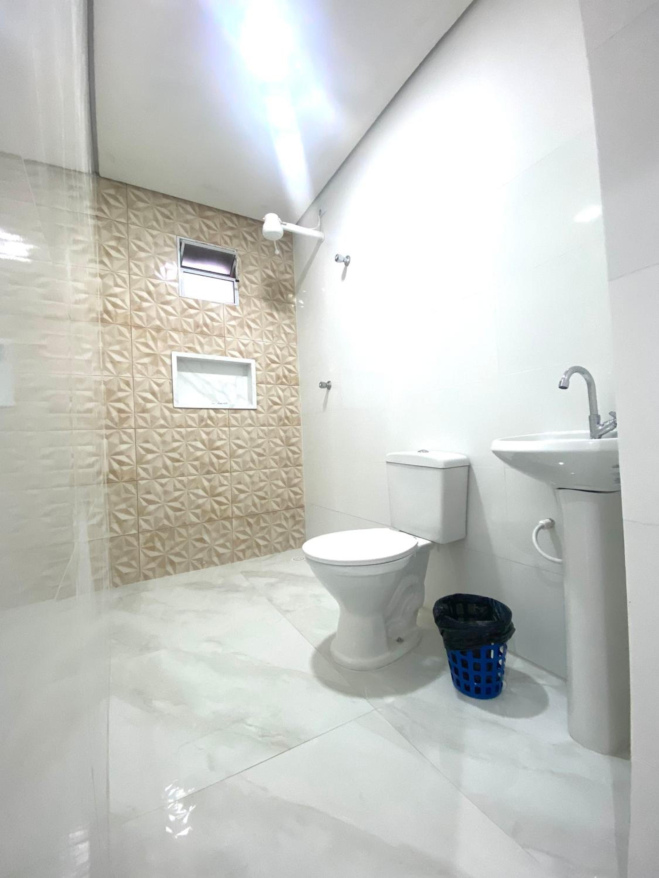 Apesar de ser separado o chuveiro do lavabo, o fato de nao ter tranca nem porta q isole os ambientes bem, talvez seja desconfortavel fazer as necessidades com outra pessoa no mesmo quarto. Faltou alguns intens simples, onde pendurar toalhas, no chuveiro e na pia.