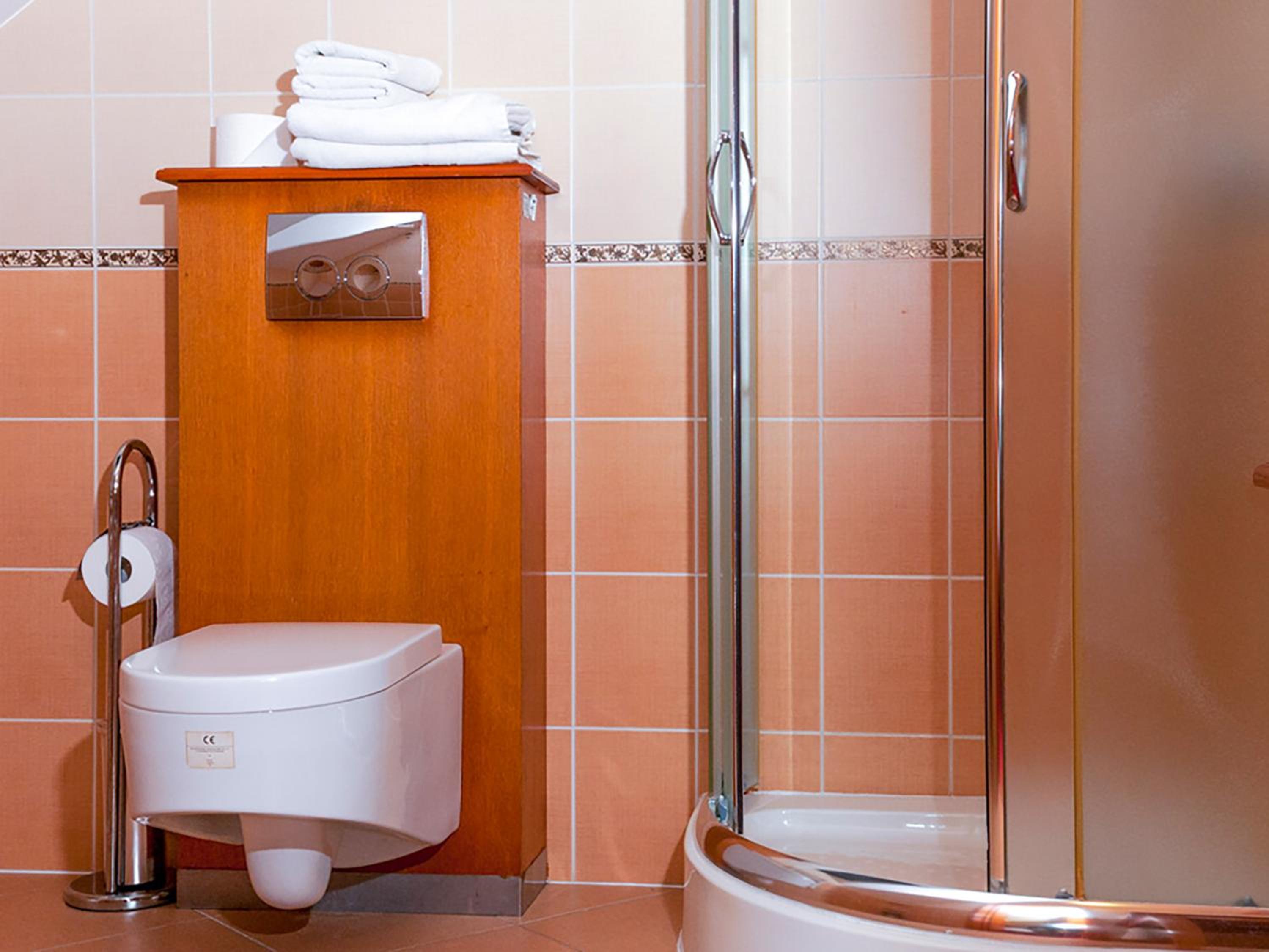 Drobne niedoróbki: opadający koszyk pod prysznicem, przytkaną kanalizacja, stara tapeta na ścianach.