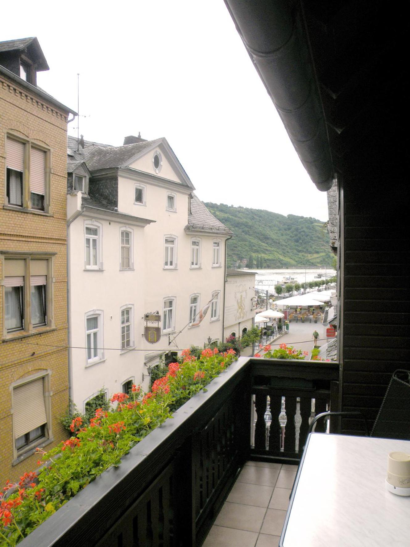Das Garni Hotel liegt in einer gemütlichen Fußgängerzone, der Rhein nur wenige Schritte entfernt. Blick vom Balkon auf die Burg. Eisdielen und Café, als auch ein kleiner „Supermarkt“. Das Hotel ist klein und gemütlich. Sehr netter Herr der uns empfangen hat. Super leckeres Frühstück mit frischem Rührei.
