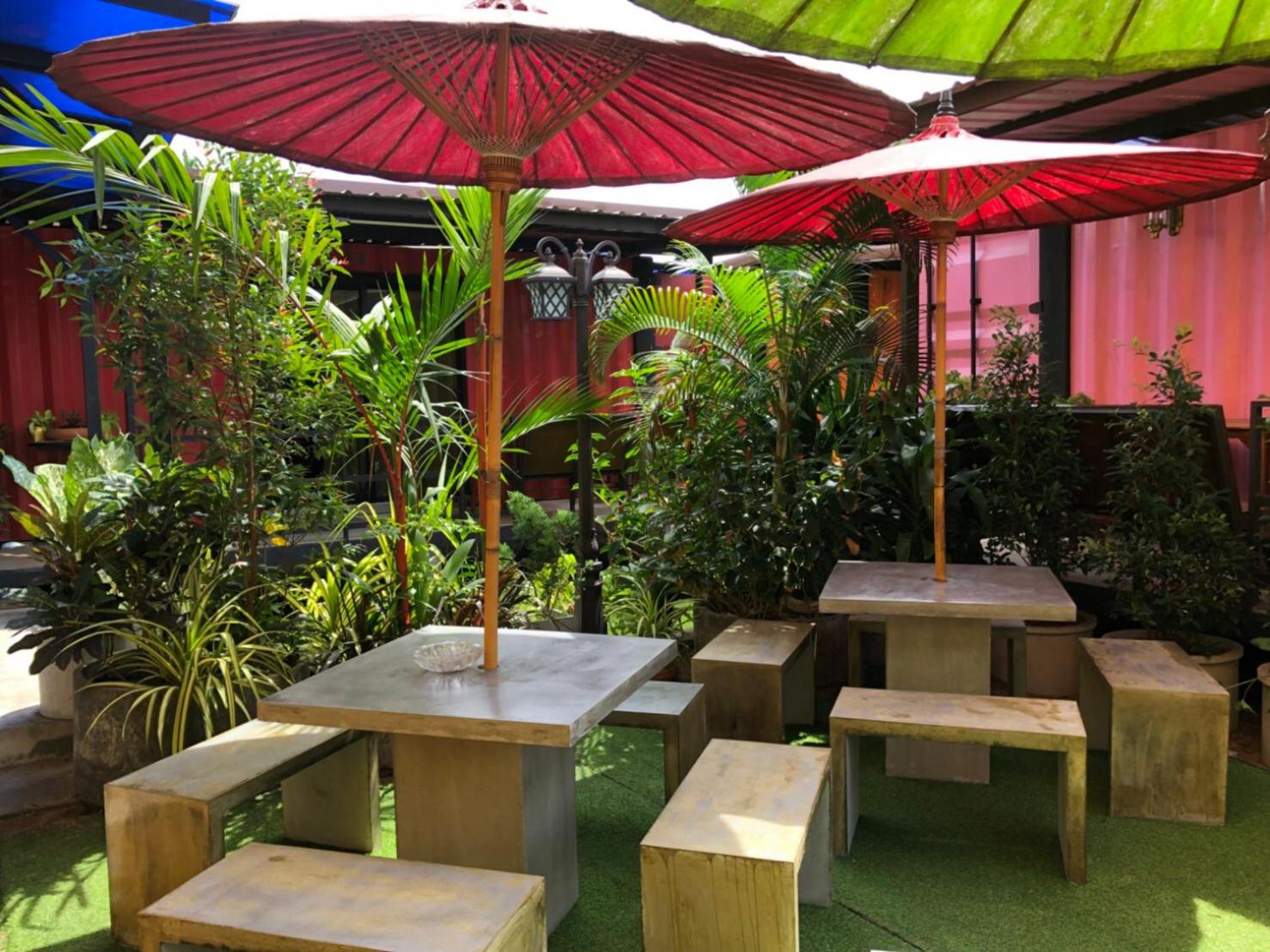 Coole Idee mit den Containern um einen Teich herum. Angenehm eingerichtet.