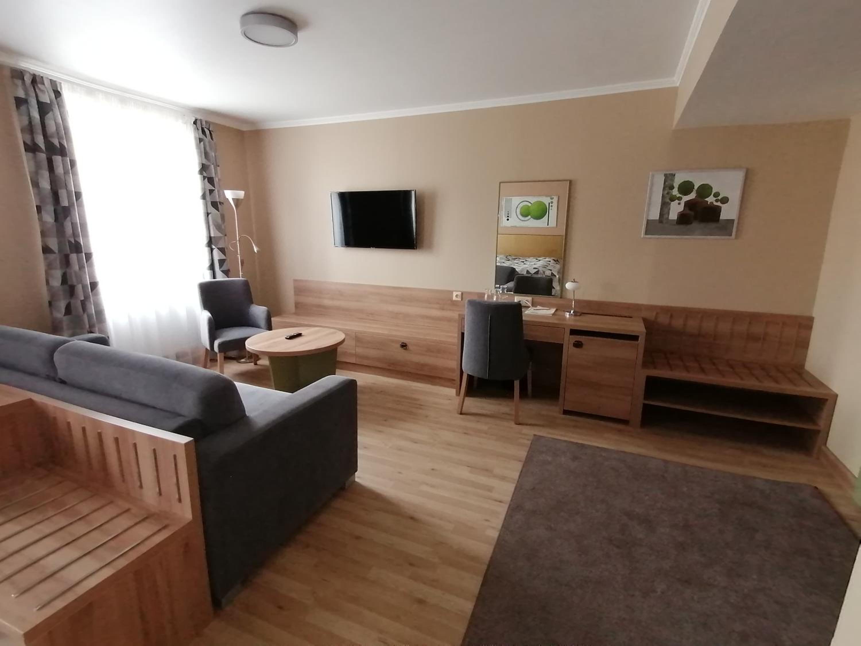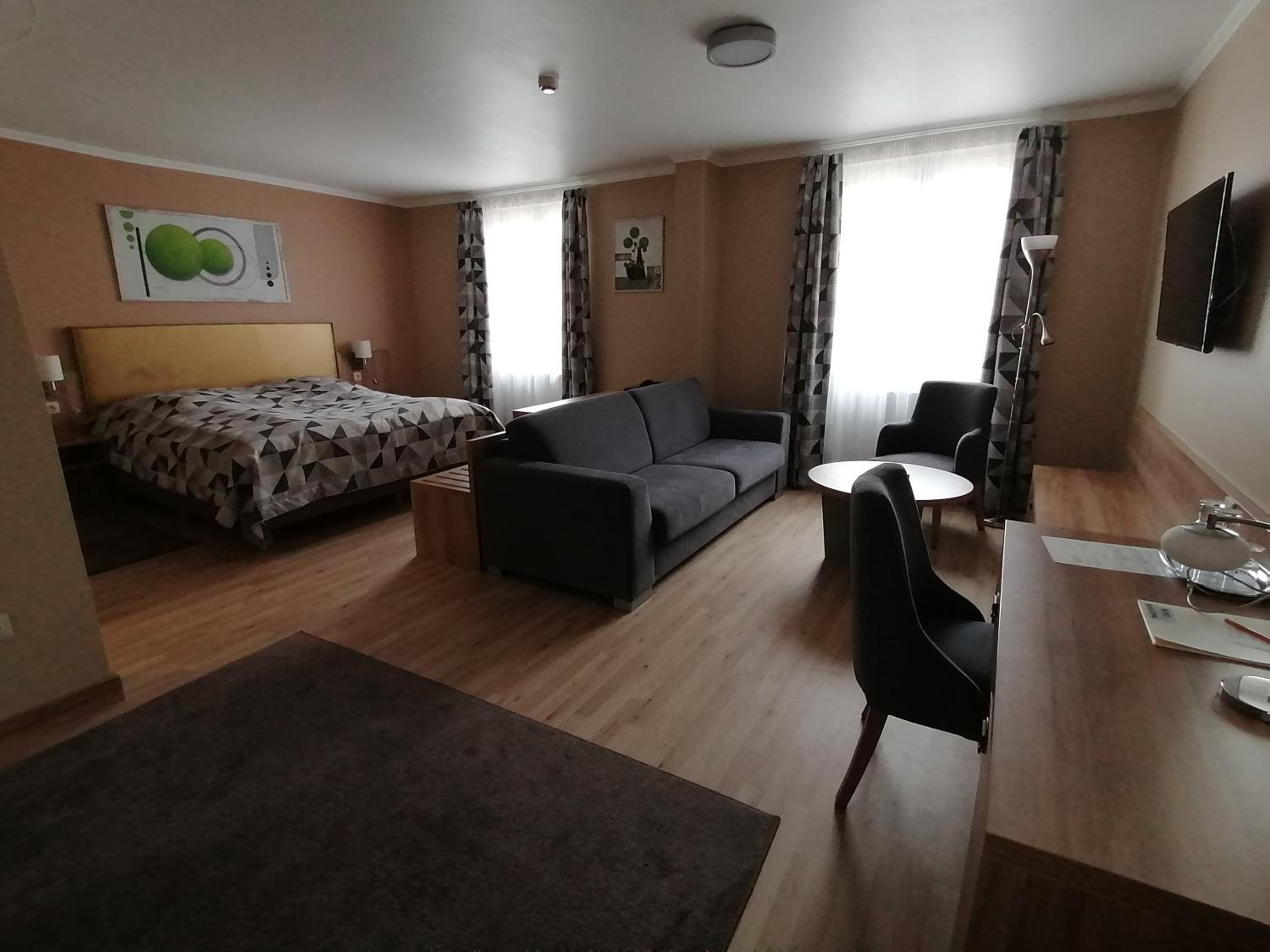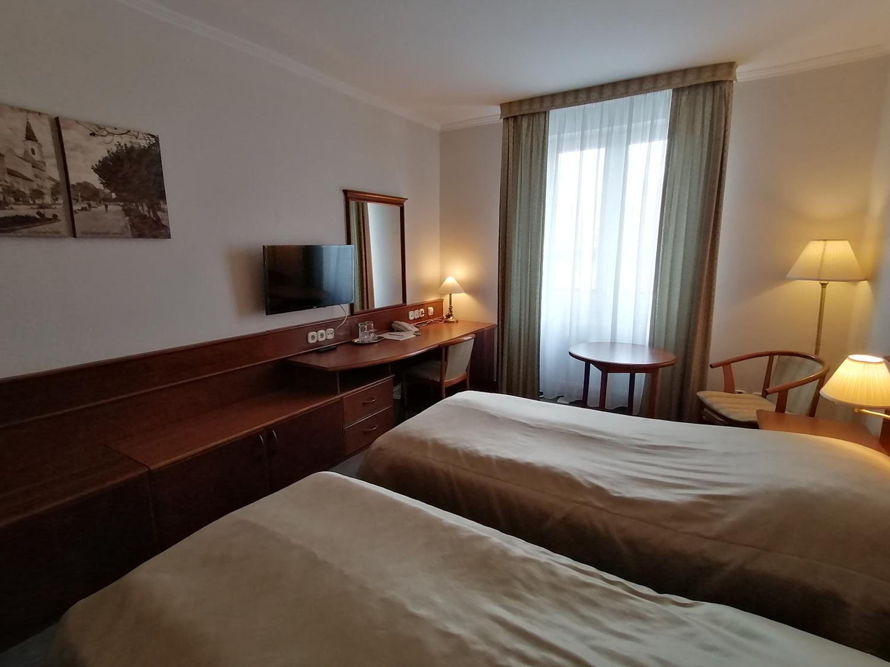 The hotel is perfectly located for a visit to Zalaegerszeg with parking on the property. The hotel itself is extremely comfortable and friendly with good food. The desk staff speak excellent English. Our room was surprisingly large and for a change (a very pleasant change in modern hotels) had a good ceiling light so we were well illuminated for a change.