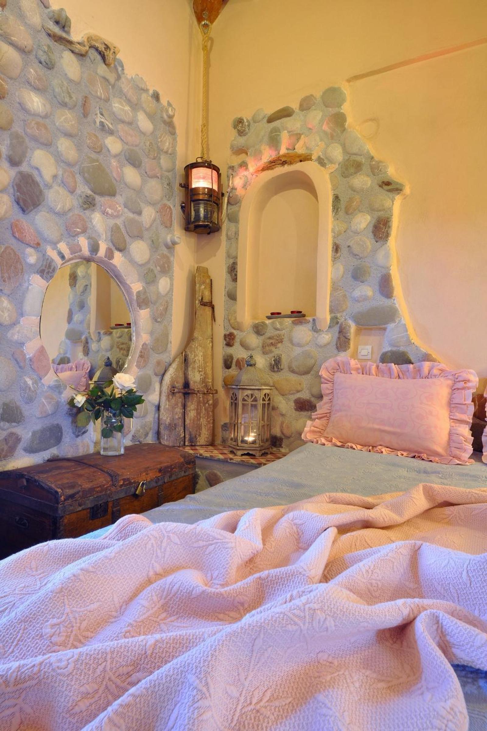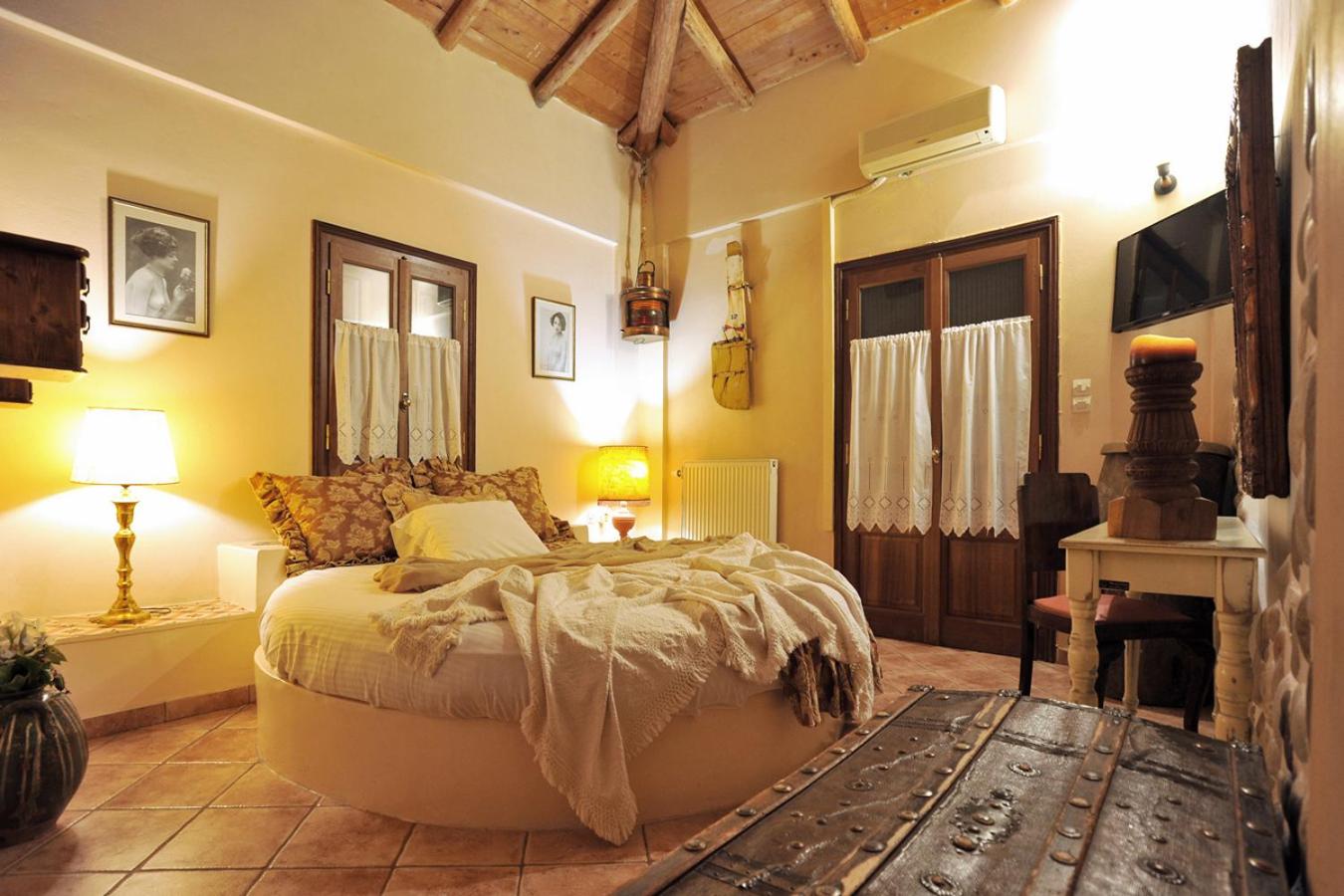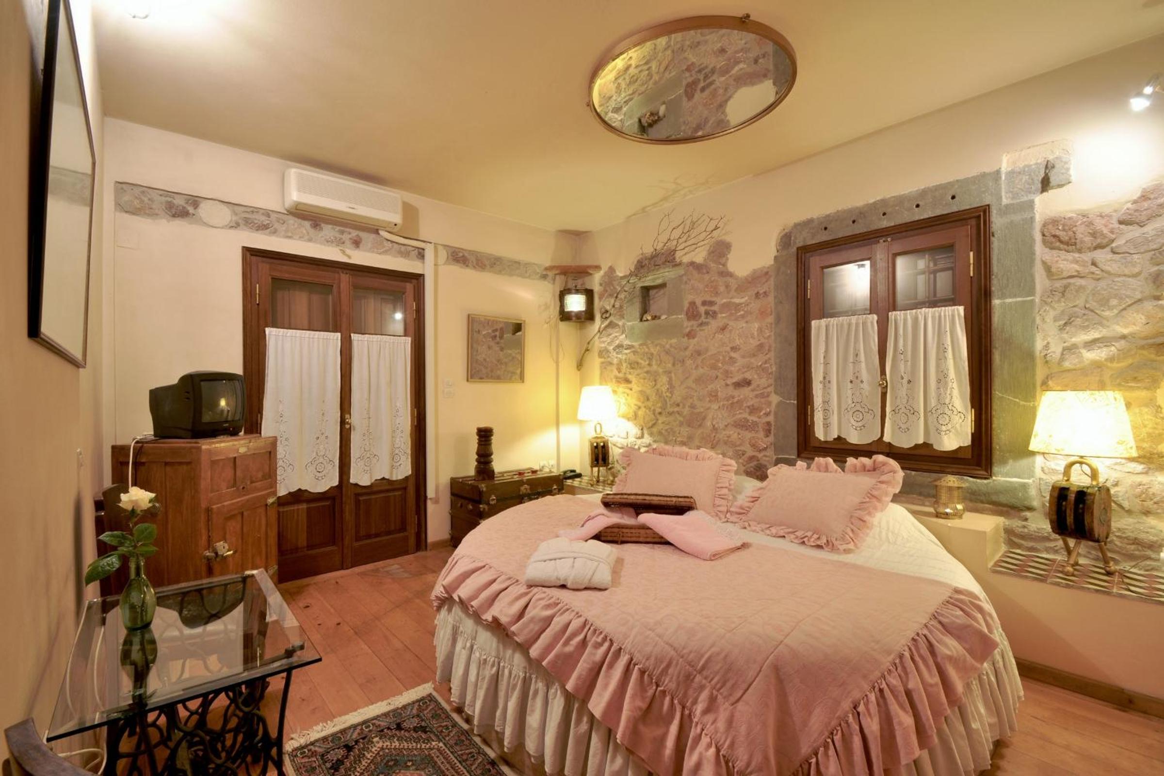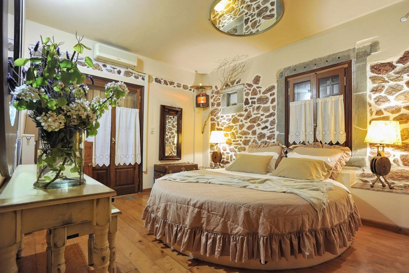 Archontiko Art Hotel offers romantically decorated air-conditioned rooms with unique features like stone or painted walls, and round or boat-shaped beds. Each room includes a balcony and modern amenities such as a flat-screen TV, refrigerator, and free WiFi.