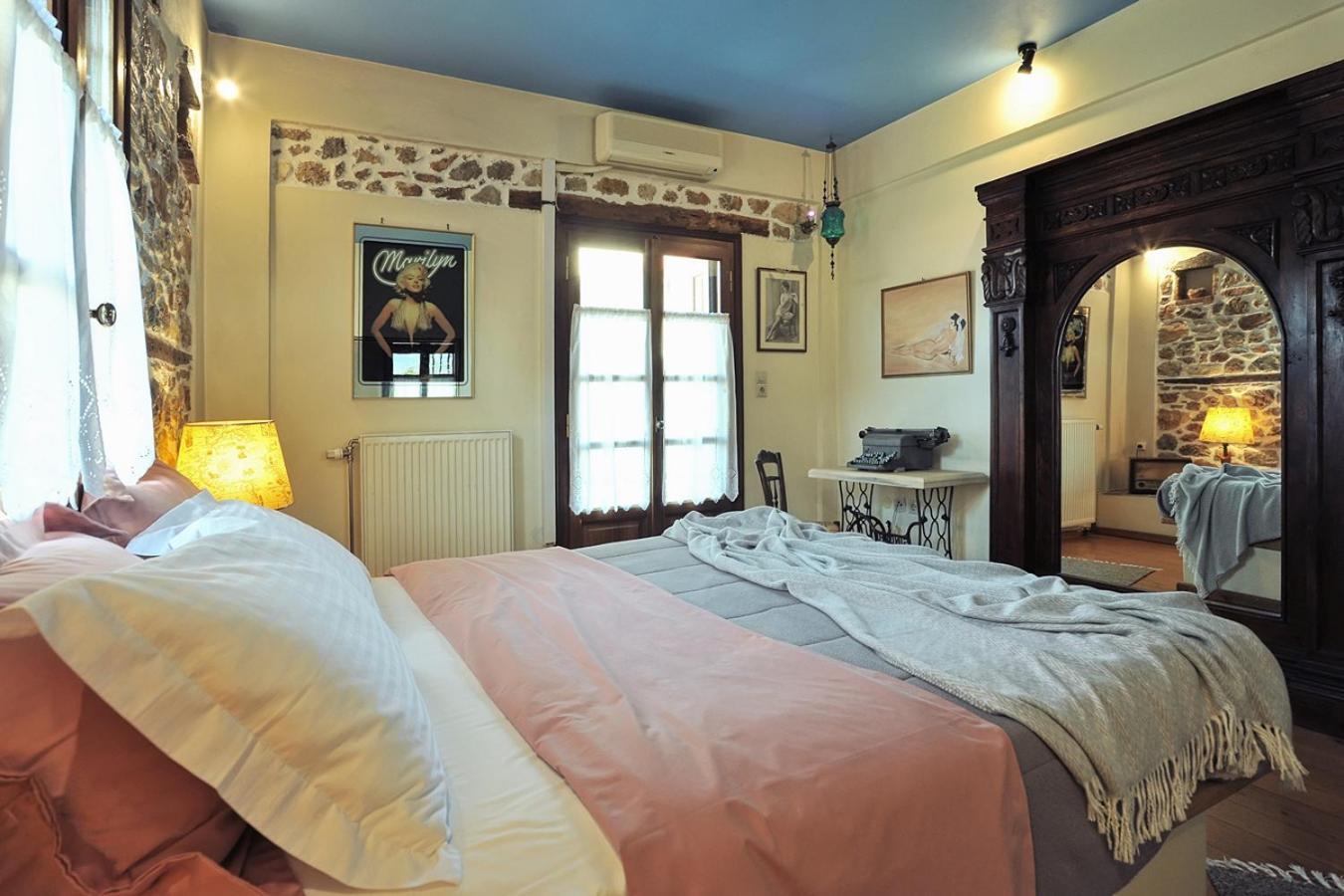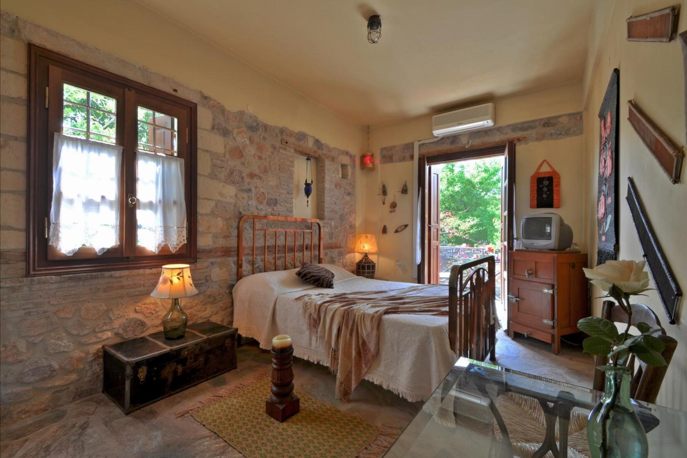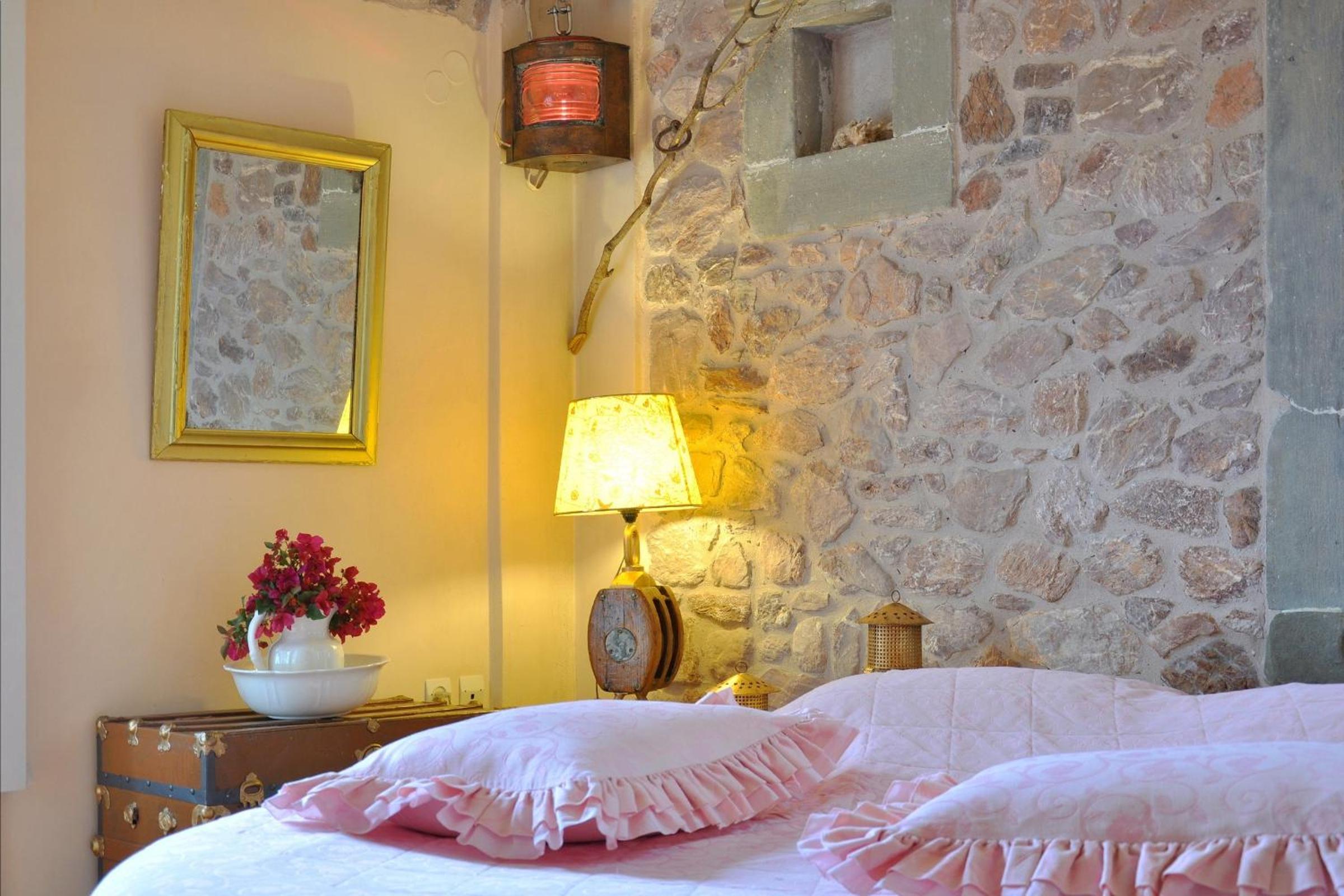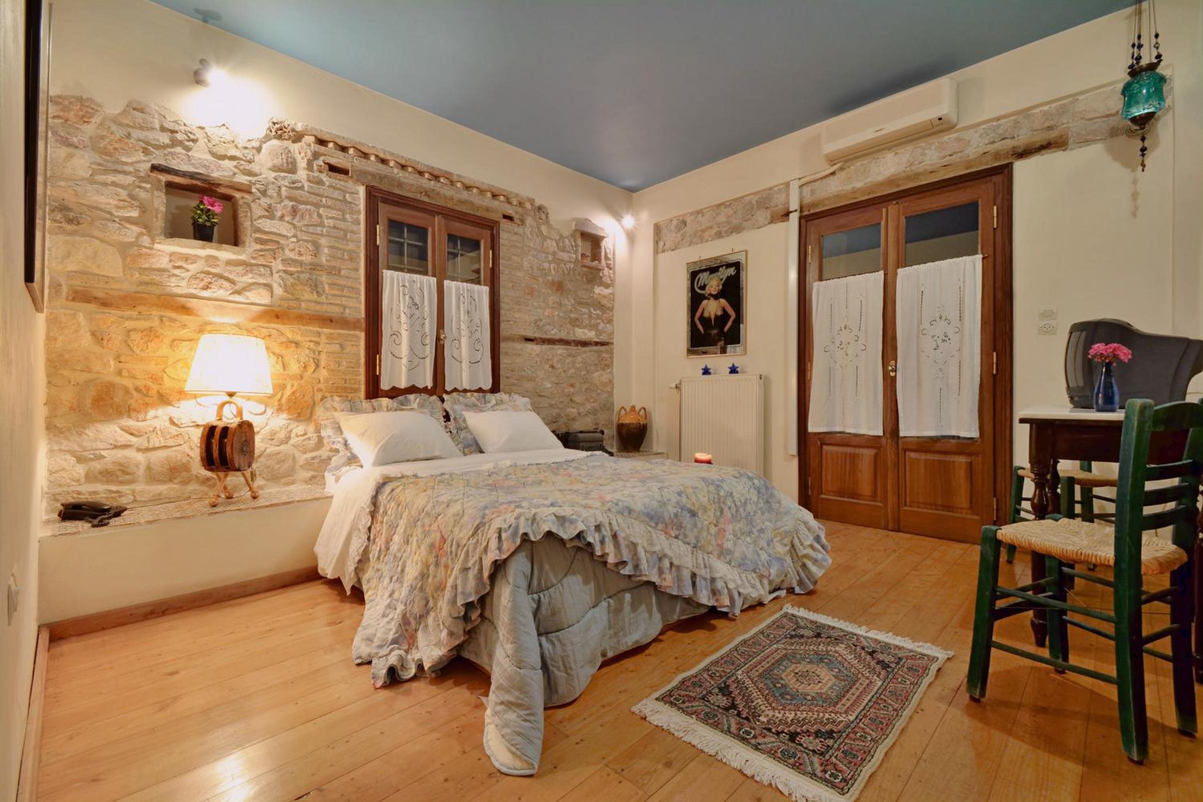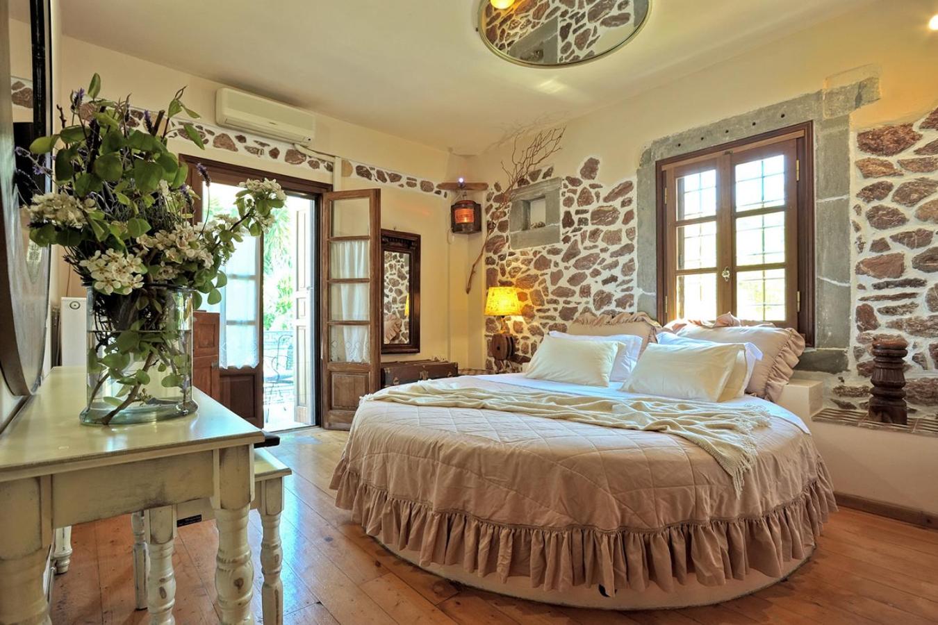Archontiko Art Hotel offers romantically decorated air-conditioned rooms with unique features like stone or painted walls, and round or boat-shaped beds. Each room includes a balcony and modern amenities such as a flat-screen TV, refrigerator, and free WiFi.