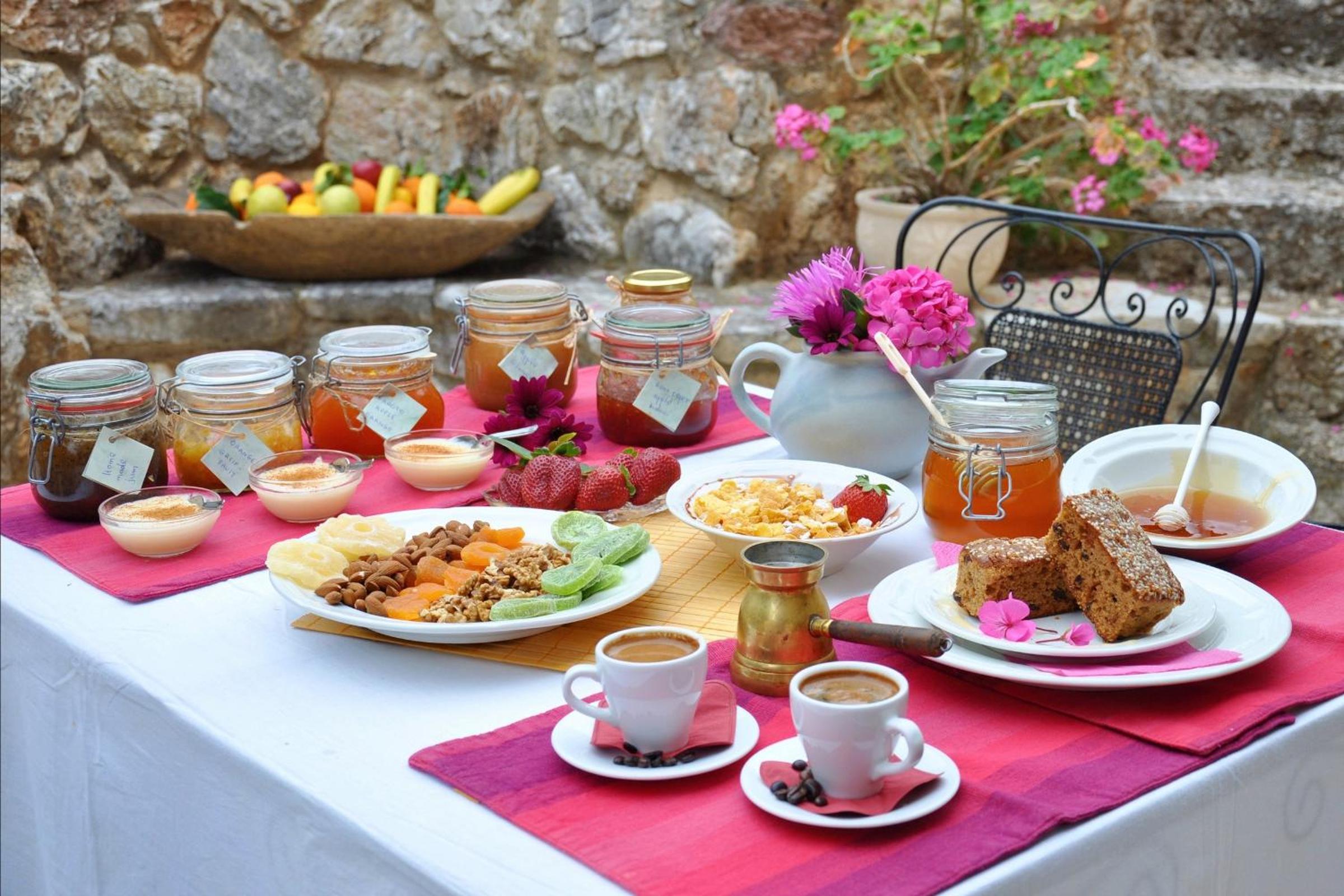 Start your day with a delightful Greek breakfast served in the charming stone-paved courtyard or cozy dining area by the fireplace. Indulge in homemade marmalades, pies, and other local delicacies made fresh daily with ingredients from the region.