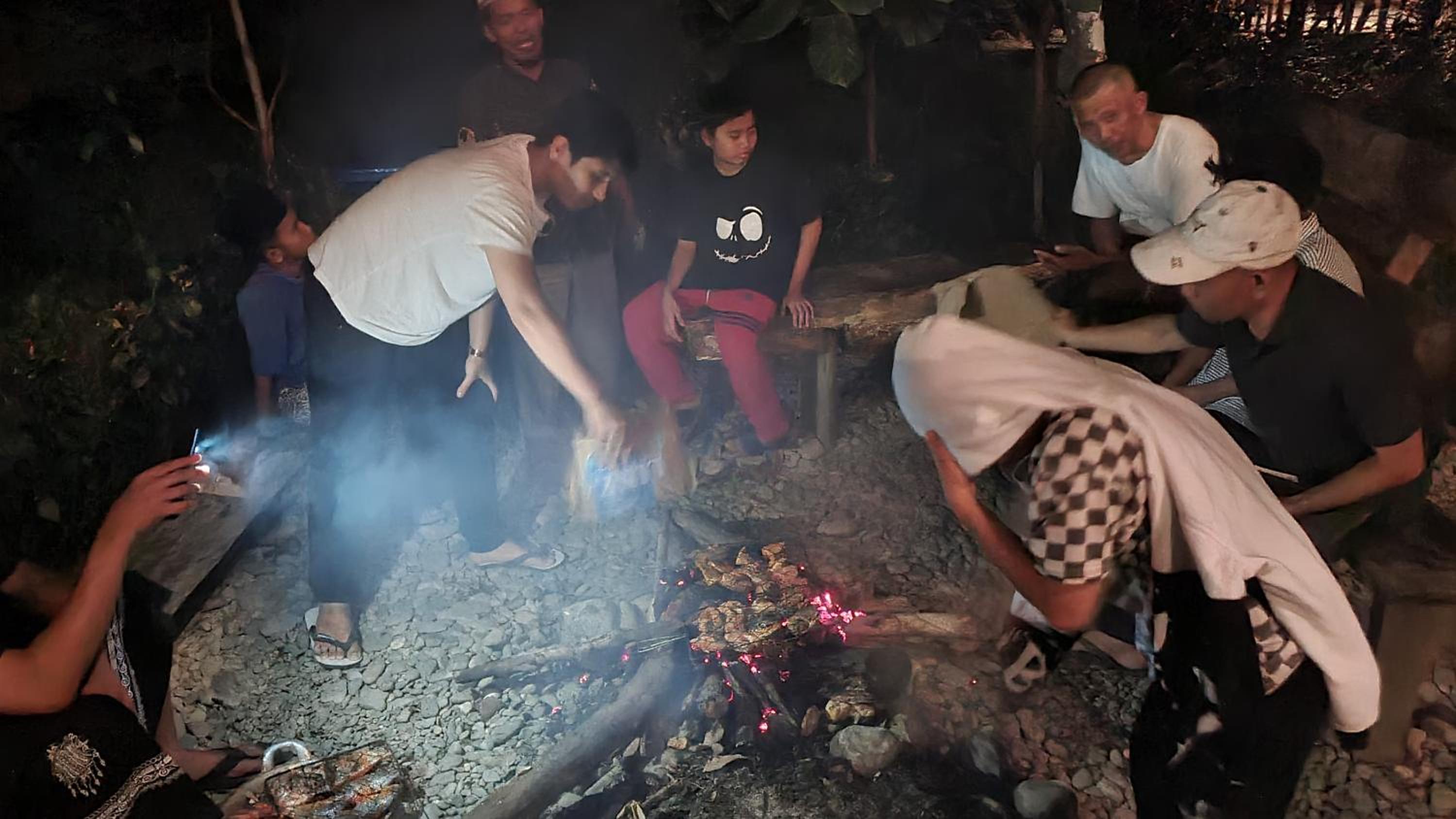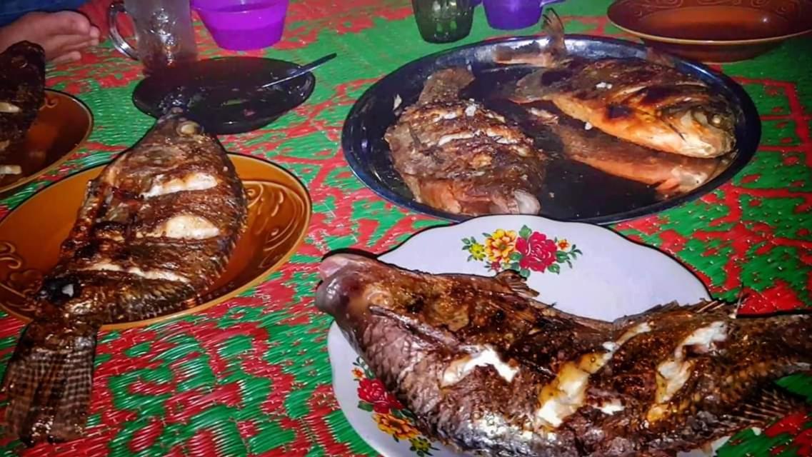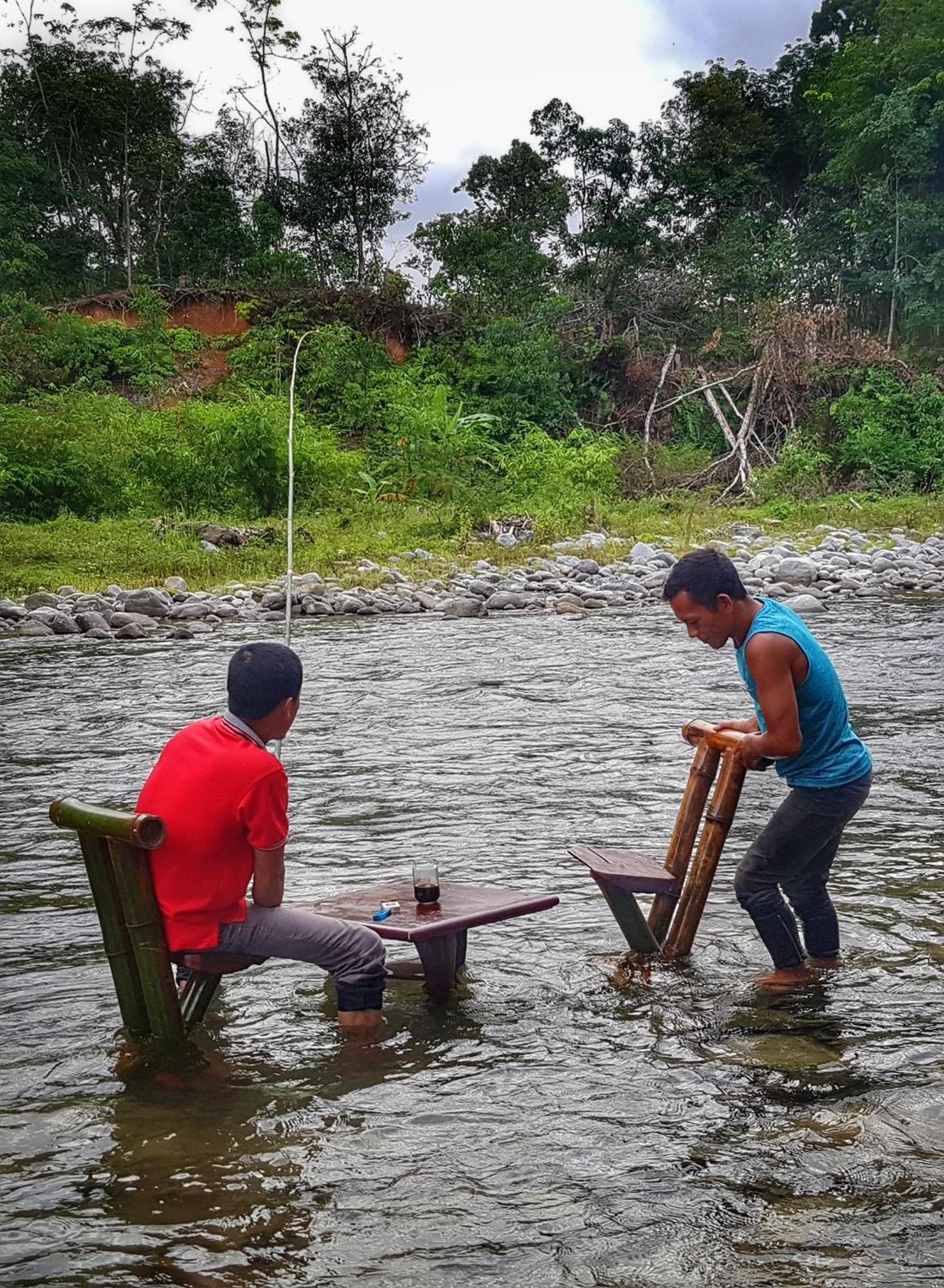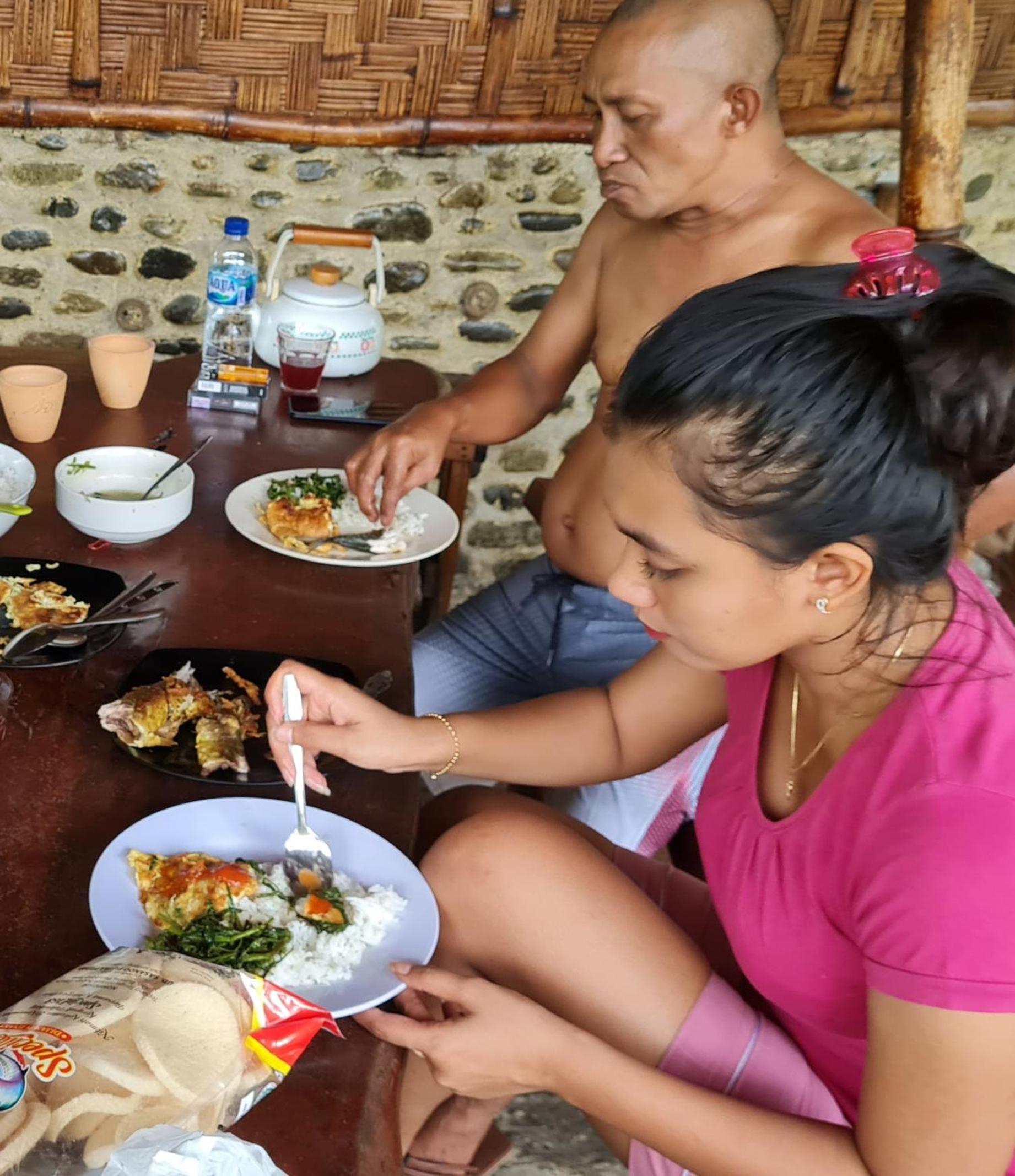 Sukma, de eigenaresse, haar man en hun zoon. De ligging aan het water.