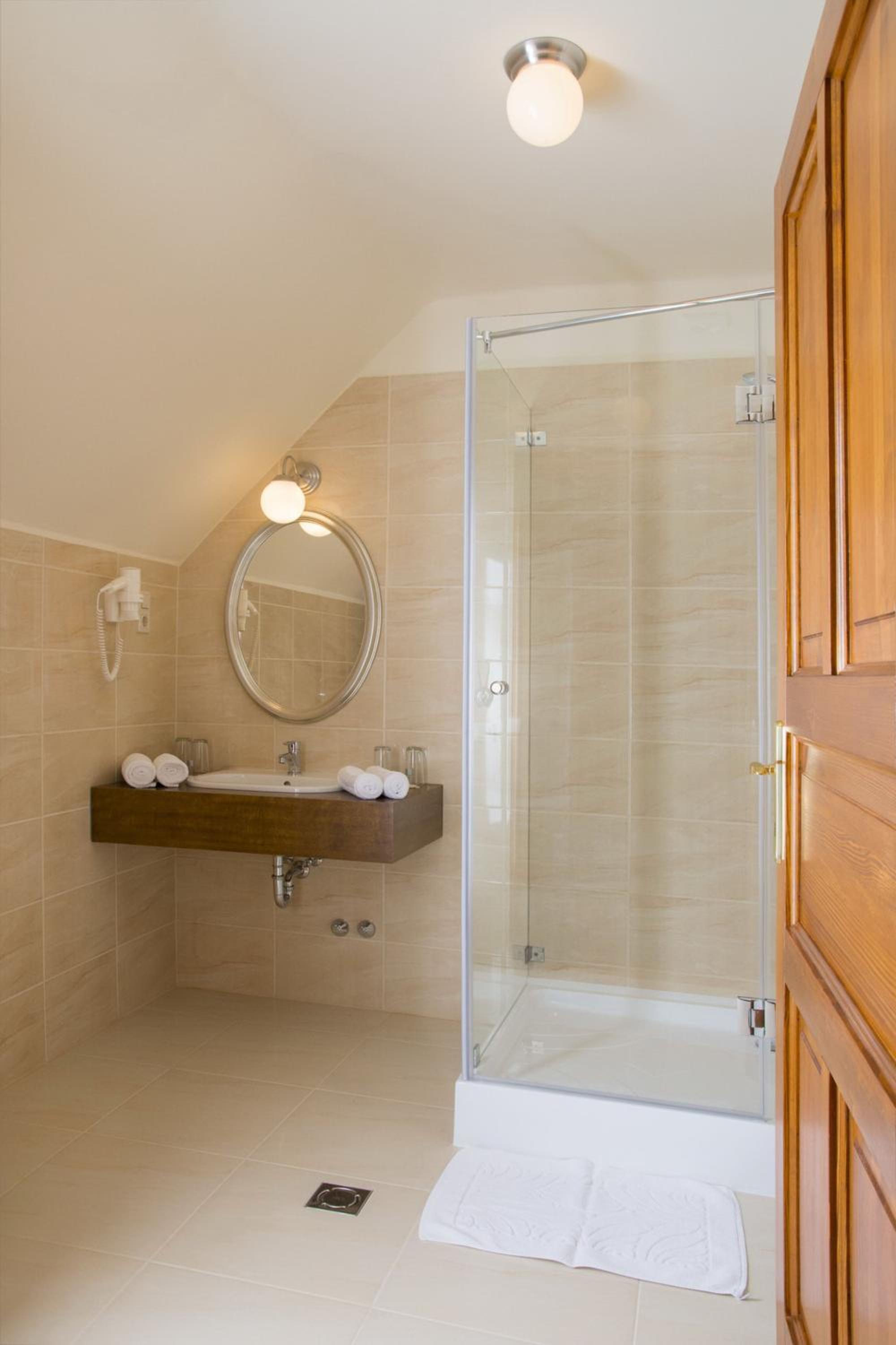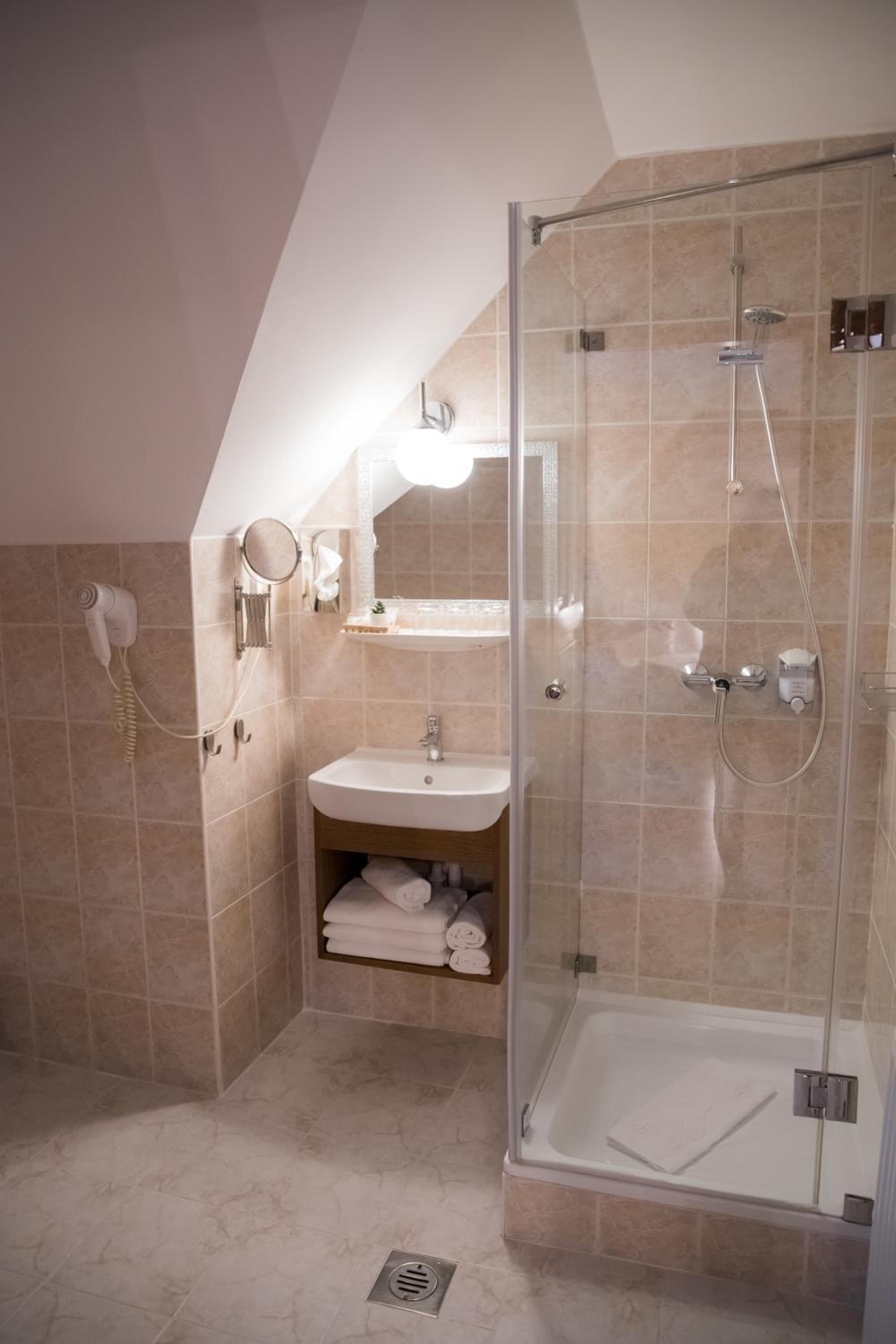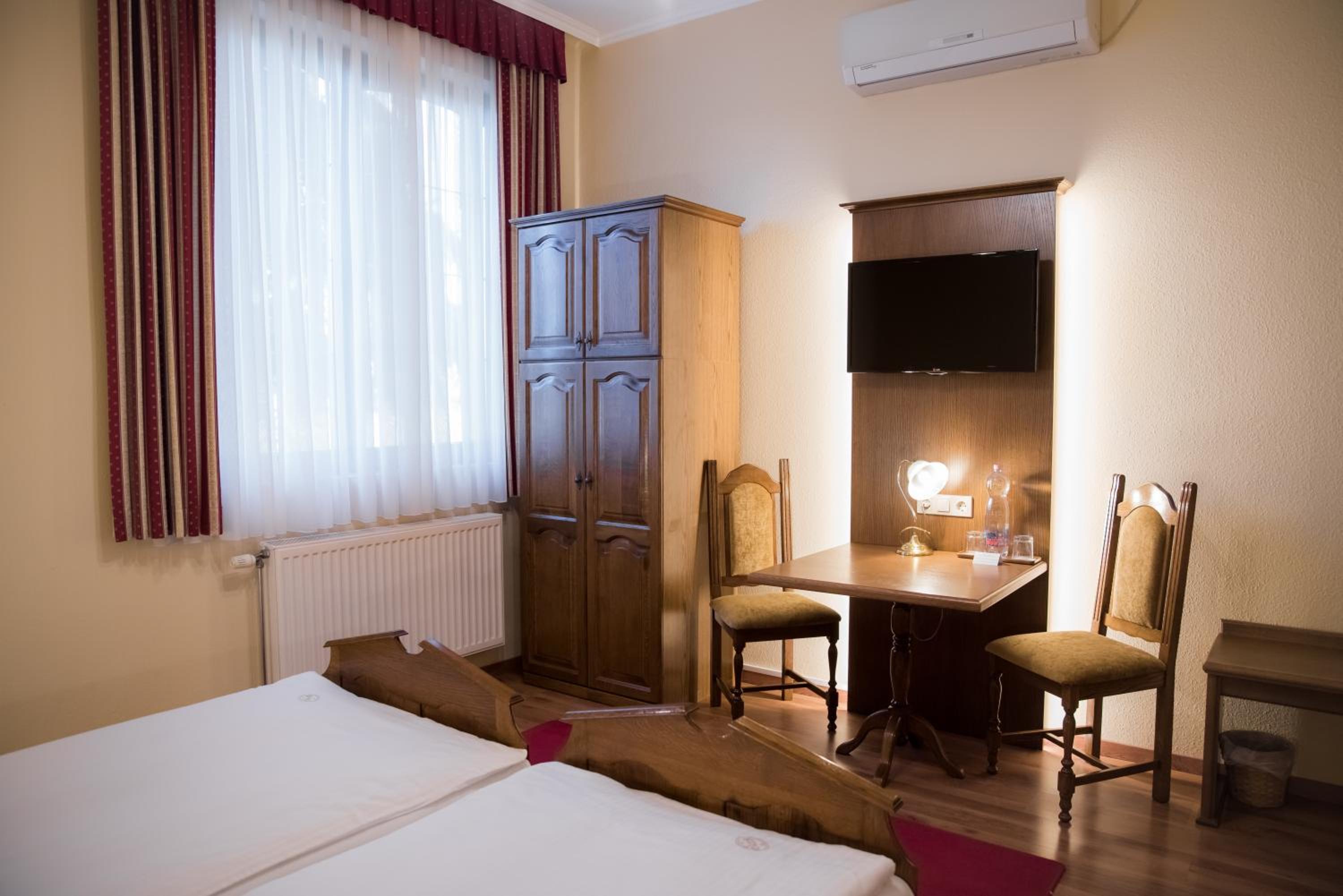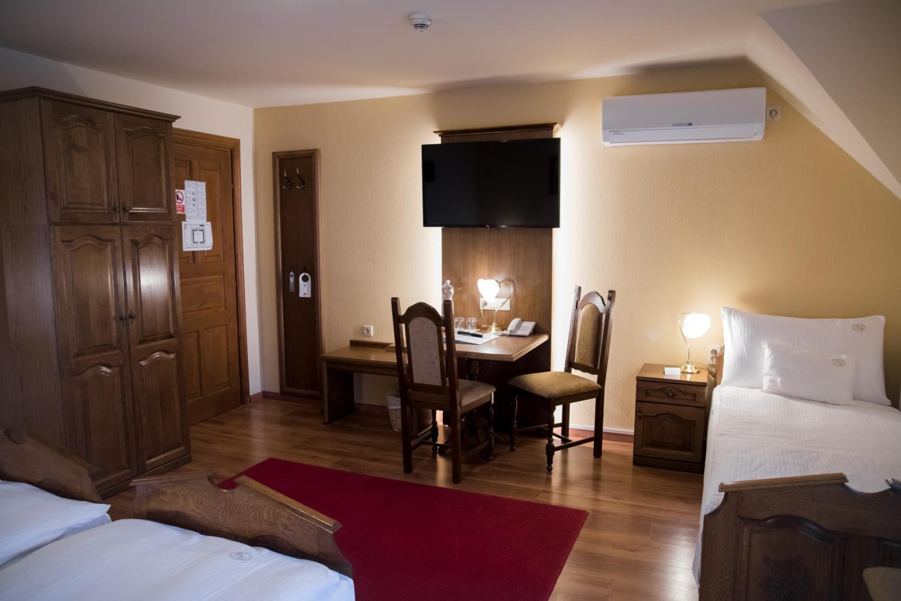 Each room at Vinum Hotel is equipped with modern conveniences including air conditioning, cable TV, and a private bathroom with a shower and hairdryer, ensuring a comfortable stay.