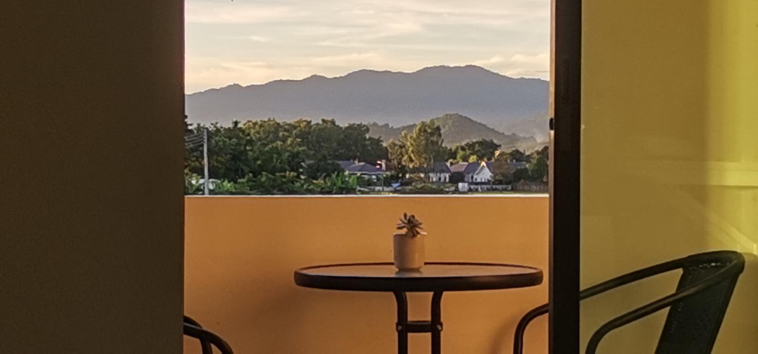 Luxurious Rooms with Mountain View Balconies: Enjoy a relaxing stay in our rooms with balconies offering picturesque mountain views. Each room is equipped with modern amenities including a kettle, private bathroom, and flat-screen TV for your comfort.