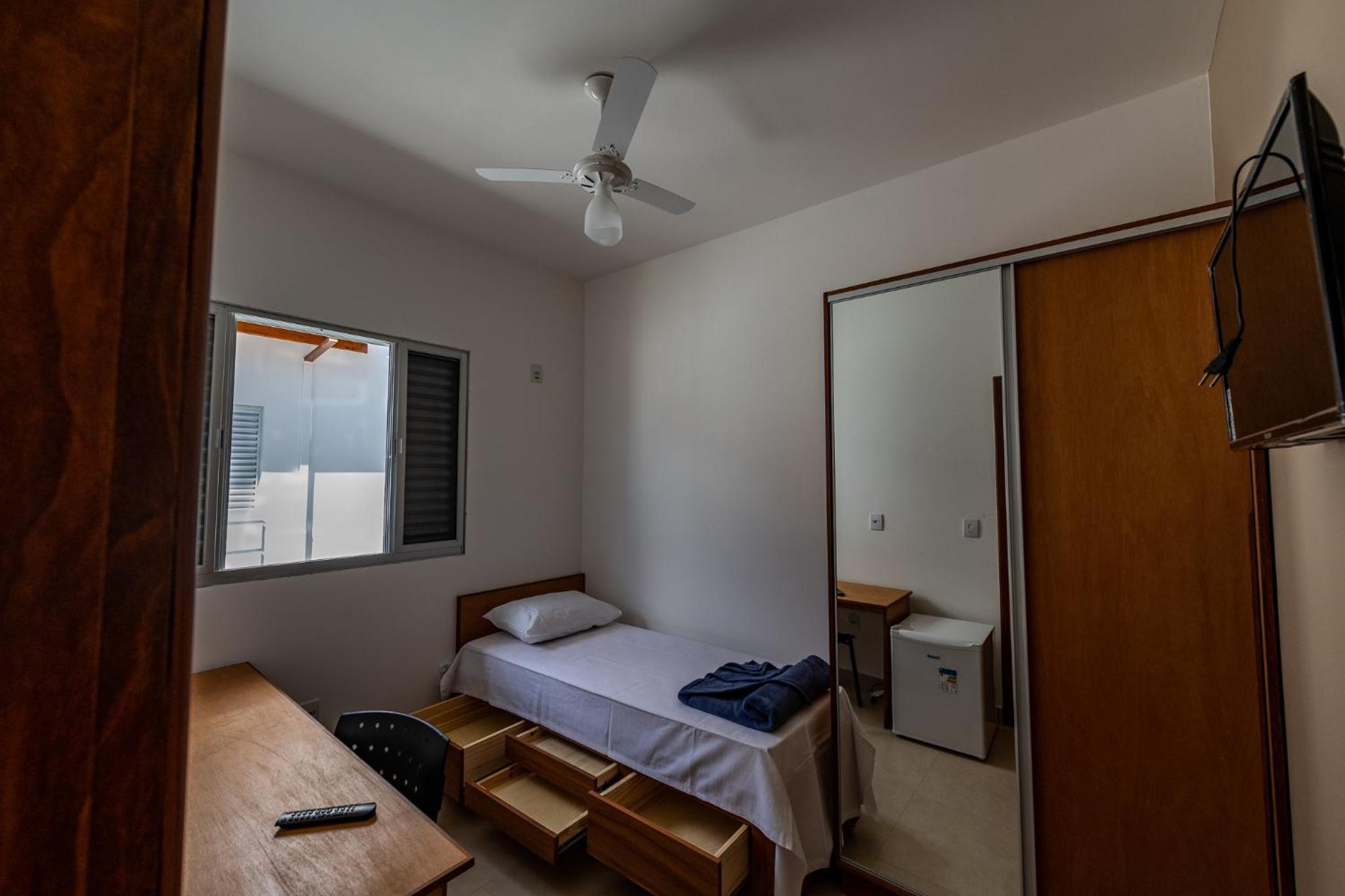 Quarto individual , com TV e ventilador de teto, guarda roupa, tudo funcionando corretamente. Banheiro se torna privativo, a cada dois quarto um banheiro , possui fechamento de porta externa para cada dois quartos.