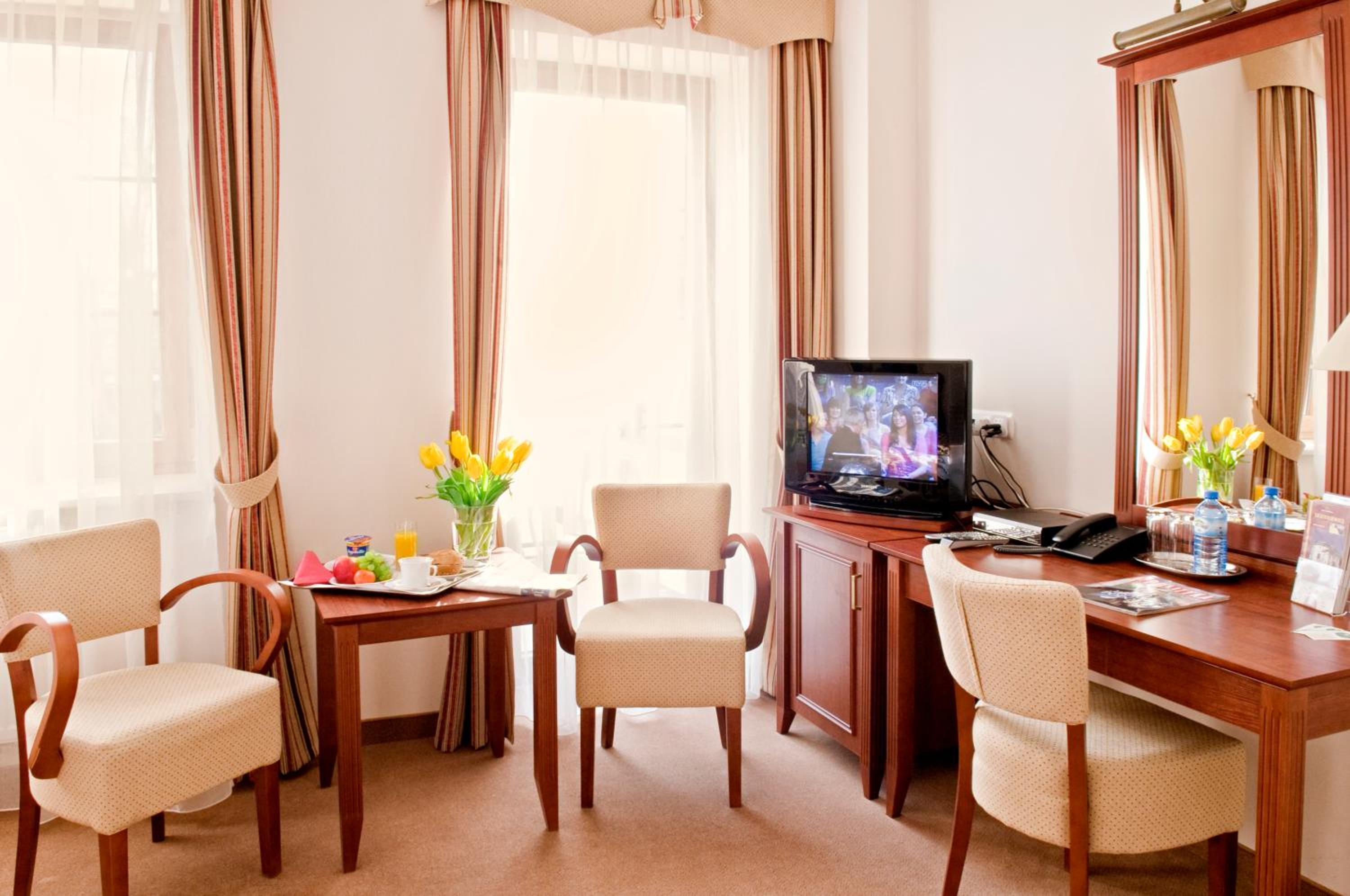 Luxurious Accommodation: Hotel Dworek*** offers elegantly designed guest rooms equipped with modern amenities such as air conditioning, flat-screen TVs, and free toiletries. Some rooms even feature balconies with stunning city views.