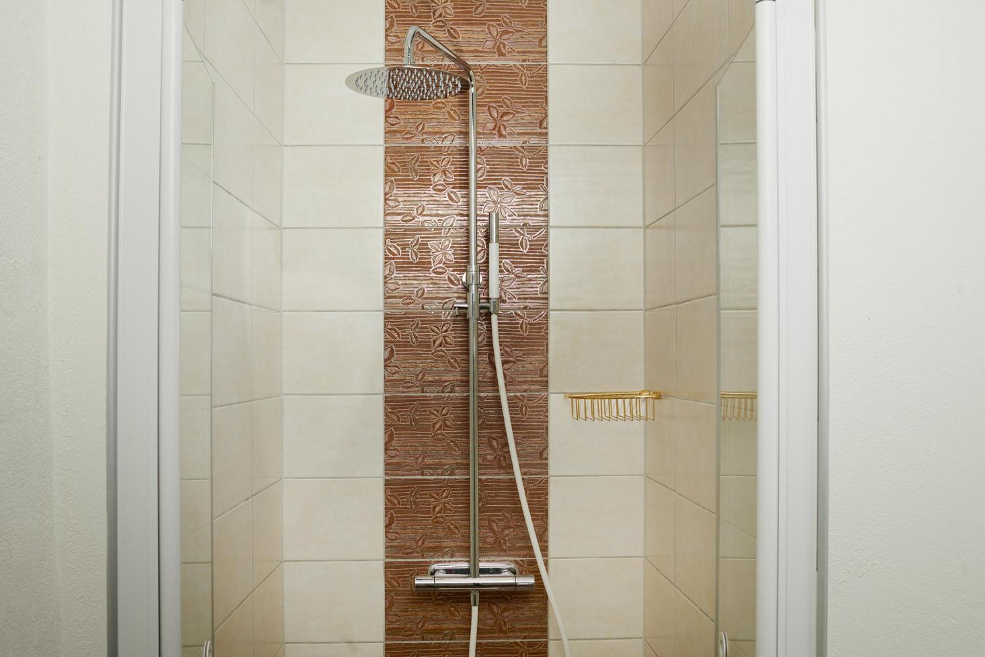 Bekväm säng och lyxigt badrum.