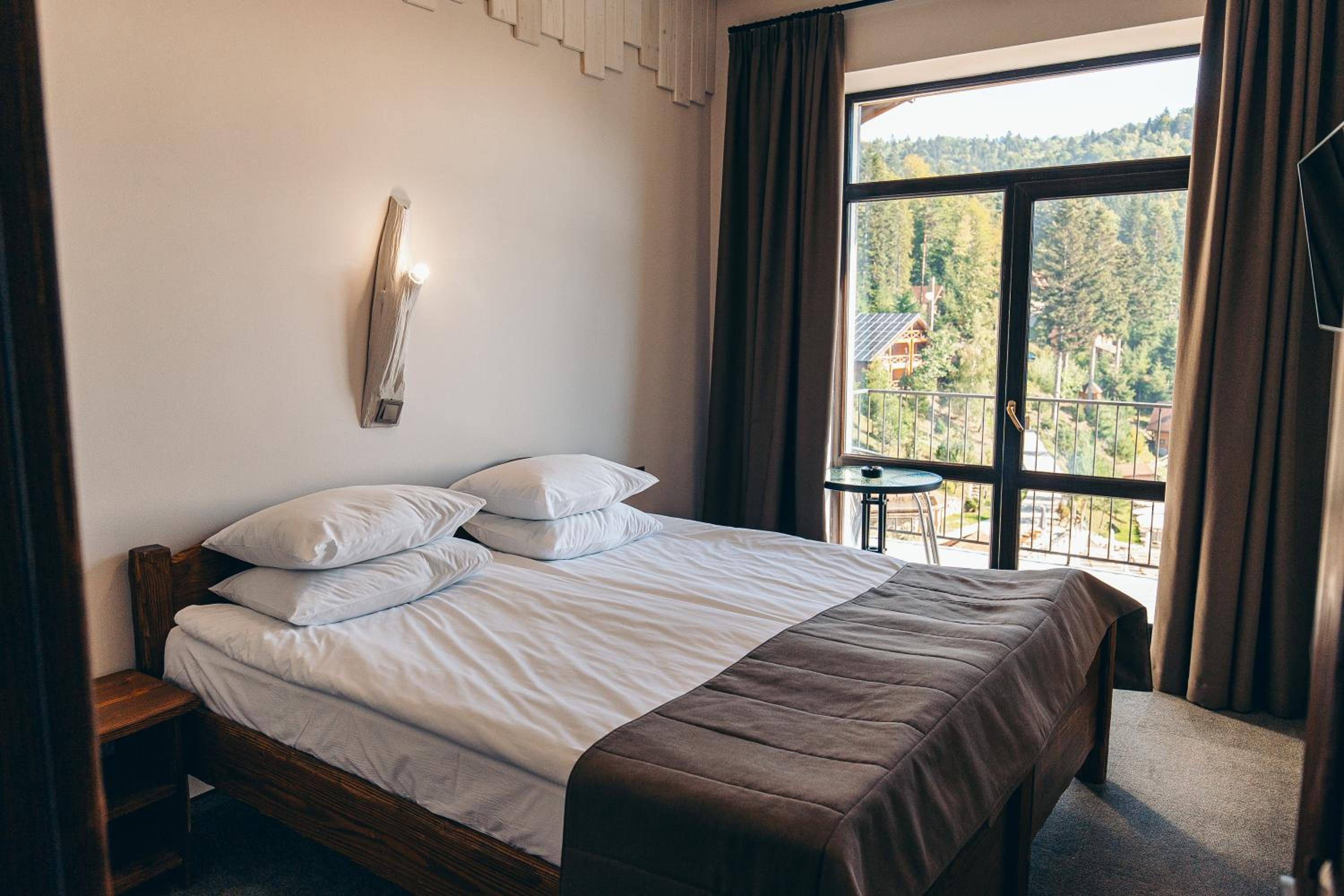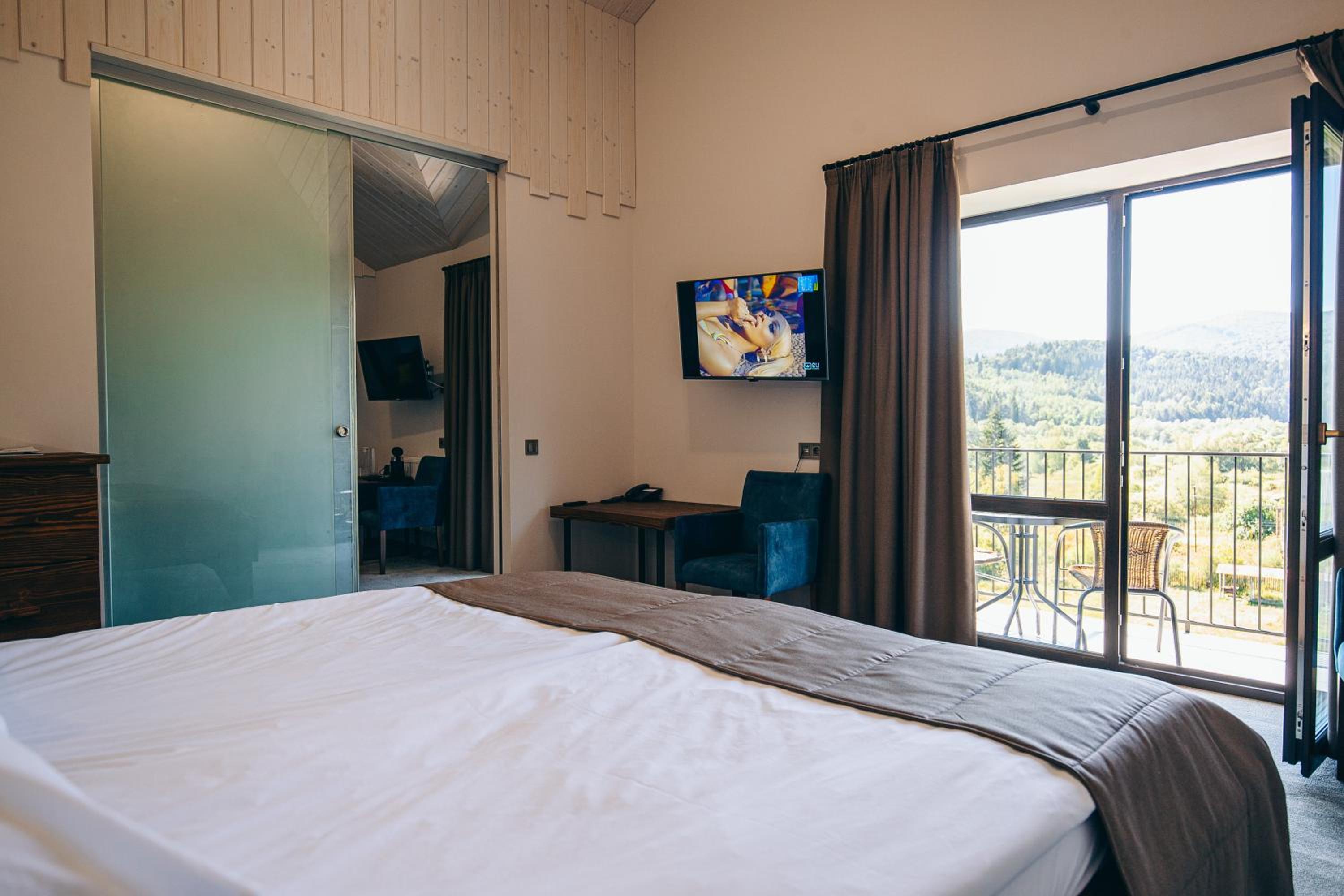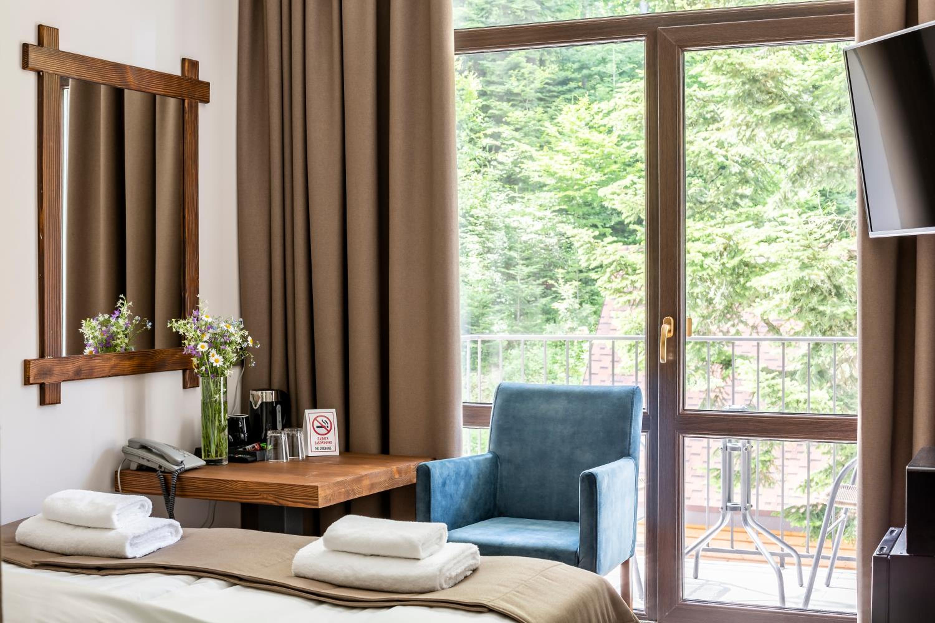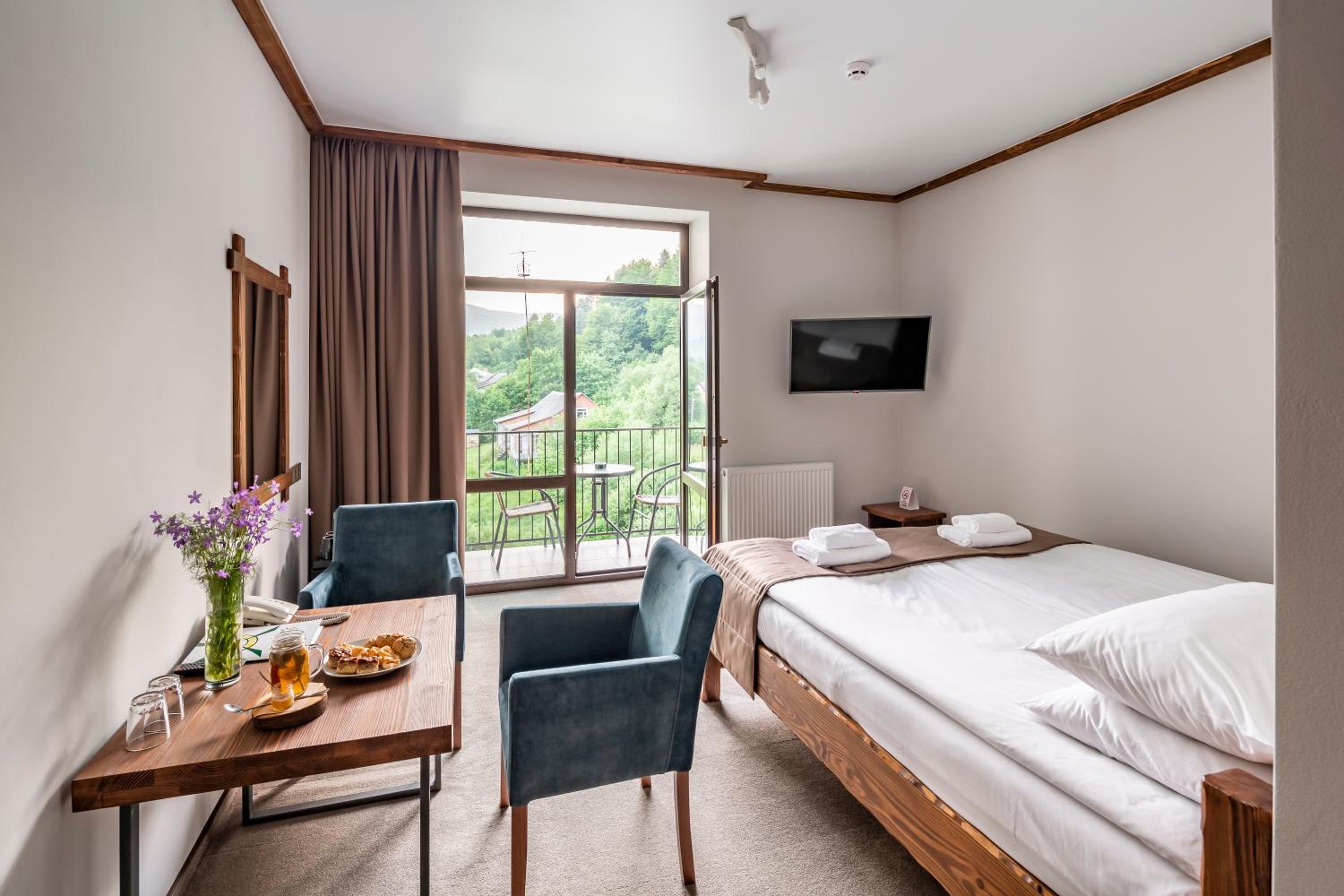 Номер чистий, охайний, із прекрасним краєвидом на гори та ліс.