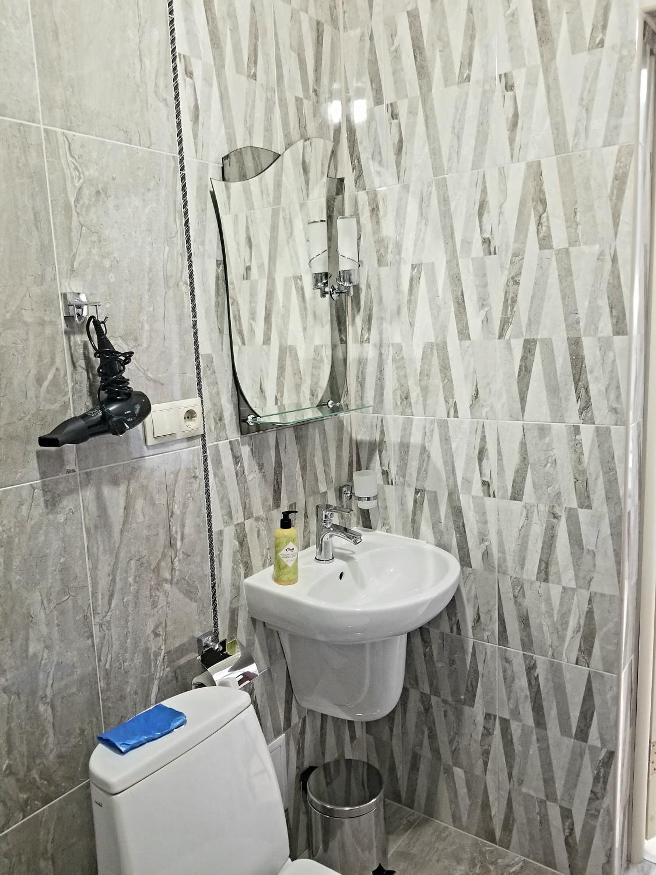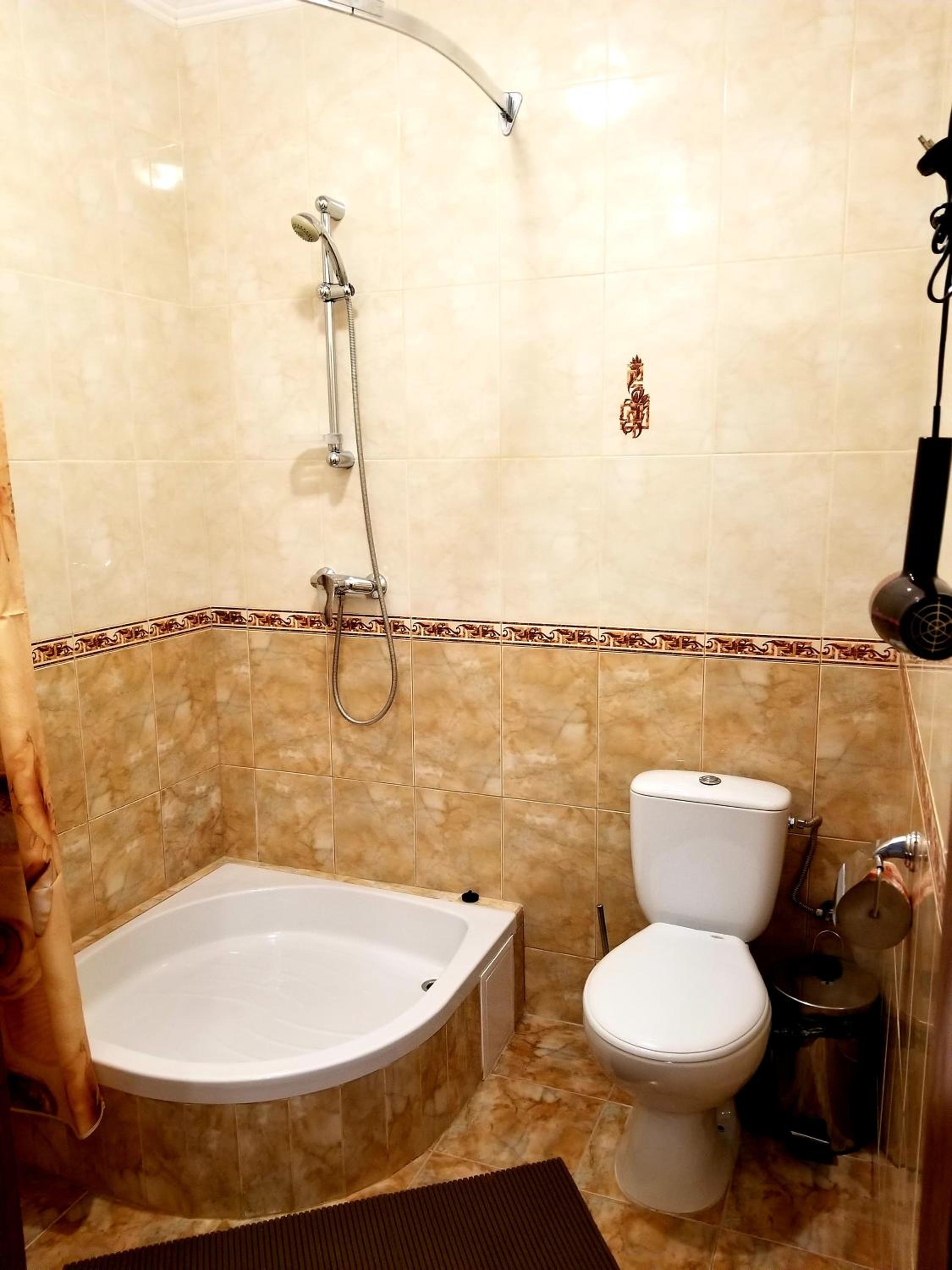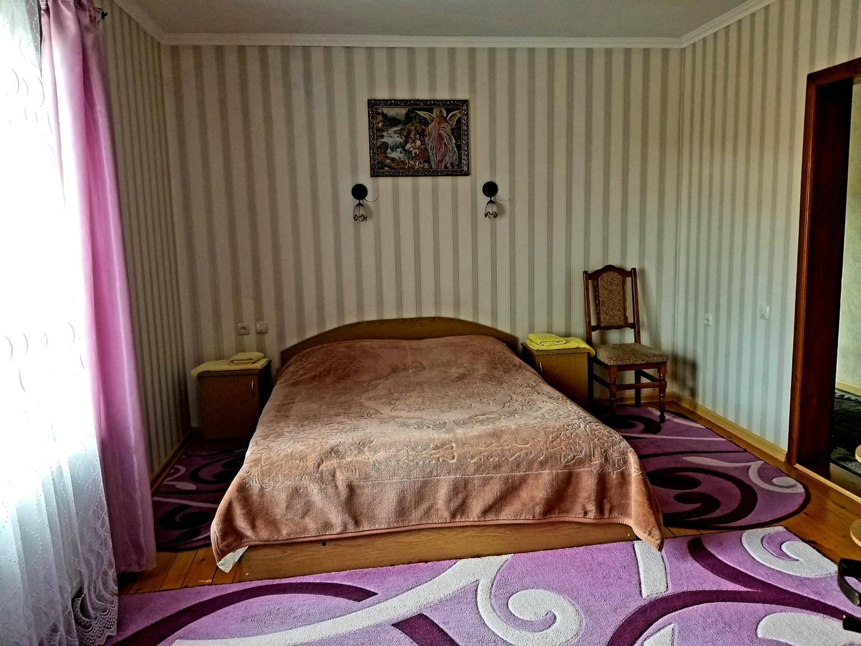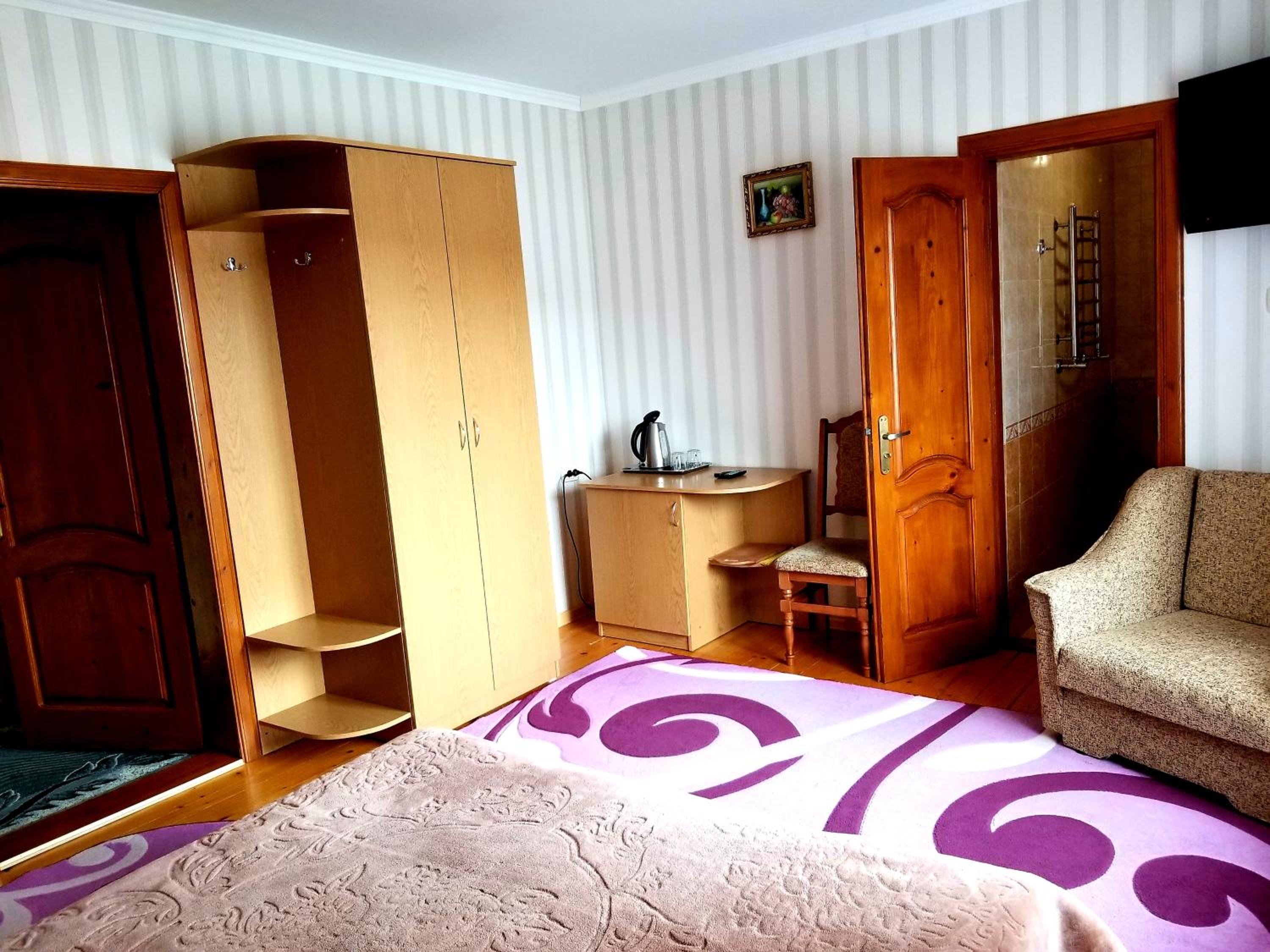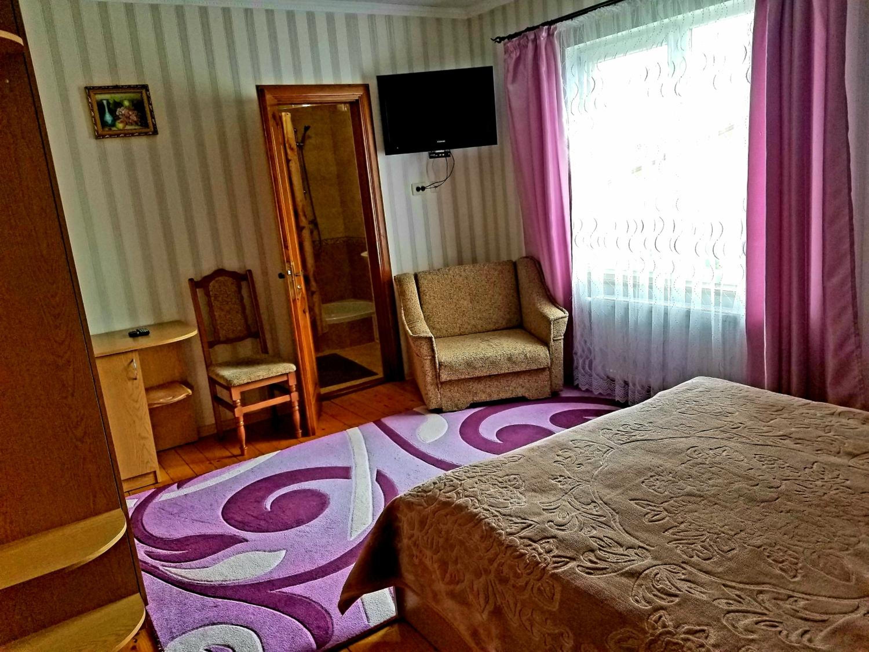 номер світлий, охайний. в кімнаті ліжко, 2 великі рушники+2 маленькі, стіл+2 стільці, чайник+2 чашки, холодильник, шафа, сейф, телевізор, коври. в номері є ванна кімната, де є ванна, фен, вмивальник, мило, туалет, туалетний папір, ганчірка, таз, дзеркало.
