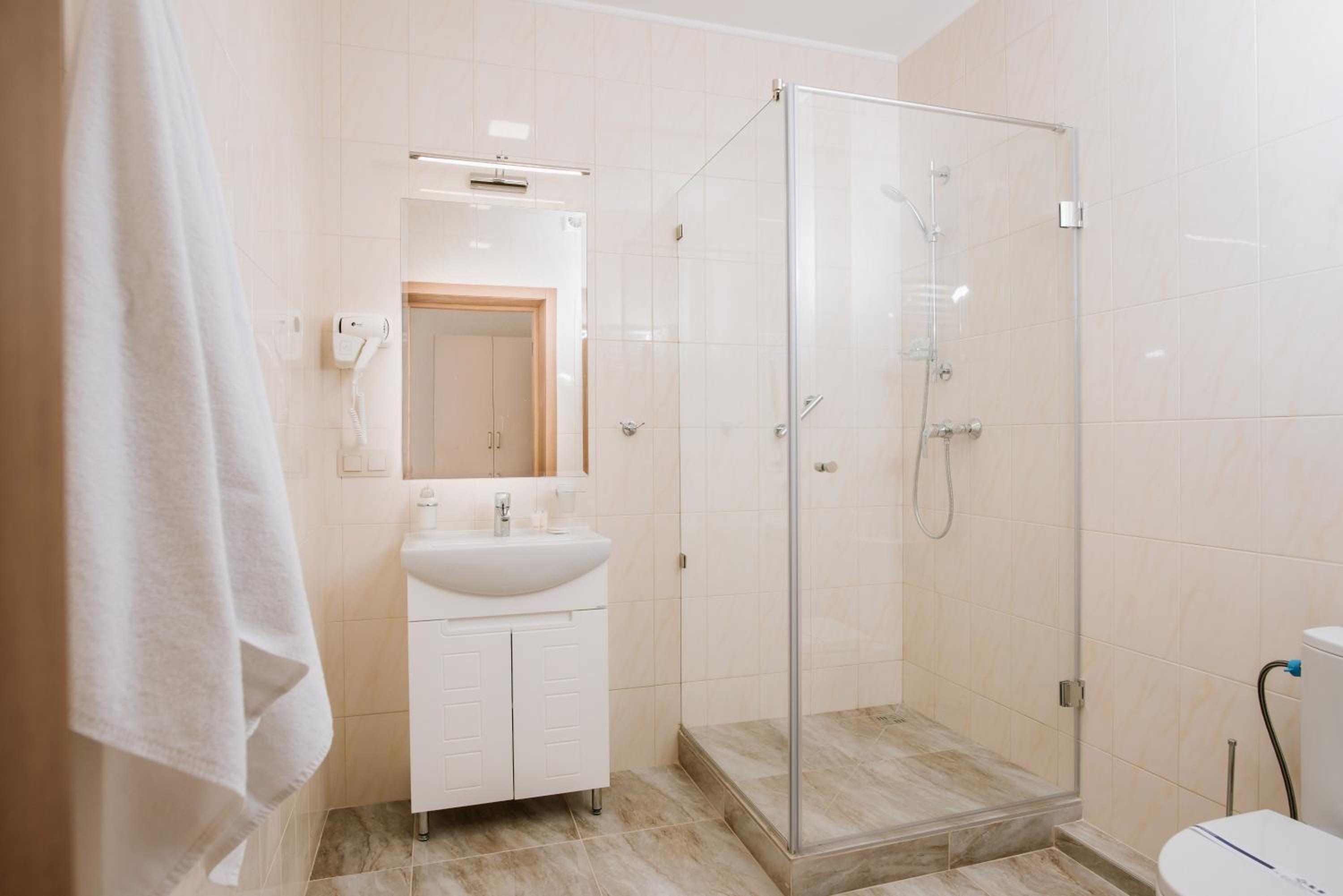 Душ підтікав, точніше після використання душової кабіни при відкритті дверей чомусь все витікало на підлогу. А рушника для ніг чи ганчірки, щоб витерти з підлоги, не було.