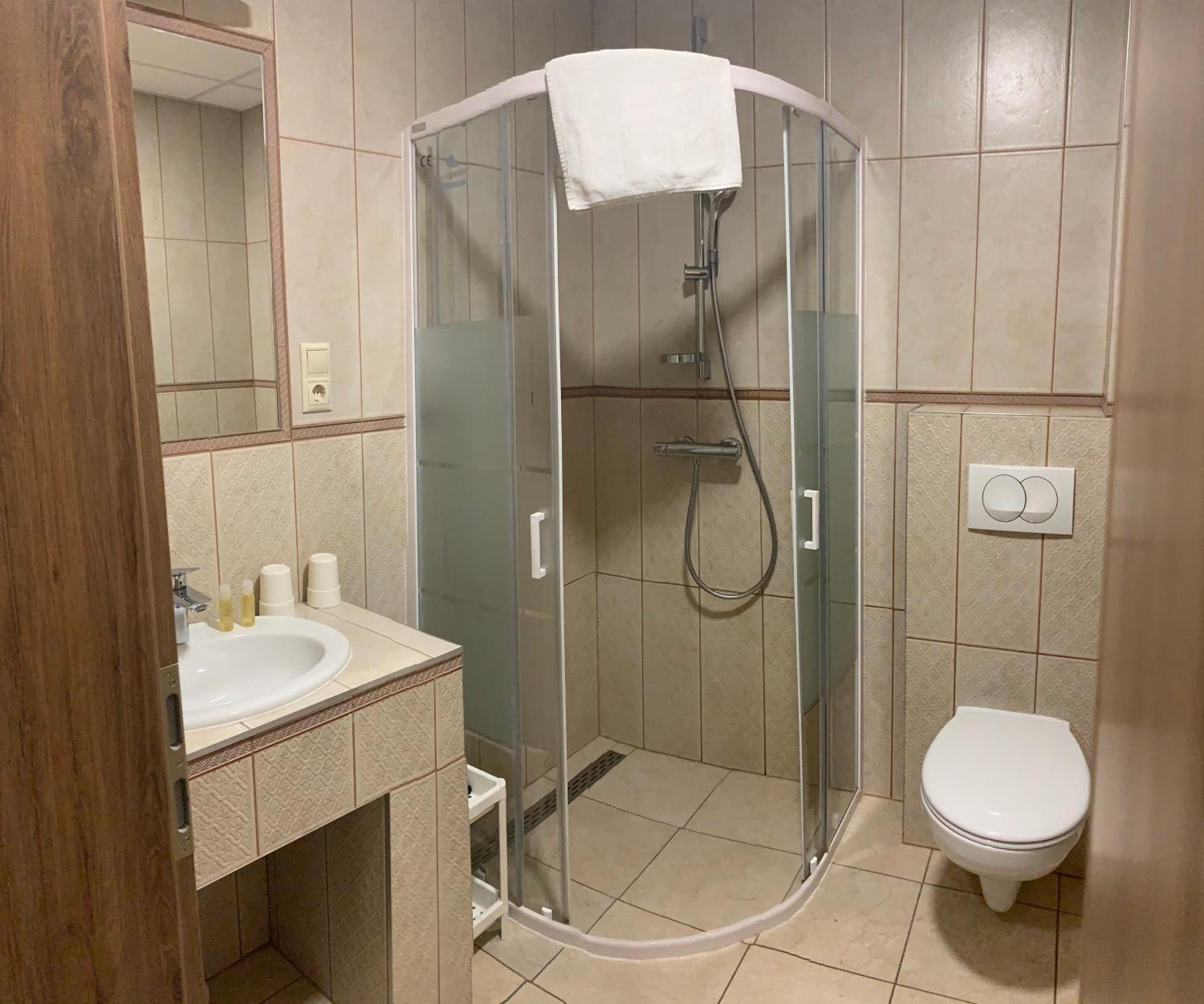 New and very nice looking room. Very spacious and clean. Quiet as well. Beatiful bathroom. Love the wellness on the premise. Parking on the premise. Excellent breakfast.