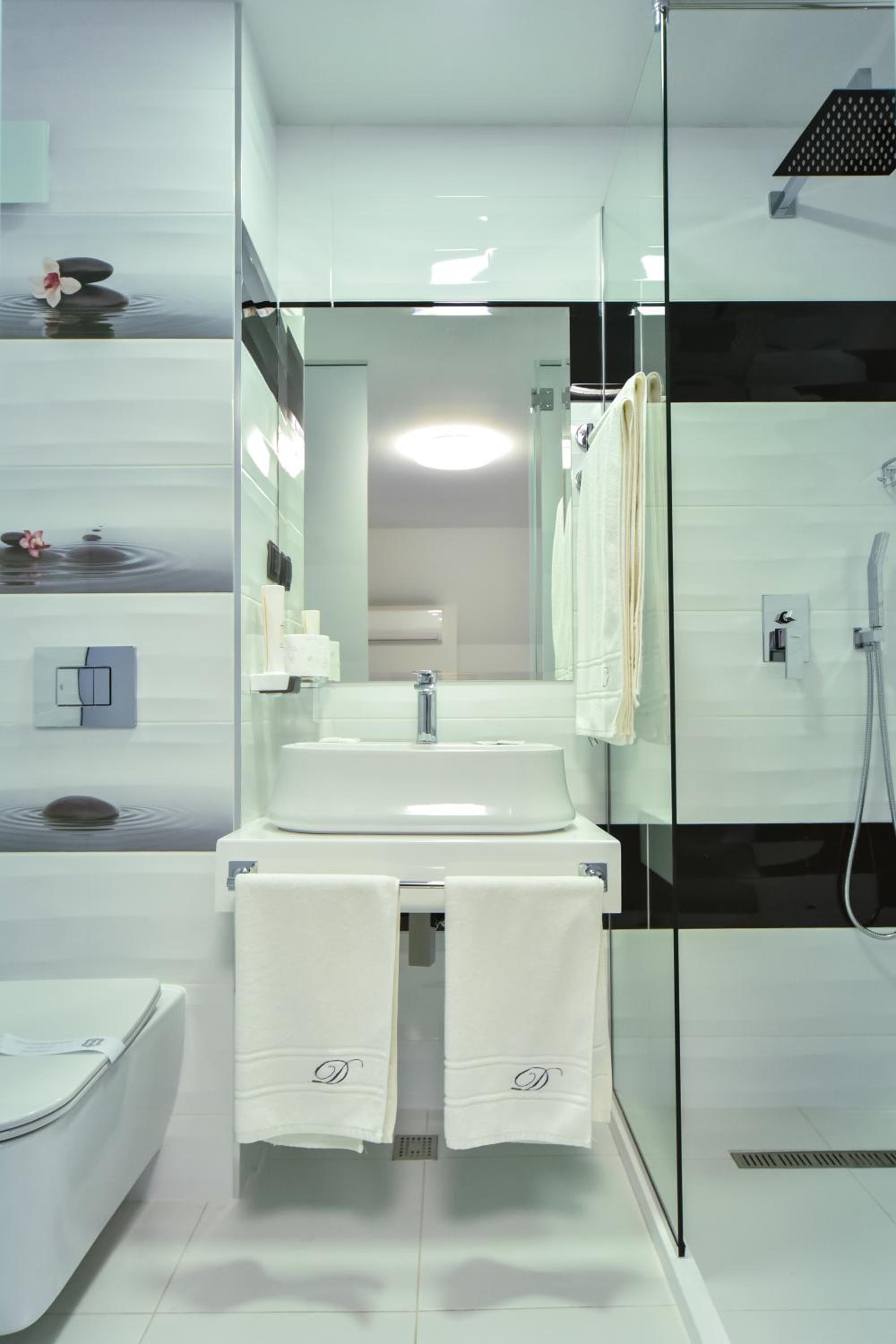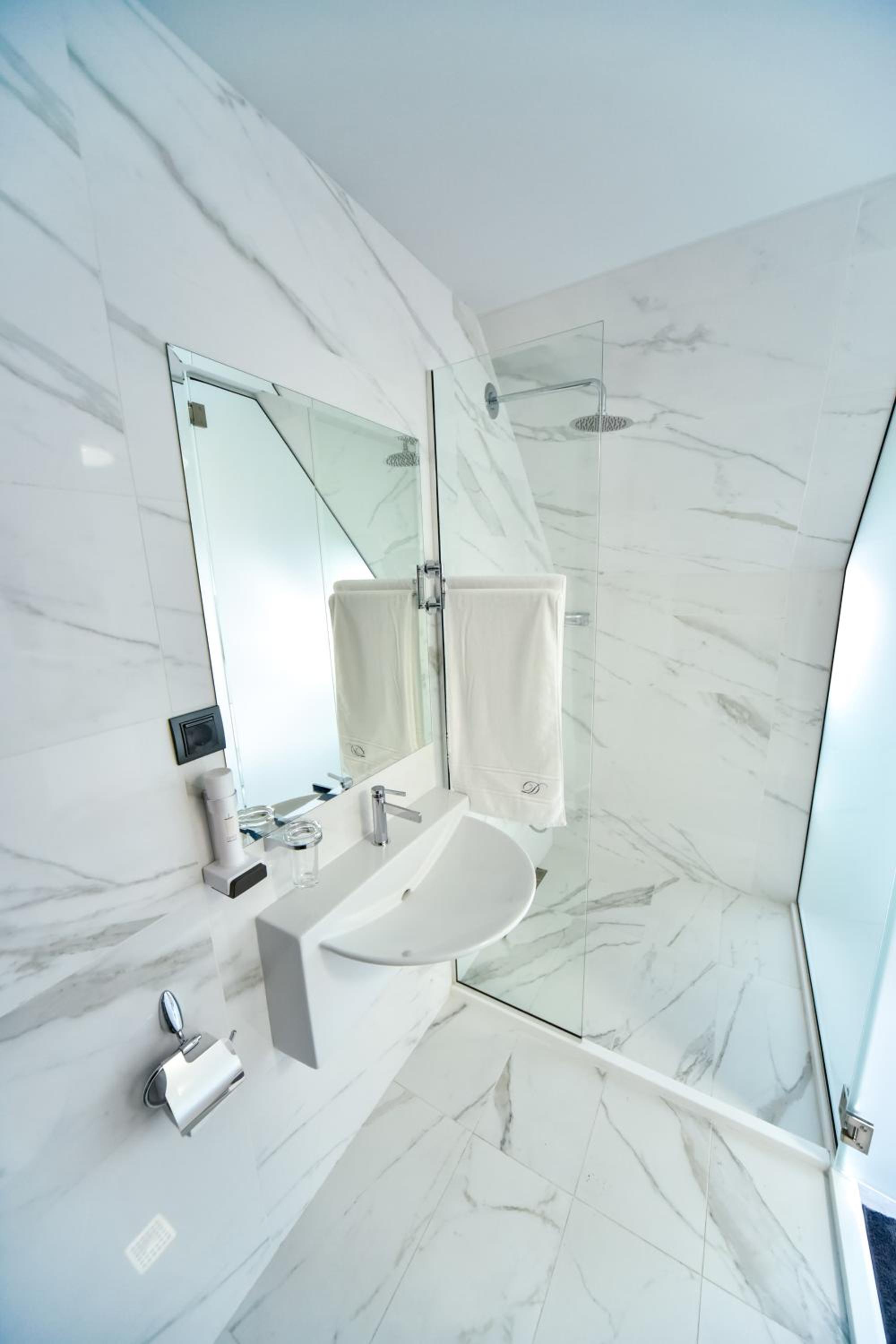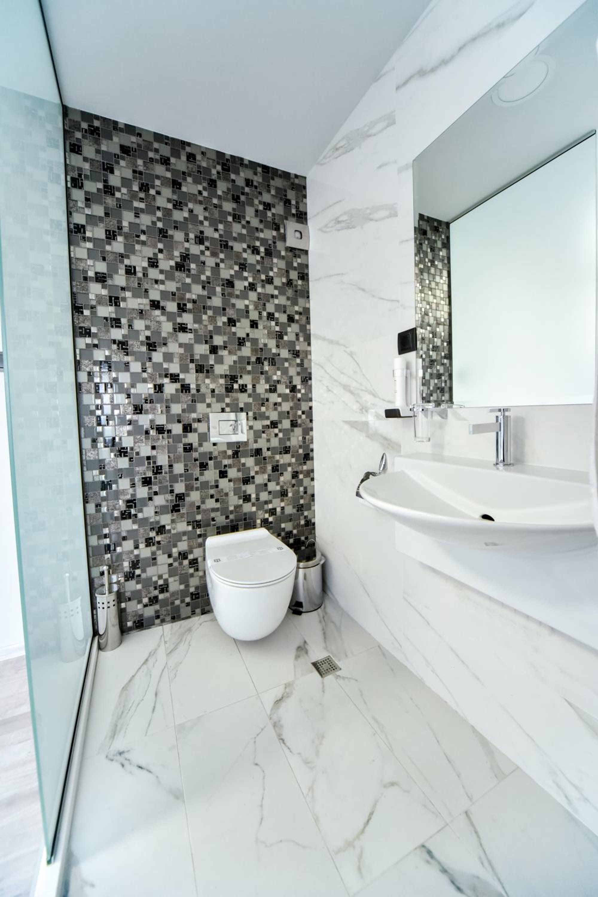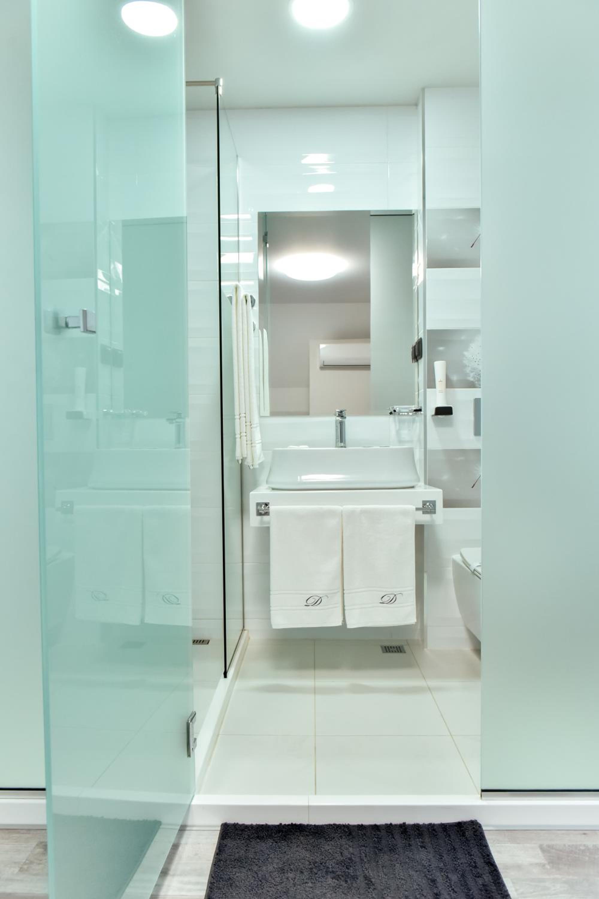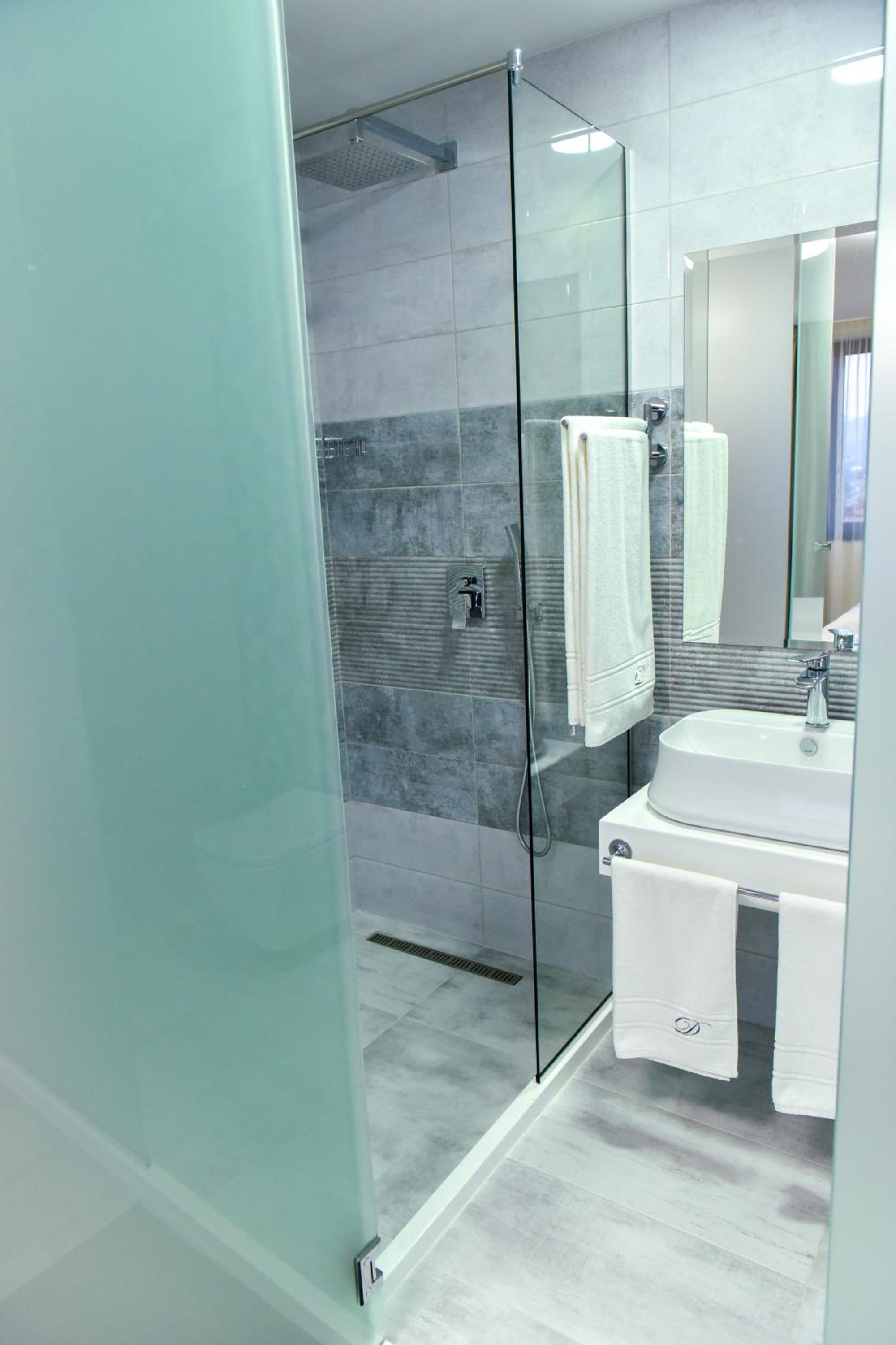 The bathroom is separated from the rest of the room by a frosted glass wall. You can still make out the other person’s silhouette, though. Not a big deal, but if you want complete privacy, it’s something to keep in mind.