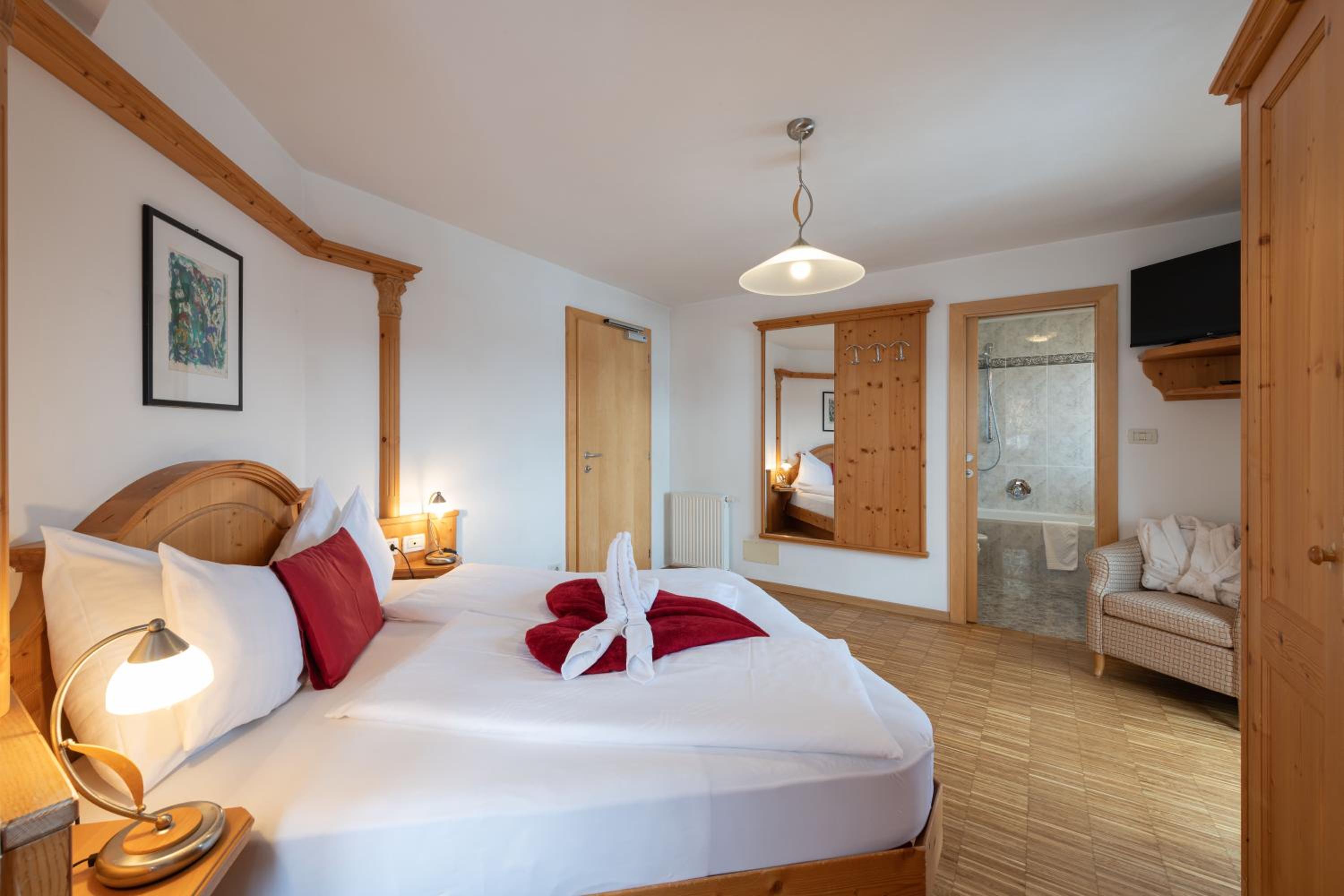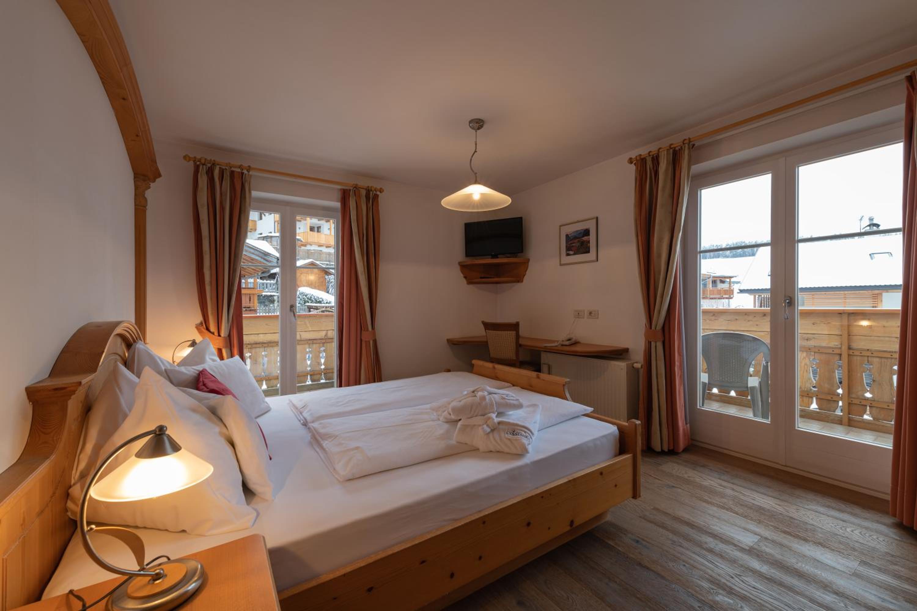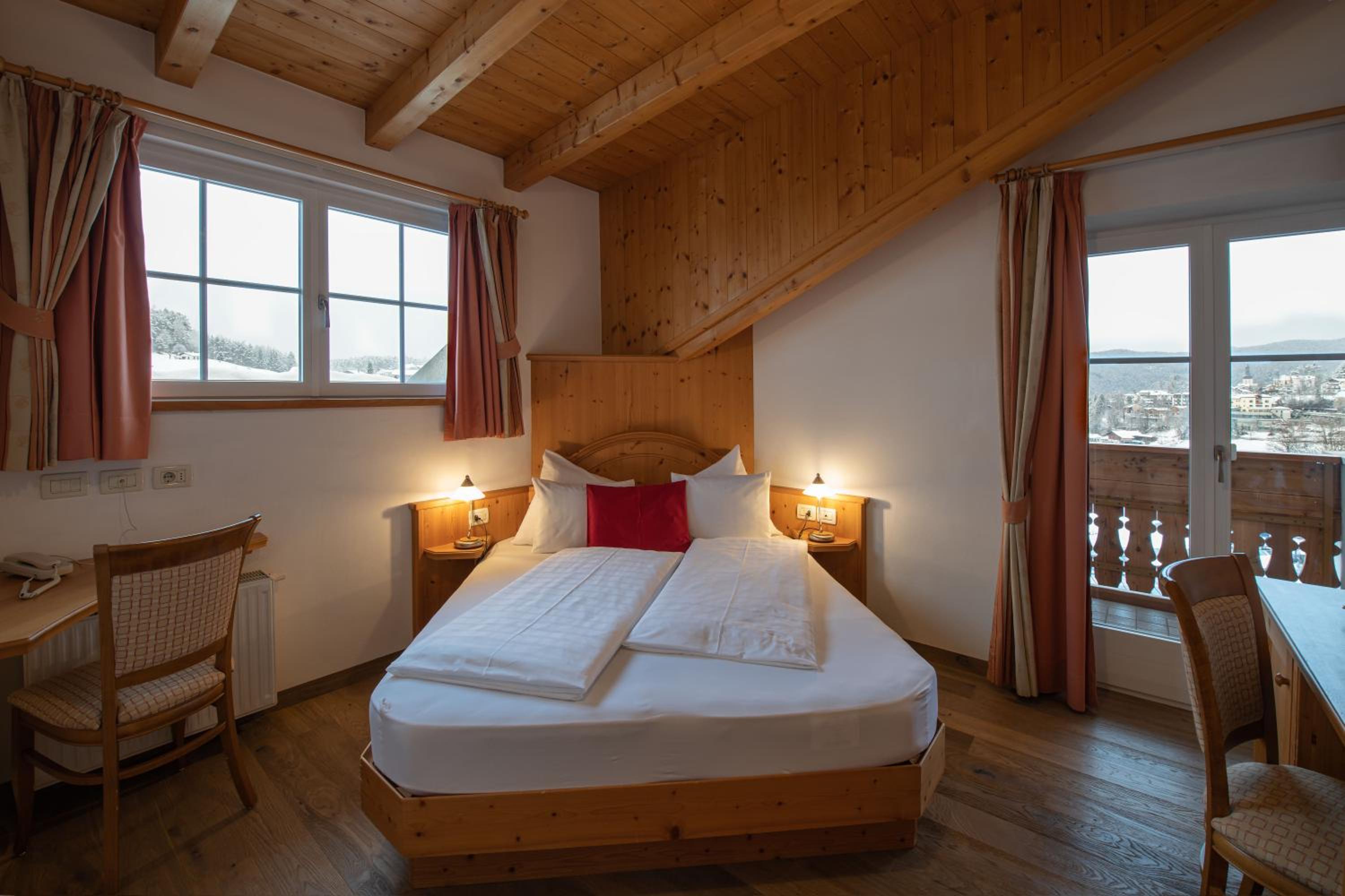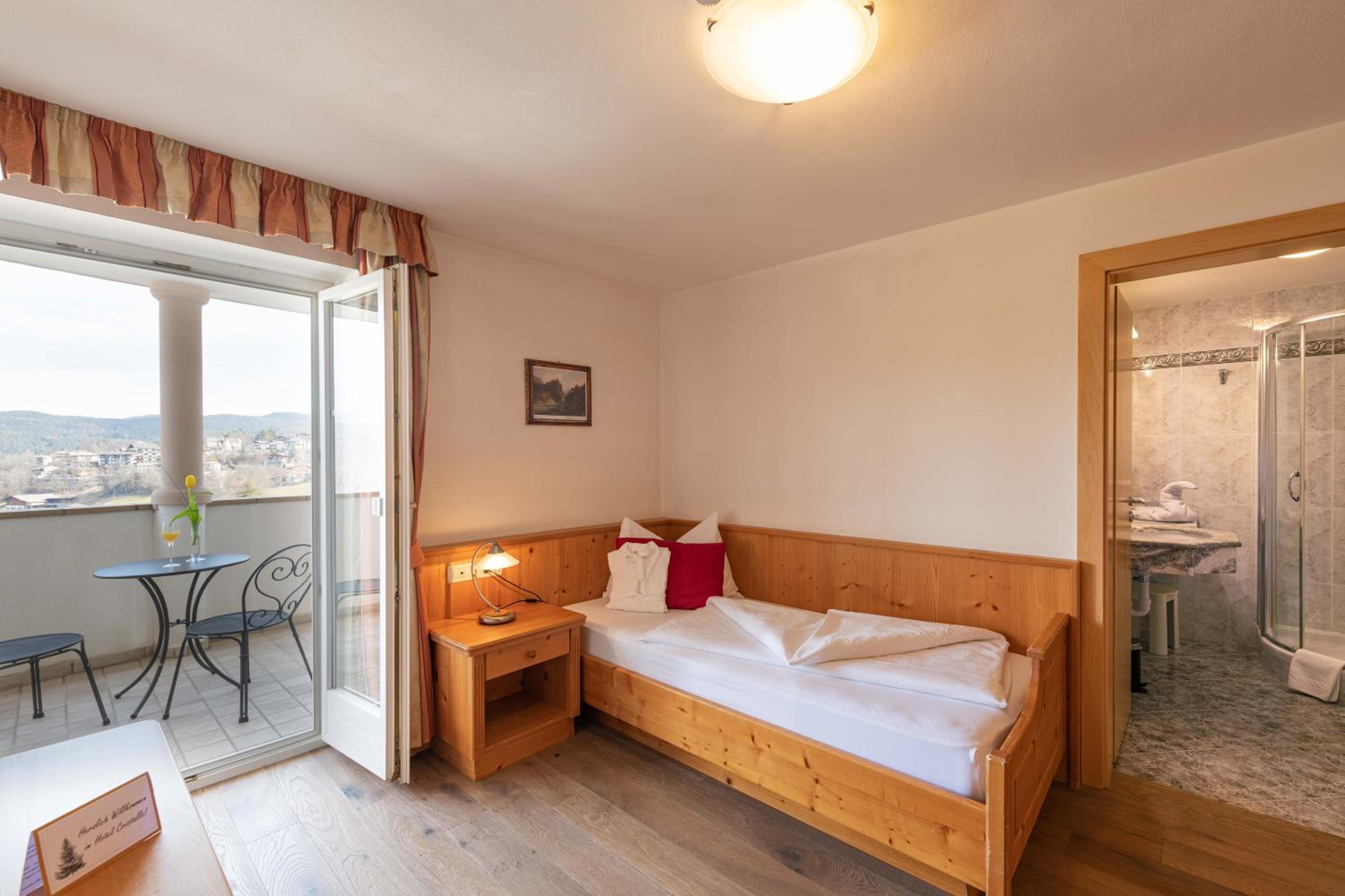 Experience comfort in our charming alpine-style rooms with satellite TV, private bathrooms, and most with a furnished balcony offering breathtaking views of Castelrotto.