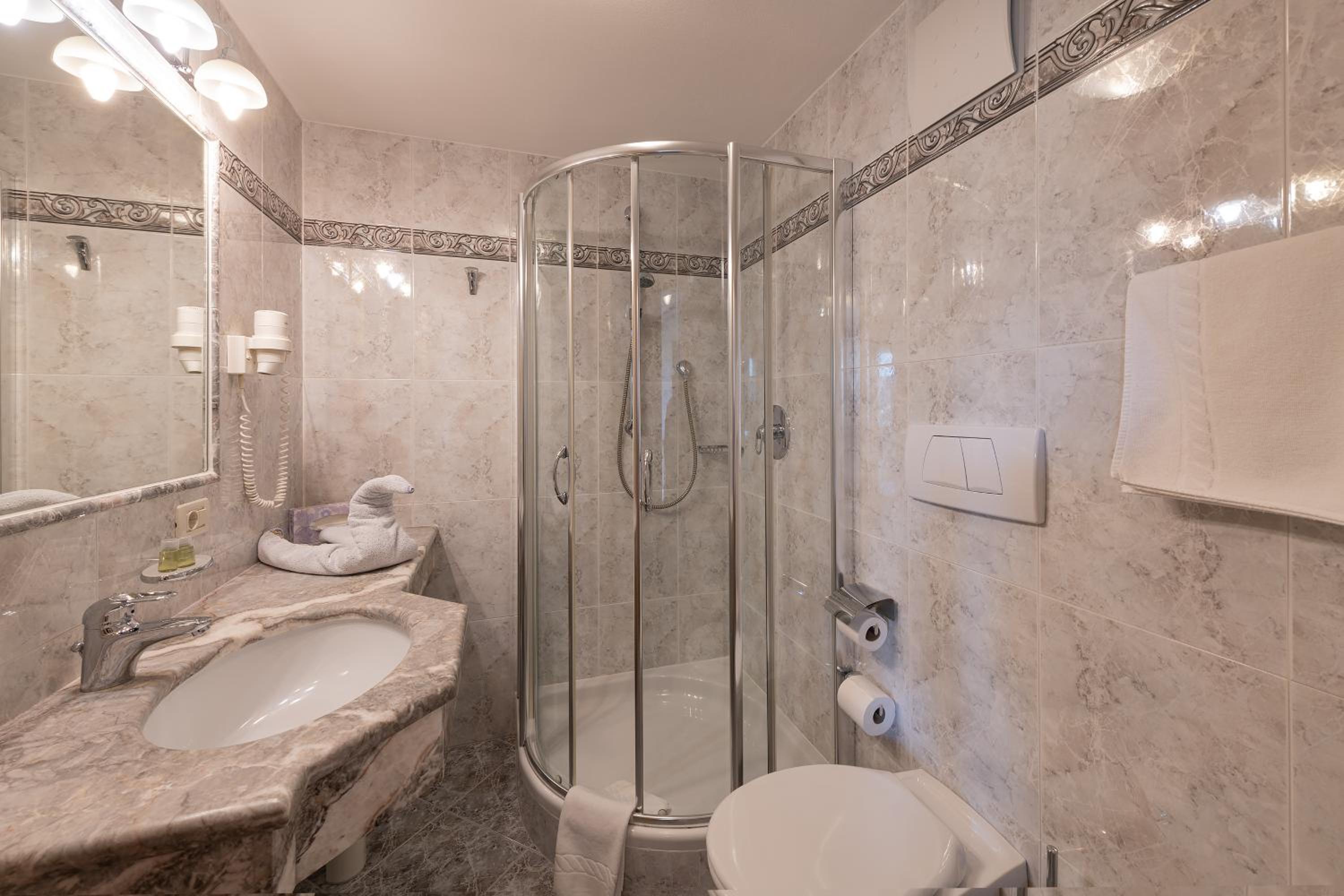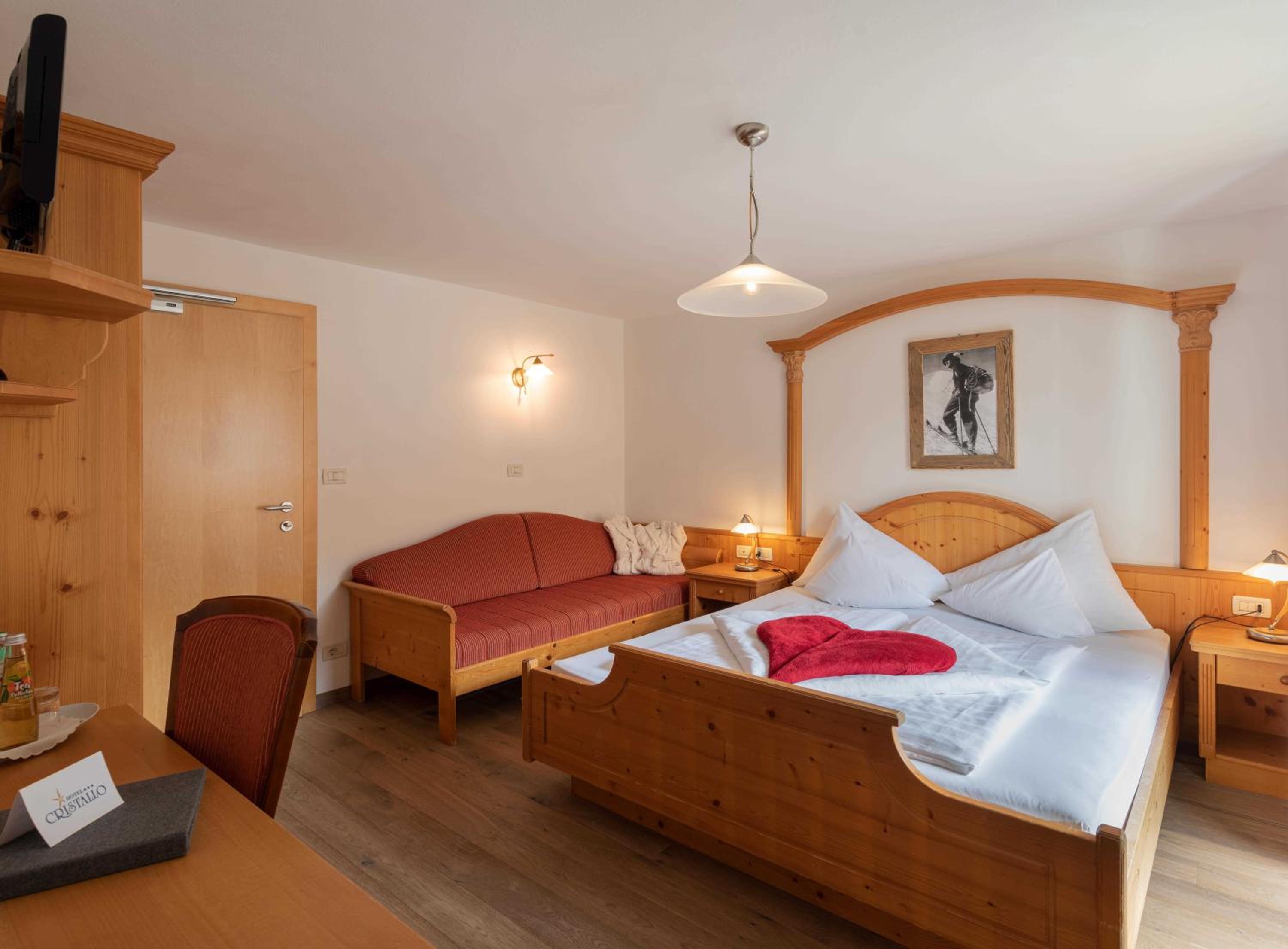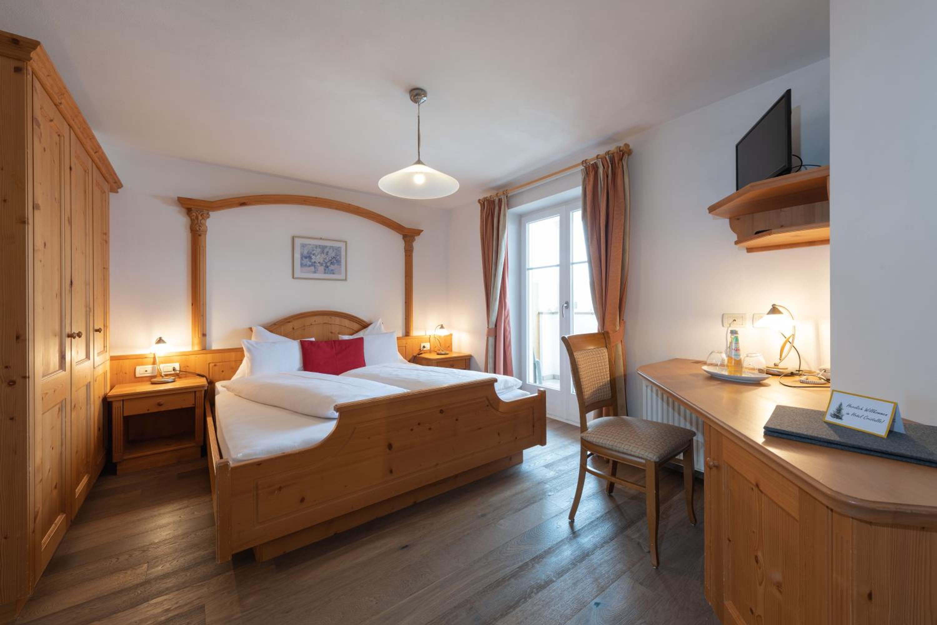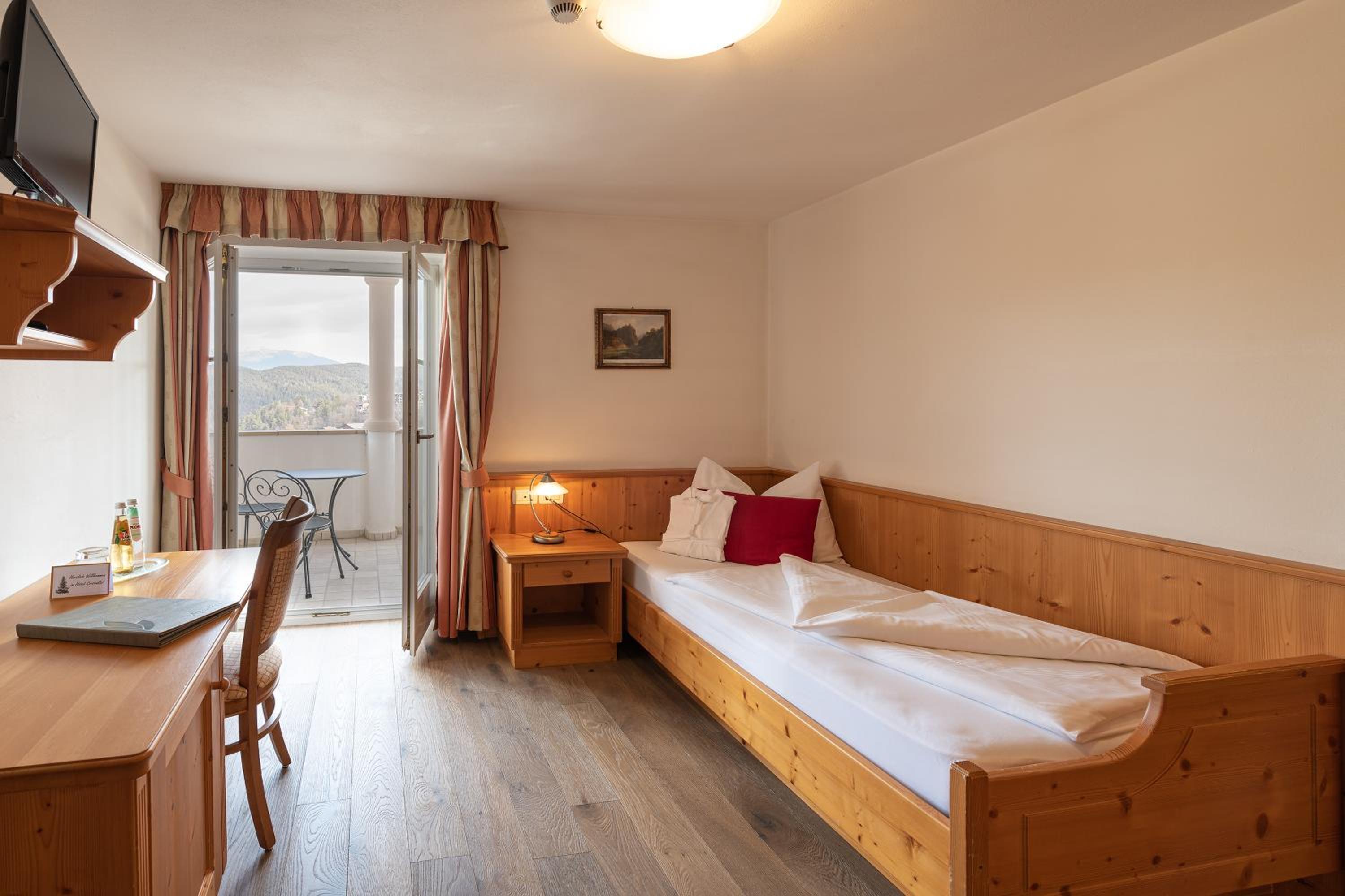 Experience comfort in our charming alpine-style rooms with satellite TV, private bathrooms, and most with a furnished balcony offering breathtaking views of Castelrotto.