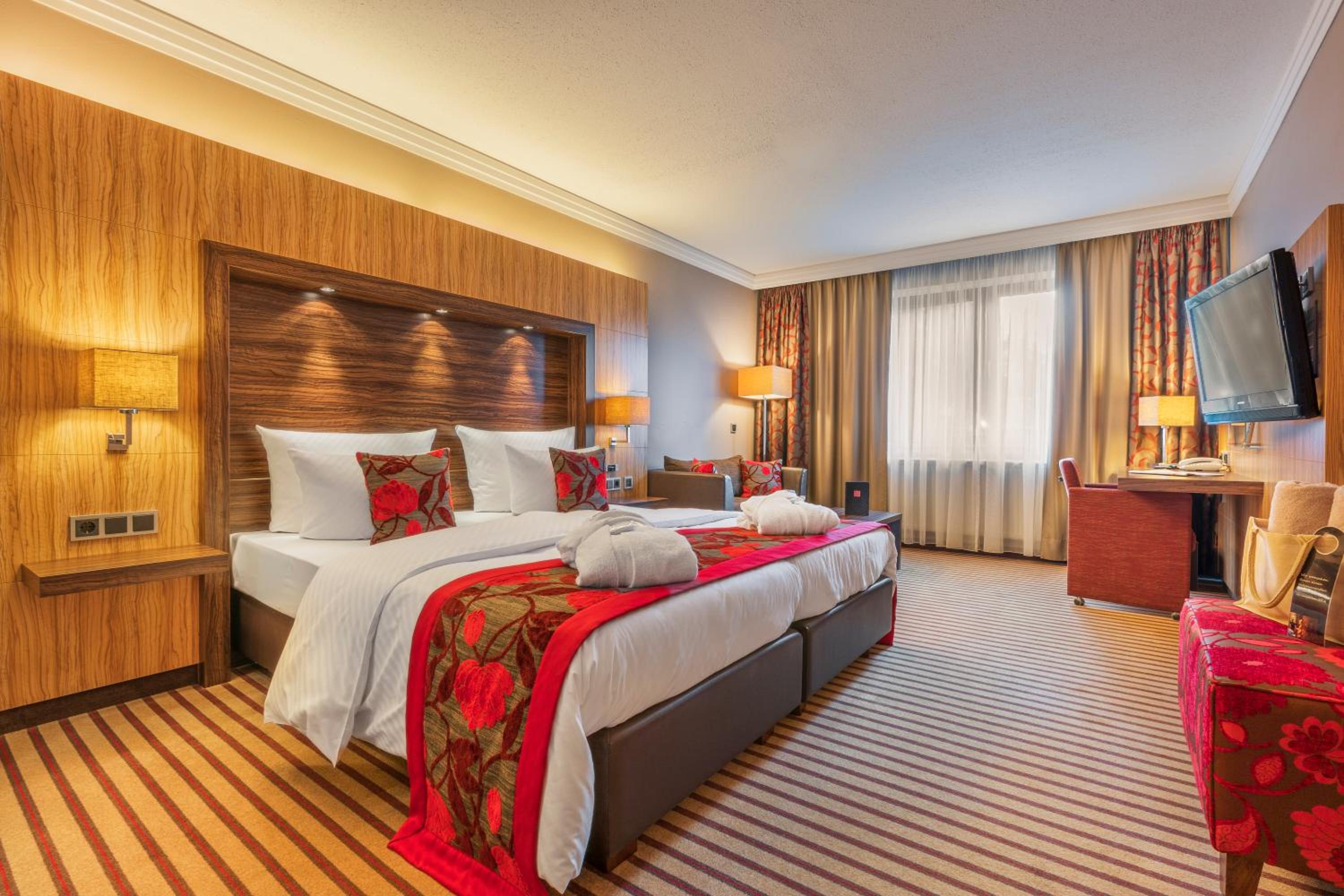 The DER HEIDEHOF Conference & SPA Resort offers spacious rooms equipped with modern amenities, ensuring a comfortable stay for guests. Each room features a TV, private bathroom, and the option for Wi-Fi access. With 24-hour room service available, guests can enjoy convenience at any time during their stay.