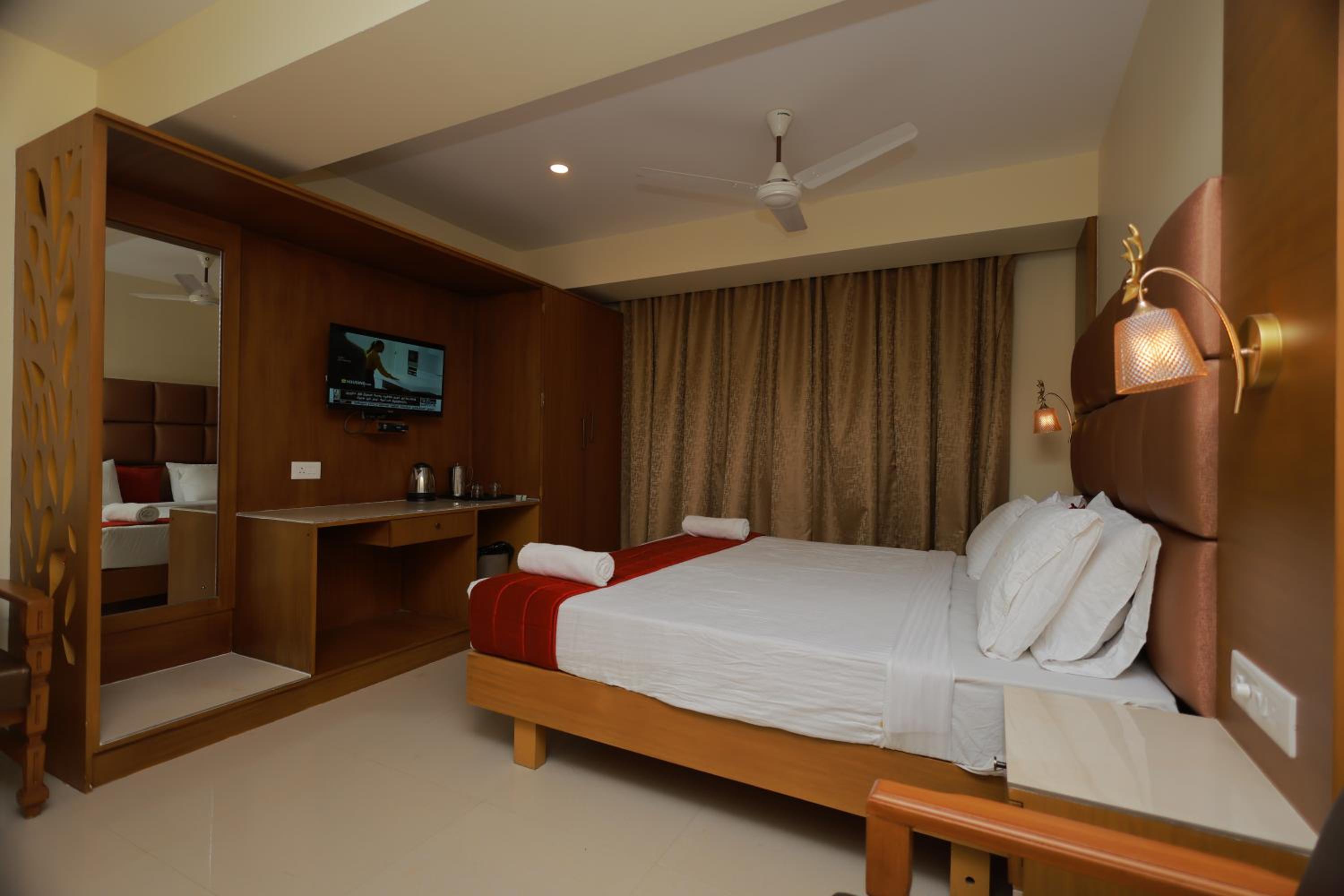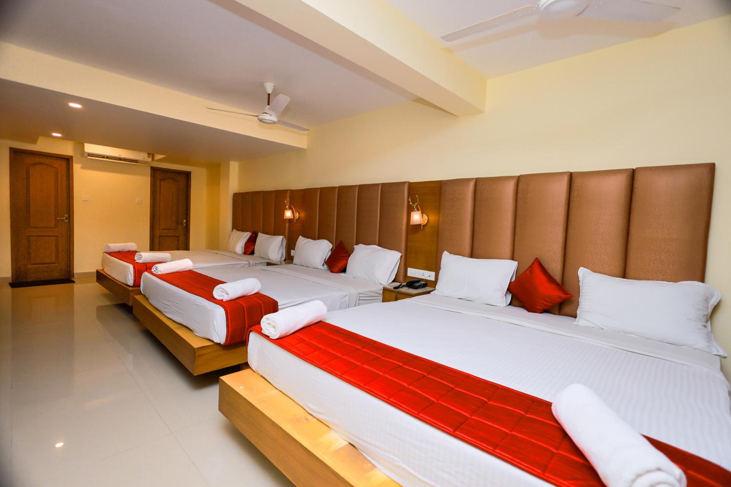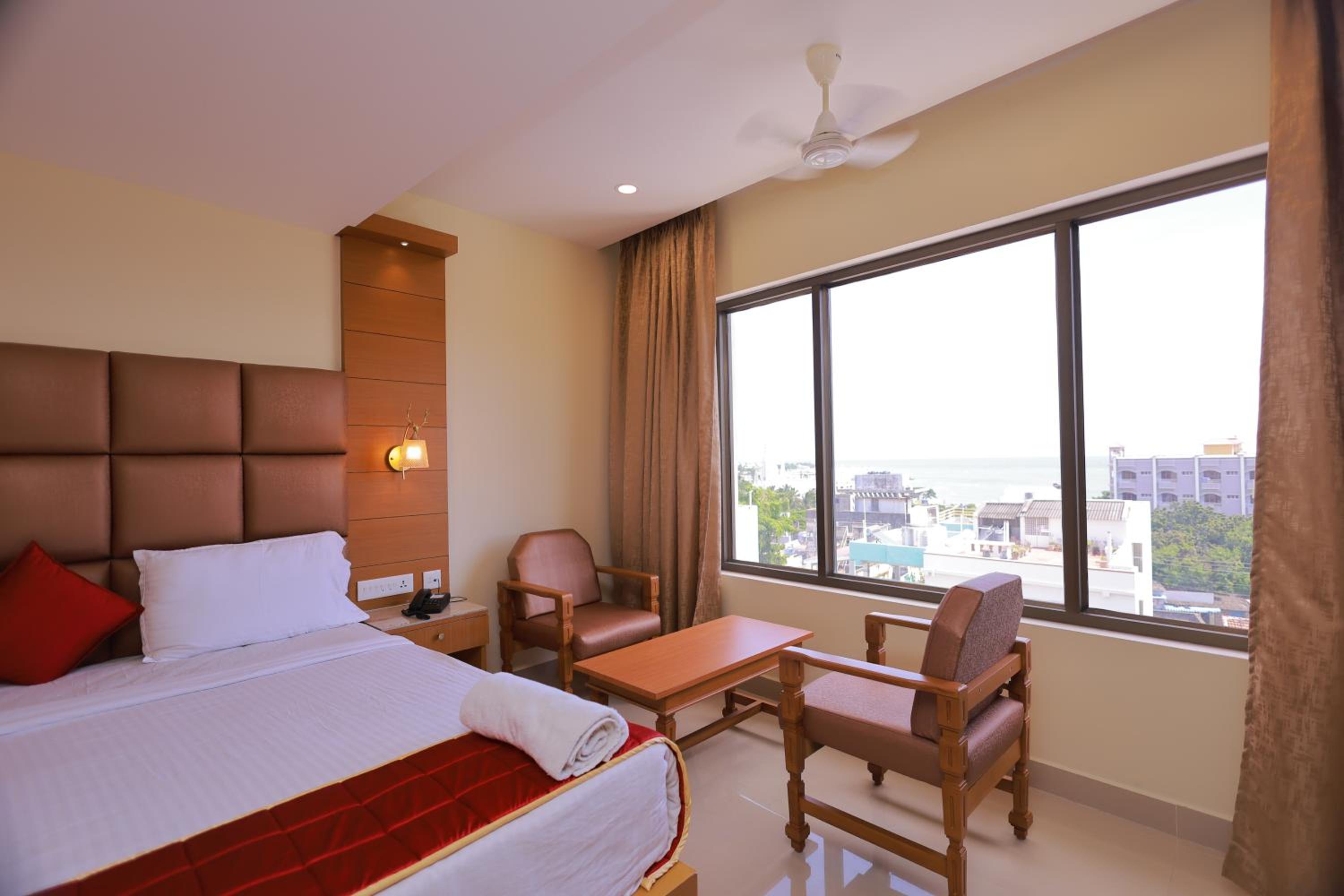 Hotel Sangam in Kanyakumari offers comfortable rooms with air conditioning, flat-screen TVs, and private bathrooms. Some rooms even provide stunning sea or city views for a memorable stay.