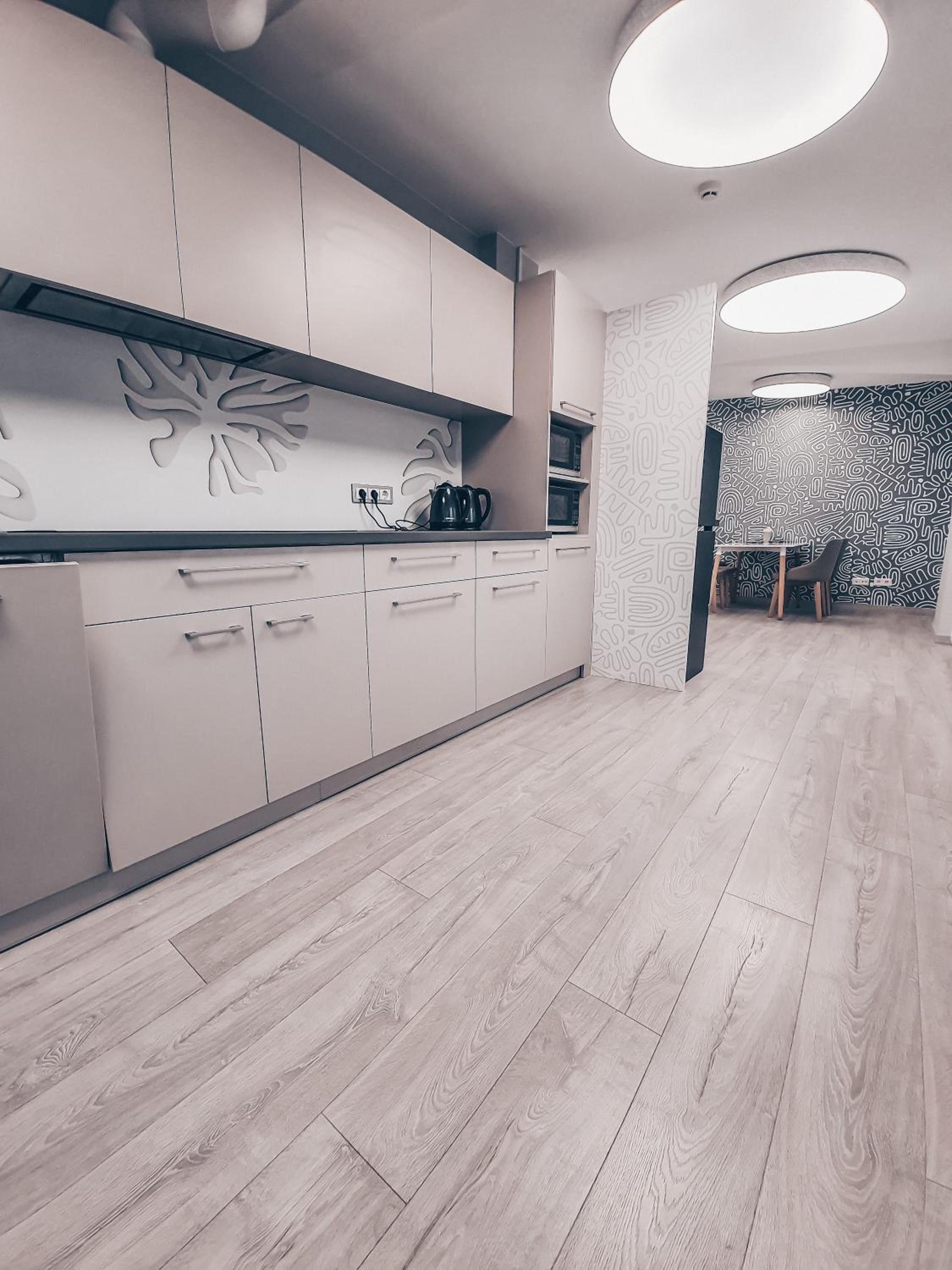Удобное расположение рядом есть магазины пиццерия и столовая, в самой гостинице есть кухня и всё необходимое.