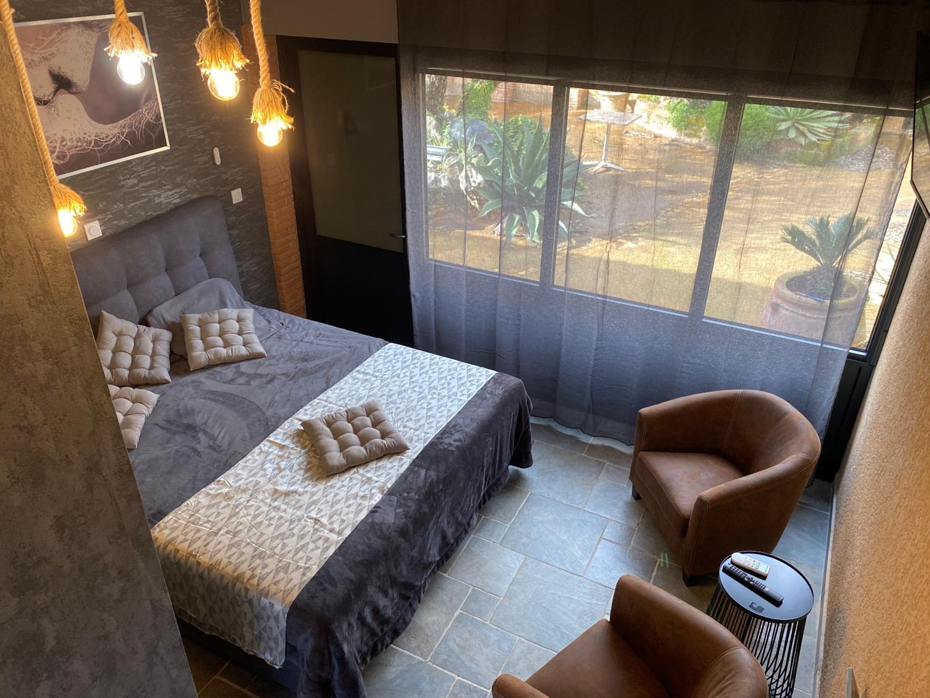 Each room at HOTEL NATURE LE LOFT features modern amenities such as air conditioning, flat-screen TV, and a private bathroom. The cozy seating area and patio with pool view provide a peaceful retreat for guests after a day of exploration.