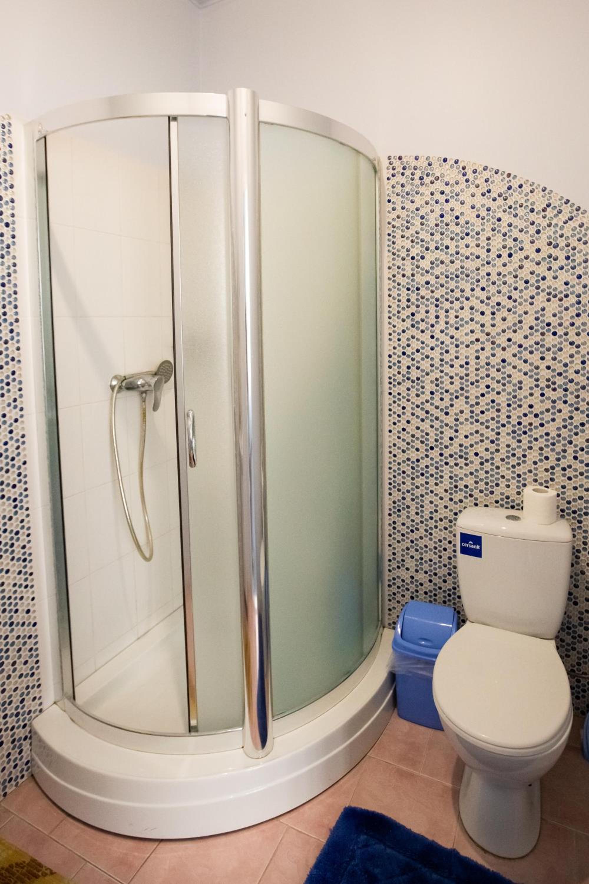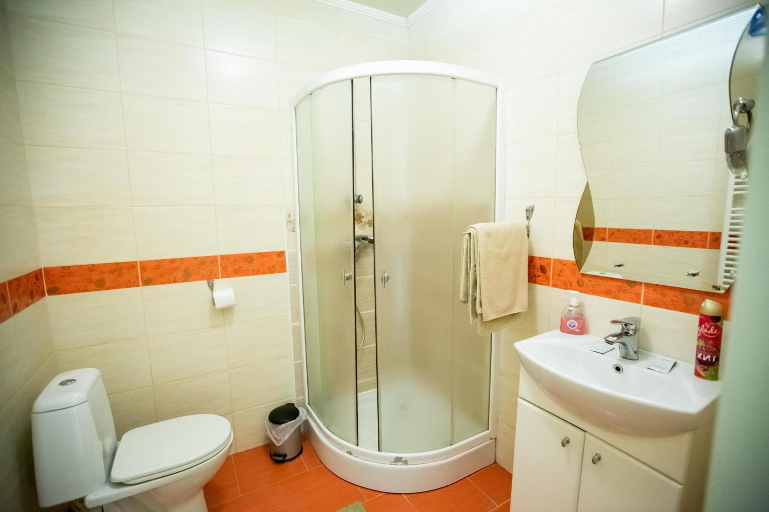 Замала для чоловіка душова кабіна у номері. Спілний душ на поверсі — ОК.