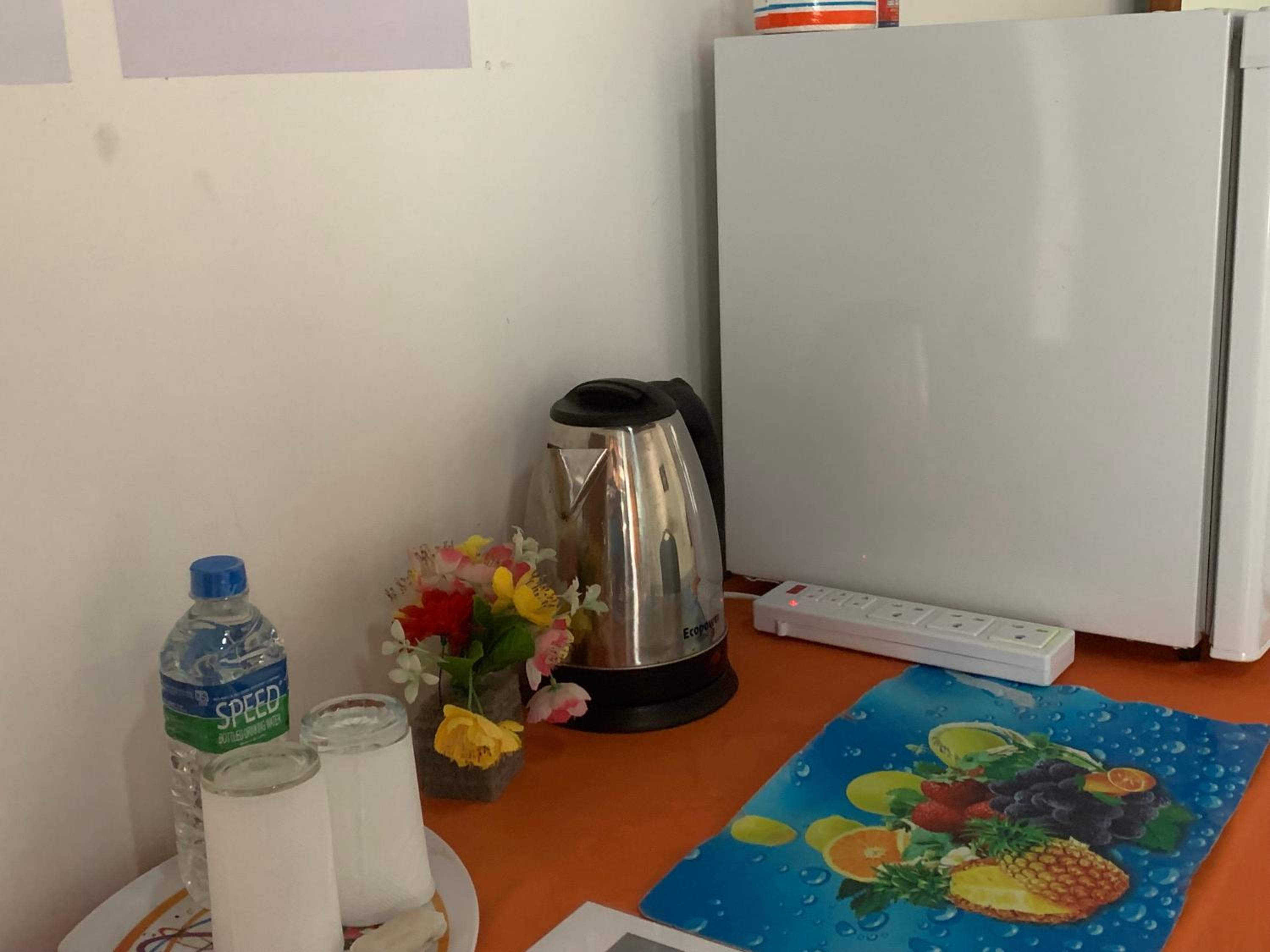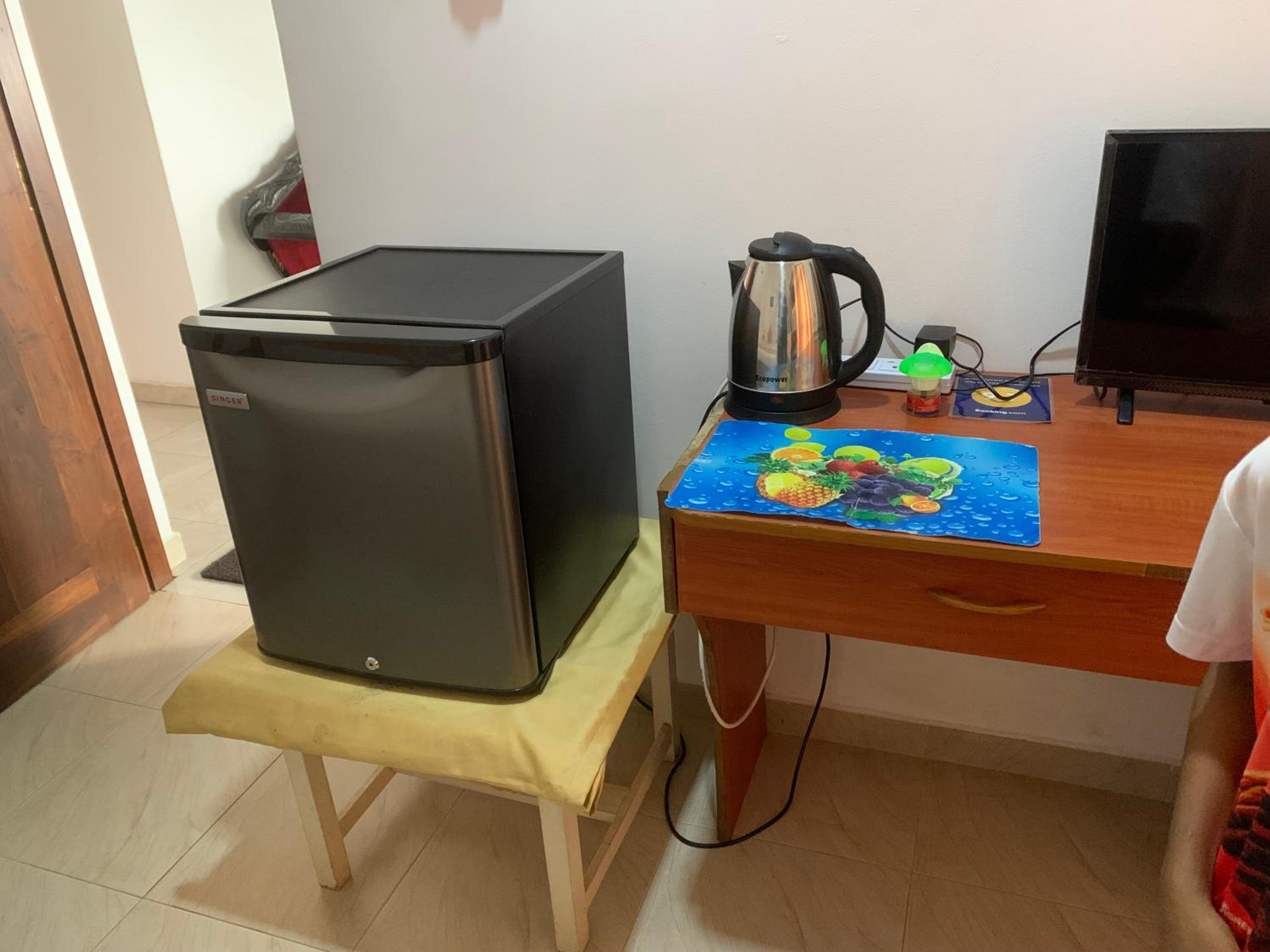 Gute Ausstattung mit Wasserkocher und Kühlschrank