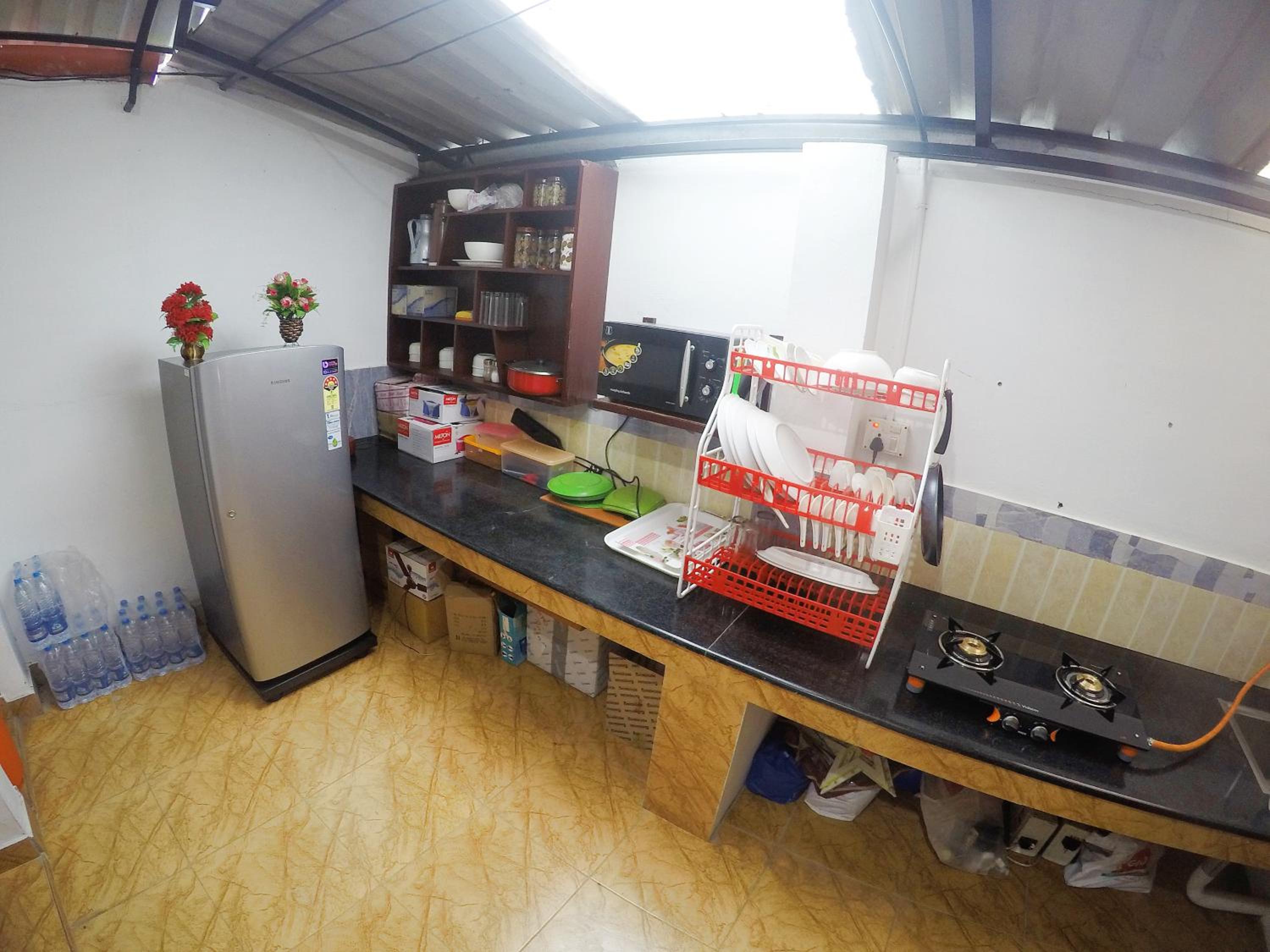 Little distance away from. Restraurants for walking and sandy beach but beautiful view.Has a shared fridge on top floor dinning room..Beach is a 15 minute walk.