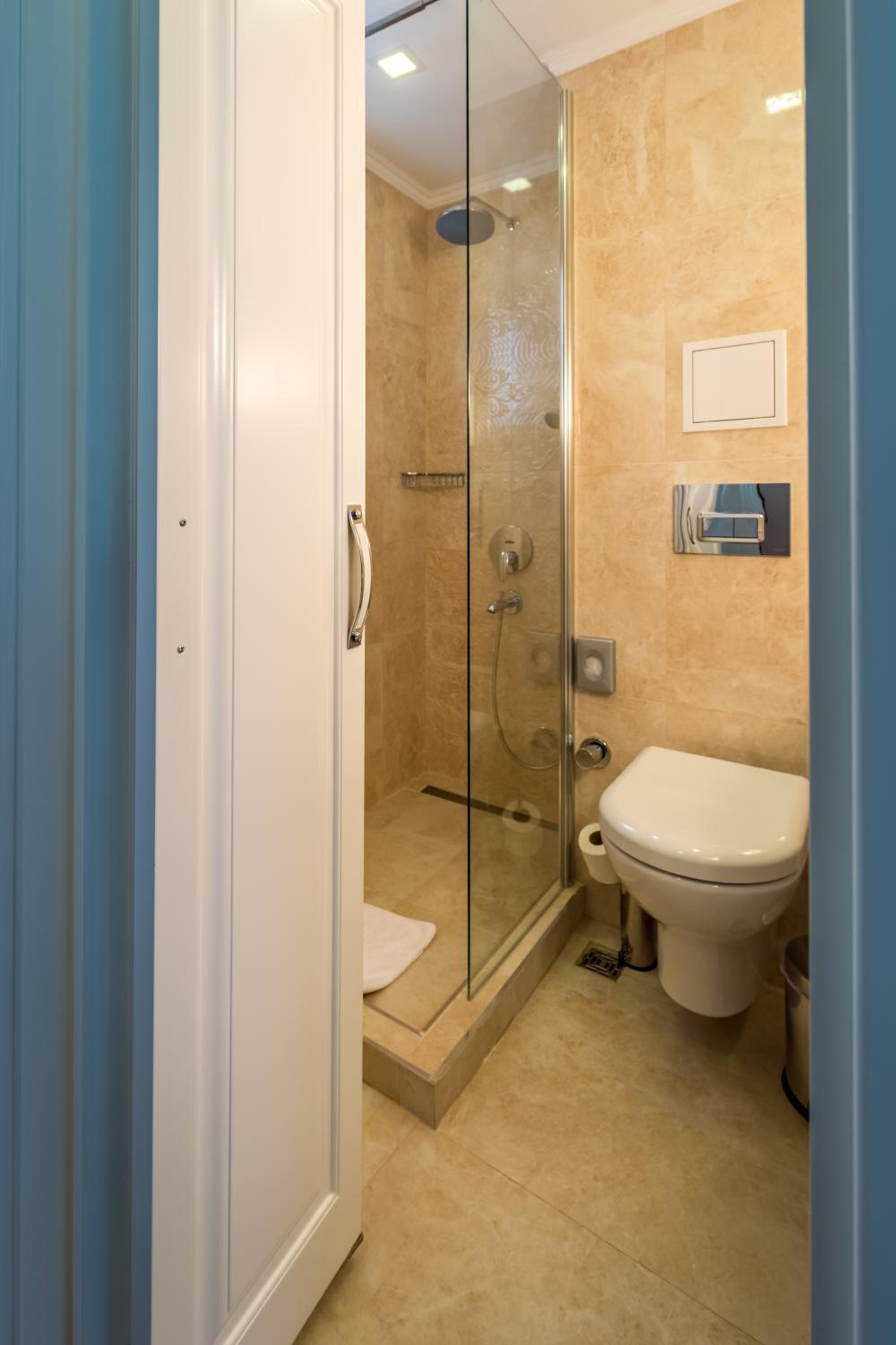 Banyoda duşakabin yarım, duş alırken suya dikkat etmek gerekiyor.